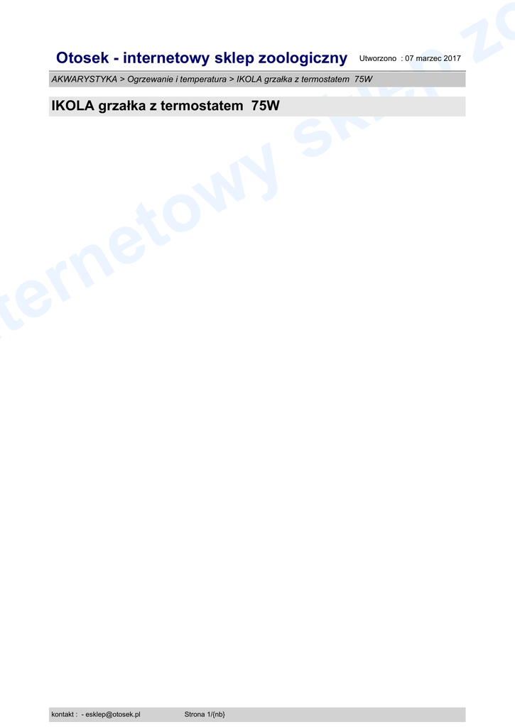 Otosek - internetowy sklep zoologiczny AKWARYSTYKA > Ogrzewanie i temperatura > IKOLA grzałka z termostatem 75W IKOLA grzałka z termostatem 75W y w to e n r e t n kontakt : - [email protected] Strona 1/{nb} p le Utworzono : 07 marzec 2017 k s o z Otosek - internetowy sklep zoologiczny AKWARYSTYKA > Ogrzewanie i temperatura > IKOLA grzałka z termostatem 75W IKOLA grzałka z termostatem 75W y w to IKOLA grzałka z termostatem 75W Producent : IKOLA Moc: 75W długość grzałki: 28cm p le Utworzono : 07 marzec 2017 k s e n r e t n przeznaczenie do akwarium: 60-90 l zakres regulacji termostatu: 16-32oC Automatyczne grzałki z termoregulacją to profesjonalne urządzenia przystosowane do pracy w całkowitym zanurzeniu. Posiadają łatwy i precyzyjny regulator temperatury, są bezpieczne i energooszczędne. Zbudowane z nowoczesnych materiałów, szkła antyudarowego, ceramiki wysokiej jakości, uszczelek silikonowych, wysokoopornych elementów grzewczych i mocnych przyssawek. Wyposażone są w diodową lampkę wskazującą załączanie grzania. całkowicie zanurzalna łatwa w regulacji temperatury podwójna uszczelka zapewniająca najwyższą szczelność lampka sygnalizacyjna (w czasie pracy zapala się dioda) prosta obsługa ceramiczny trzpień/rdzeń, odporny na wysokie temperatury osłona odporna na temperaturę i uszkodzenia, chroni szklaną obudowę oraz rdzeń mocne przyssawki, wykonane z wysokiej jakości plastiku, z dużą siłą trzymania i masywnym kształtem Grzałki IKOLA stosujemy w naszych akwariach i polecamy je z czystym sumieniem jako produkt o naprawdę wysokiej jakości. Cena : 35,00 zł Brutto ( 35,00 zł Netto) kontakt : - [email protected] Strona 2/{nb} o z Model : 001 Otosek - internetowy sklep zoologiczny AKWARYSTYKA > Ogrzewanie i temperatura > IKOLA grzałka z termostatem 75W IKOLA grzałka z termostatem 75W y w to Dostępność: Produkt dostępny w naszym sklepie od 22 maj 2014 e n r e t n kontakt : - [email protected] Strona 3/{nb} p le Utworzono : 07 marzec 2017 k s o z