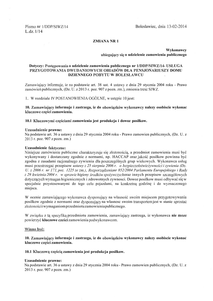Pismo nr l/DDP/SIWZ/14 L.dz. 1/14 Boleslawiec, dnia 13-02-2014 ZMIANA NR 1 Wykonawcy ubiegaj^cy si£ o udzielenie zamowienia publicznego Dotyczy: Postepowania o udzielenie zamowienia publicznego nr l/DDP/SIWZ/14- USLUGA PRZYGOTOWANIA DWUDANIOWYCH OBIADOW DLA PENSJONARIUSZY DOMU DZIENNEGO POBYTU W BOLESLAWCU Zamawiaj^cy informuje, iz na podstawie art. 38 ust. 4 ustawy z dnia 29 stycznia 2004 roku - Prawo zamowieri publicznych, (Dz. U. z 2013 r. poz. 907 z pozn. zm.), zmienia tresc SIWZ. 1 . W rozdziale IV POSTANOWIENIA OGOLNE, w uste_pie 10 jest: 10. Zamawiaj^cy informuje i zastrzega, iz do obowi^zkow wykonawcy nalezy osobiscie wykonac kluczowe cze^sci zamowienia. 10.1 Kluczowymi cz^sciami zamowienia jest produkcja i dowoz posilkow. Uzasadnienie prawne: Na podstawie art. 36 a ustawy z dnia 29 stycznia 2004 roku - Prawo zamowien publicznych, (Dz. U. z 2013 r. poz. 907 z pozn. zm.) Uzasadnienie faktyczne: Niniejsze zamowienie publiczne charakteryzuje si§ zlozonosciaj a przedmiot zamowienia musi bye wykonywany i dostarczany zgodnie z normami, np. HACCAP oraz jakosc posilkow powinna bye zgodna z zasadami racjonalnego zywienia dla poszczegolnych grup wiekowych. Wykonawca uslug musi przestrzegac przepisow ustawy z 25 sierpnia 2006 r. o bezpieczenstwie zywnosci i zywienia (Dz. U. z 2006 r. nr 171, poz. 1225 ze zm.), Rozporzqdzenia nr 852/2004 Parlamentu Europejskiego i Rady z 29 kwietnia 2004 r. w sprawie higieny srodkow spozywczych oraz innych przepisow szczegolowych dotycza^cych wymagan higienicznych i zdrowotnych zywnosci. Dowoz posilkow musi odbywac si^ w specjalnie przystosowanymi do tego celu pojazdami, na konkretna^ godzine^ i do wyznaczonego miejsca. W ocenie zamawiaja^cego wykonawca dysponuja_cy na wlasnosc swoim miejscem przygotowywania posilkow zgodnie z normami oraz dysponuja^cy na wlasnosc swoim transportem jest w stanie sprostac zlozonosci i wymaganiom przedmiotu zamowienia publicznego. W zwia^zku z ta^ specyfik^ przedmiotu zamowienia, zamawiaja^cy zastrzega, iz wykonawca nie moze powierzyc kluczowe czeici zamowienia podwykonawcom. Winno bye: 10. Zamawiaj^cy informuje i zastrzega, iz do obowi^zkow wykonawcy nalezy osobiscie wykonac kluczowe czesci zamowienia. 10.1 Kluczow^ czfsci^ zamowienia jest produkcja posilkow. Uzasadnienie prawne: Na podstawie art. 36 a ustawy z dnia 29 stycznia 2004 roku - Prawo zamowien publicznych, (Dz. U. z 2013 r. poz. 907 z pozn. zm.) Uzasadnienie faktyczne: Niniejsze zamowienie publiczne charakteryzuje si§ zlozonosciaj a przedmiot zamowienia musi bye wykonywany zgodnie z normami, a jakosc posilkow powinna bye zgodna z zasadami racjonalnego zywienia dla poszczegolnych grup wiekowych. Wykonawca usJug musi przestrzegac przepisow ustawy z 25 sierpnia 2006 r. o bezpieczenstwie zywnosci i zywienia (Dz. U. z 2006 r. nr 171, poz. 1225 ze zm.), Rozporzqdzenia nr 852/2004 Parlamentu Europejskiego i Rady z 29 kwietnia 2004 r. w sprawie higieny srodkow spozywczych oraz innych przepisow szczegolowych dotycz^cych wymagari higienicznych i zdrowotnych zywnosci. W ocenie zamawiaja_cego wykonawca dysponujajcy na wtasnosc swoim miejscem przygotowywania posiJkow zgodnie z normami i posiadaja^cy w zwia/ku z tym decyzje^ Paristwowego Powiatowego Inspektora Sanitarnego jest w stanie sprostac zlozonosci i wymaganiom przedmiotu zamowienia publicznego. W zwiajzku z ta^ specyfika^ przedmiotu zamowienia, zamawiaj^cy zastrzega, iz wykonawca nie moze powierzyc tej kluczowej cz^sci zamowienia podwykonawcom. 2. W rozdziale VI. WARUNKI UDZIALU W POST^POWANIU ORAZ OPIS SPOSOBU DOKONYWANIA OCENY SPELNIANIA TYCH WARUNKOW, w uste_pie 1.3 - dysponowanie odpowiednim potencjaJem technicznym, jest: - potwierdzenia spemiania tego warunku zamawiaja^cy dokona na podstawie wykazania przez wykonawc^ posiadania aktualnej decyzji Panstwowej Inspekcji Sanitarnej o dopuszczeniu srodka/6w transportu do przewozu posilkow. Winno bye: - potwierdzenia spemiania tego warunku Zamawiajajsy dokona na podstawie oswiadczenia wymienionego w ust. VII. 1 pkt 1 - zataeznik nr 1 do SIWZ; 3. W rozdziale VII. 1. - W zakresie wykazania spelniania przez wykonawc^ warunkow, o ktorych mowa w art. 22 ust. 1 ustawy Pzp do oferty nalezy dola^czyc -, zgodnie z powyzszym zamawiaj^cy wykresla ust^p 4 w brzmieniu - ,,Wykaz srodkow transportu doste/pnych Wykonawcy zgodnie z warunkami wskazanymi w rozdziale VI ust. 1.3 SIWZ, ktore b^da^ uzywane do realizacji zamowienia wraz z aktualnymi decyzjami Panstwowej Inspekcji Sanitarnej o dopuszczeniu srodka/6w transportu do przewozu posilkow - zalqcznik nr 3" Tym samym nie nalezy wypemiac i zaiqczac do oferty zataxznika nr 3 - Wykaz srodkow transportu. Wykonawcy w ofertach maja^ obowia^zek uwzgl^dnic zmiany SIWZ lub wyjasnienia jej tresci dokonane przez zamawiaja^cego, nawet jesli nie przybieraja^ one formy ,,modyfikacji lub zmiany SIWZ" opisanej przepisami ustawy Pzp. Powyzsza zmiana nr 1 prowadzi do zmiany tresci ogJoszenia. Termin i miejsce skiadania i otwarcia ofert pozostaje bez zmian. Zmiana nr 1 jest integralna^ cz^scii| SIWZ nr l/DDP/SIWZ/14. K ! E Pff W H I K Domu Daranego Pobytu 't/fa Zainaro
