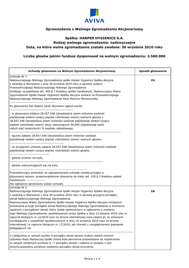 Sprawozdanie z Walnego Zgromadzenia Akcjonariuszy Spółka: HARPER HYGIENICS S.A. Rodzaj walnego zgromadzenia: nadzwyczajne Data, na która walne zgromadzenie zostało zwołane: 30 września 2010 roku Liczba głosów jakimi fundusz dysponował na walnym zgromadzeniu: 2.560.000 Uchwały głosowane na Walnym Zgromadzeniu Akcjonariuszy Uchwała Nr 1 Nadzwyczajnego Walnego Zgromadzenia spółki Harper Hygienics Spółka Akcyjna z siedzibą w Warszawie z dnia 30 września 2010 roku w sprawie wyboru Przewodniczącego Nadzwyczajnego Walnego Zgromadzenia Działając na podstawie art. 409 § 1 Kodeksu spółek handlowych, Nadzwyczajne Walne Zgromadzenie Spółki Harper Hygienics Spółka Akcyjna wybiera na Przewodniczącego Nadzwyczajnego Walnego Zgromadzenia Pana Marcina Macieszczaka. --------------------------------------Po głosowaniu Pan Robert Jacek Neymann ogłosił wyniki: ------------------------------------------------------- w głosowaniu oddano 28.657.548 (dwadzieścia osiem milionów sześćset pięćdziesiąt siedem tysięcy pięćset czterdzieści osiem) ważnych głosów z 28.657.548 (dwadzieścia osiem milionów sześćset pięćdziesiąt siedem tysięcy pięćset czterdzieści osiem) akcji, stanowiących 56,005 (pięćdziesiąt sześć całych pięć tysięcznych) % kapitału zakładowego, ------------------------------------------------------------------------------------------------ łącznie oddano 28.657.548 (dwadzieścia osiem milionów sześćset pięćdziesiąt siedem tysięcy pięćset czterdzieści osiem) ważnych głosów, ----------------------------------------------- za przyjęciem uchwały oddano 28.657.548 (dwadzieścia osiem milionów sześćset pięćdziesiąt siedem tysięcy pięćset czterdzieści osiem) głosów, ---------------------------------- głosów przeciw nie było, --------------------------------------------------------------------------------- głosów wstrzymujących się nie było. .................................................................................... Przewodniczący stwierdził, że zaproponowana uchwała została przyjęta w głosowaniu tajnym, przeprowadzonym stosownie do treści art. 420 § 2 Kodeksu spółek handlowych. ---------------Nie zgłoszono sprzeciwów wobec uchwały. Uchwała Nr 2 Nadzwyczajnego Walnego Zgromadzenia spółki Harper Hygienics Spółka Akcyjna z siedzibą w Warszawie z dnia 30 września 2010 roku w sprawie przyjęcia porządku obrad Nadzwyczajnego Walnego Zgromadzenia Nadzwyczajne Walne Zgromadzenie Spółki Harper Hygienics Spółka Akcyjna niniejszym postanawia przyjąć porządek obrad Nadzwyczajnego Walnego Zgromadzenia w brzmieniu zgodnym z porządkiem obrad, który został zamieszczony w ogłoszeniu o zwołaniu tego Walnego Zgromadzenia, opublikowanym przez Spółkę w dniu 23 sierpnia 2010 roku w raporcie bieżącym nr 12/2010 oraz na stronie internetowej www.cleanic.pl, ze zmianami wynikającymi z uzupełnień opublikowanych w dniu 10 września 2010 roku na stronie internetowej i w raporcie bieżącym nr 17/2010, jak również z uwzględnieniem poprawek polegających na: ----------------------------------------------------------------------------------------------------------1) połączeniu w ramach punktu 6 porządku obrad sprawy wyboru dwóch nowych członków Rady Nadzorczej Spółki (która była pierwotnie przewidziana do rozpatrzenia w ramach odrębnych punktów 6 i 7 porządku obrad) i nadanie w związku z tym dotychczasowemu punktowi szóstemu porządku obrad brzmienia: Strona 1 z 4 Sposób głosowania ZA ZA ---------------------------------------------------------------------?6. Podjęcie uchwał w sprawie wyboru nowych członków Rady Nadzorczej Spółki.", oraz 2) nadaniu dotychczasowym punktom ?8" i ?9" porządku obrad oznaczenia odpowiednio ?7" i ?8 -------------------------------------------------------------------------------------------------------------------------Po głosowaniu Przewodniczący ogłosił wyniki: -------------------------------------------------------------------- w głosowaniu oddano 28.657.548 (dwadzieścia osiem milionów sześćset pięćdziesiąt siedem tysięcy pięćset czterdzieści osiem) głosów ważnych głosów z 28.657.548 (dwadzieścia osiem milionów sześćset pięćdziesiąt siedem tysięcy pięćset czterdzieści osiem) akcji, stanowiących 56,005 (pięćdziesiąt sześć całych pięć tysięcznych) % kapitału zakładowego, ------------------------------------------------------------------------------------------------- łącznie oddano 28.657.548 (dwadzieścia osiem milionów sześćset pięćdziesiąt siedem tysięcy pięćset czterdzieści osiem) ważnych głosów, ----------------------------------------------- za przyjęciem uchwały oddano 28.657.548 (dwadzieścia osiem milionów sześćset pięćdziesiąt siedem tysięcy pięćset czterdzieści osiem) głosów, --------------------------------- głosów przeciw nie było, --------------------------------------------------------------------------------- głosów wstrzymujących się nie było. Uchwała Nr 3 Nadzwyczajnego Walnego Zgromadzenia spółki Harper Hygienics Spółka Akcyjna z dnia 30 września 2010 roku w sprawie sporządzania sprawozdań finansowych oraz skonsolidowanych sprawozdań finansowych zgodnie z Międzynarodowymi Standardami Rachunkowości (MSR) i Międzynarodowymi Standardami Sprawozdawczości Finansowej (MSSF) § INadzwyczajne Walne Zgromadzenie Harper Hygienics Spółka Akcyjna, działając na podstawie art. 45 ust. la i ust. lc oraz art. 55 ust. 5 ustawy z dnia 29 września 1994 r. o rachunkowości (Dz. U. Nr 152, poz. 1223 ze zm.) postanawia, że jednostkowe sprawozdania finansowe Harper Hygienics S.A. oraz skonsolidowane sprawozdania finansowe grupy kapitałowej Spółki będą sporządzane zgodnie z Międzynarodowymi Standardami Rachunkowości, Międzynarodowymi Standardami Sprawozdawczości Finansowej oraz związanymi z nimi interpretacjami ogłoszonymi w fo