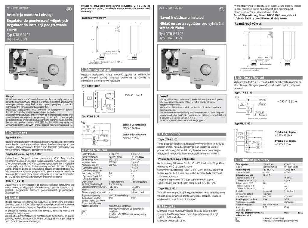 A075_U 468 931 002 997 Uwaga! W przypadku zastosowania regulatora DTR-E 3102 do podgrzewania rynien, urządzenie należy koniecznie zamontować na zewnątrz. Instrukcja montażu i obsługi Regulator do pomieszczeń wilgotnych Regulator do instalacji podgrzewania rynien Typ DTR-E 3102 Typ FTR-E 3121 A075_U 468 931 002 997 Návod k obsluze a instalaci Rysunek wymiarowy Hlídač mrazu a regulátor pro vyhřívání střešních žlabů Při montáži venku se doporučuje severní strana budovy. Jestliže to není možné, je nutné namontovat jako ochranu proti přímému slunečnímu záření clonicí plech. Pozor! Při použití regulátoru DTR-E 3102 pro vyhřívání střešních žlabů se provádí montáž vždy venku. Rozměrový výkres Typ DTR-E 3102 Typ FTR-E 3121 M 25x1,5 M 20x1,5 M 25x1,5 1 złącze kablowe dla kabli o średnicy 6 – 10,5 mm dostarczone luzem M 20x1,5 Zaslepovací zátky 1 kabelová průchodka pro průměr kabelu 6 – 10,5 mm volně přiložena 3. Schematy połączeń Wszystkie podłączenia należy wykonać zgodnie ze schematami przedstawionymi poniżej. Schematy drukowane są również na wewnętrznej stronie pokrywy regulatora. 3. Schéma připojení Vždy prosím dodržujte technická data na schématu zapojení na víku přístroje. Připojení proveďte podle následujících schémat zapojení: Typ DTR-E 3102 Typ DTR-E 3102 Uwaga! Urządzenie może zostać zainstalowane, podłączone wyłącznie przez elektryka z uprawnieniami, zgodnie zr schematem połączeń, znajdującym się na pokrywie obudowy. Podczas wykonywania powyższych czynności należy przestrzegać przepisów bezpieczeństwa. Możliwości zastosowania oraz wartości, w szczególności danych technicznych, zostały podane w naszych prospektach. Regulator temperatury jest przystosowany do montażu niezależnego oraz przeznaczony do regulacji temperatury w suchych i zamkniętych pomieszczeniach, w których panują normalne warunki eksploatacyjne. Dodatkowo, zgodnie z normą VDE 0875 lub EN 55014 urządzenie nie wytwarza zakłóceń radiowych i pracuje zgodnie z sposobem działania 1C. 250V AC, 16 (4) A Zacisk 1–3: chłodzenie 250V AC, 5 (2) A Nastawnikiem „Temp(+)” ustaw temperaturę +5°C. Przy spadku temperatury poniżej 4°C zostanie załączona grzałka. Nastawnikiem „Temp (-)” ustaw temperaturę -5°C. Przy spadku temperatury poniżej -5°C grzałka zostanie wyłączona. Poniżej tej temperatury zarówno lód jak i śnieg są „suche”. Śnieg nie będzie się roztapiał i nie będzie powodował oblodzenia. Gdy temperatura wzrośnie powyżej -4°C, grzałka zostanie powtórnie załączona. Ogrzewanie rynny będzie odbywało się w zakresie temperatur od -5°C do +5°C eliminując tym samym problem oblodzenia. Typy FTR-E 3121 Urządzenia te są przeznaczone do regulacji układów ogrzewania lub wentylatorów, w wilgotnych lub zakurzonych pomieszczeniach, np. garażach, magazynach, pralniach, pomieszczeniach gospodarczych, szklarniach itd. 2. Montaż Miejsce montażu urządzenia ma zapewniać nieograniczoną cyrkulację powietrza oraz chronić urządzenie przez stałymi podmuchami powietrza lub promieniowaniem cieplnym. Wysokość montażowa: ok. 1,5 m. W przypadku montażu urządzenia na zewnątrz, zaleca się montaż od strony północnej budynku. W przypadku, gdy niemożliwy jest montaż urządzenia od północnej strony budynku, należy zamontować blachę osłaniającą, chroniącą urządzenie przed promieniowaniem słonecznym. 4. Dane techniczne Numer artykułu Numer referencyjny Zakres temperatury Napięcie robocze Przełączany prąd przy Ogrzewaniu (zacisk 1-2) Chłodzeniu (zacisk 1-3) Moc przełączana (kW) Ogrzewaniu (zacisk 1-2) Chłodzeniu (zacisk 1-3) Układ styków (Zestyk szybkodziałający) Dopuszczalna temperatura (°C) Histereza Termiczne sprężenie zwrotne Regulacja temperatury Klasa ochrony obudowy zgodnie z normą DIN 40050 Dopusczalna wilgotność wzgęldna otoczenia Ö DTR-E 3102 191590190900 –20 ... 25°C 230V AC 250 V AC – – 3,6 – – 1 zestyk rozwierny 1 zestyk zwierny –25… 55°C 1-3K – pod pokrywą obudowy IP 65 FTR-E 3121 191570159900 –20 ... 35°C 230V AC 16 (4) A – 16 (4) A 5 (2) A – 3,6 1,1 1 zestyk przełączny –25… 55°C 1-3K zależne od serii IP 65 maks. 95%, bez kondensacji Prawidłowo wbudowane lub zamontowane urządzenie (zgodnie z VDE 0100) spełnia wymogi normy austriackiej. ~ 250 V 16 (4) A Typ FTR-E 3121 Zacisk 1–2: ogrzewanie 250V AC, 16 (4) A Typ DTR-E 3102 Przykład działania: typ DTR-E 3102 Přístroj smí instalovat nebo zasadit jen kvalifikovaný pracovník podle schématu zapojení na víku. Přitom je nutné dodržovat platné bezpečnostní předpisy. Možnosti použití a dimenzování, zejména technická data najdete v našem prospektu. Tento samostatně montovatelný prostorový termostat slouží k regulaci teploty v suchých a uzavřených místnostech v běžném prostředí. Přístroj je odrušen v souladu s VDE 0875 nebo EN 55014 a jeho funkční charakteristika je typu 1C. Typ FTR-E 3121 1. Zastosowanie Regulator ten przeznaczony jest do zastosowania w instalacjach podgrzewania rynien. Regulacja temperatury odbywa się w zakresie ustalanym przez dwa niezależne układy pomiarowe: „Temp(-)” oraz „Temp(+)”. Grzałka załączana jest w przypadku wystąpienia zagrożenia oblodzenia. Pozor! Svorka 1–2: Topení ~ 250 V 16 (4) A 1. Účel použití Typu DTR-E 3102 Svorka 1–3: Topení ~ 250 V 5 (2) A Tento přístroj se používá k regulaci vyhřívání střešních žlabů za účelem snížení nákladů. Kritický rozsah teploty se určuje pomocí dvou regulátorů tak, aby bylo topení v provozu jen tehdy, jestliže opravdu hrozí nebezpečí zamrznutí vlhkosti. Příklad funkce typu DTR-E 3102 Nastavení regulátoru na "tepl (+)": +5°C (nad tání). Při poklesu teploty na +4°C se topení zapne. Nastavení regulátoru na "tepl (-)": -5°C. Při poklesu teploty se topení 