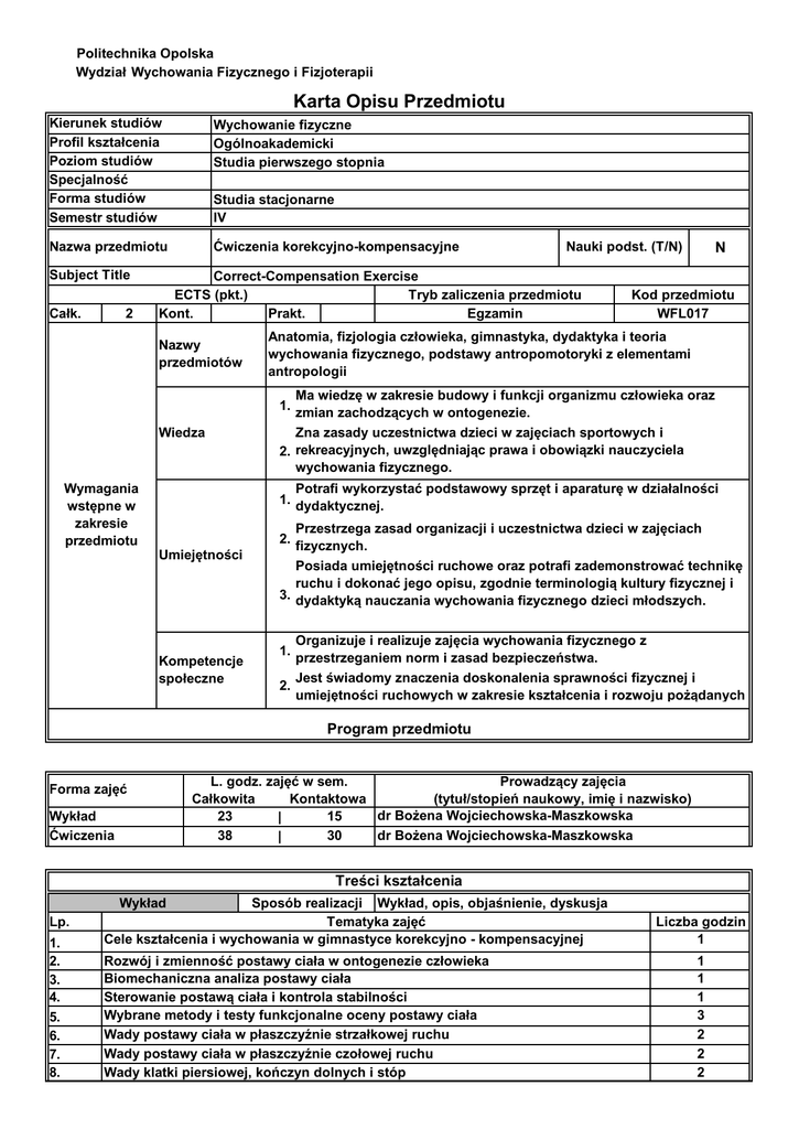 Politechnika Opolska Wydział Wychowania Fizycznego i Fizjoterapii Karta Opisu Przedmiotu Kierunek studiów Profil kształcenia Poziom studiów Specjalność Forma studiów Semestr studiów Wychowanie fizyczne Ogólnoakademicki Studia pierwszego stopnia Nazwa przedmiotu Ćwiczenia korekcyjno-kompensacyjne Subject Title Całk. 2 Studia stacjonarne IV Nauki podst. (T/N) Correct-Compensation Exercise ECTS (pkt.) Tryb zaliczenia przedmiotu Kont. Prakt. Egzamin Nazwy przedmiotów N Kod przedmiotu WFL017 Anatomia, fizjologia człowieka, gimnastyka, dydaktyka i teoria wychowania fizycznego, podstawy antropomotoryki z elementami antropologii Ma wiedzę w zakresie budowy i funkcji organizmu człowieka oraz zmian zachodzących w ontogenezie. Zna zasady uczestnictwa dzieci w zajęciach sportowych i 2. rekreacyjnych, uwzględniając prawa i obowiązki nauczyciela wychowania fizycznego. 1. Wiedza Wymagania wstępne w zakresie przedmiotu Potrafi wykorzystać podstawowy sprzęt i aparaturę w działalności 1. dydaktycznej. Przestrzega zasad organizacji i uczestnictwa dzieci w zajęciach fizycznych. Posiada umiejętności ruchowe oraz potrafi zademonstrować technikę ruchu i dokonać jego opisu, zgodnie terminologią kultury fizycznej i 3. dydaktyką nauczania wychowania fizycznego dzieci młodszych. 2. Umiejętności Kompetencje społeczne Organizuje i realizuje zajęcia wychowania fizycznego z przestrzeganiem norm i zasad bezpieczeństwa. Jest świadomy znaczenia doskonalenia sprawności fizycznej i 2. umiejętności ruchowych w zakresie kształcenia i rozwoju pożądanych 1. Program przedmiotu Forma zajęć Wykład Ćwiczenia L. godz. zajęć w sem. Prowadzący zajęcia Całkowita Kontaktowa (tytuł/stopień naukowy, imię i nazwisko) dr Bożena Wojciechowska-Maszkowska 23 15 | dr Bożena Wojciechowska-Maszkowska 38 30 | Treści kształcenia Wykład Lp. 1. 2. 3. 4. 5. 6. 7. 8. Sposób realizacji Wykład, opis, objaśnienie, dyskusja Tematyka zajęć Cele kształcenia i wychowania w gimnastyce korekcyjno - kompensacyjnej Rozwój i zmienność postawy ciała w ontogenezie człowieka Biomechaniczna analiza postawy ciała Sterowanie postawą ciała i kontrola stabilności Wybrane metody i testy funkcjonalne oceny postawy ciała Wady postawy ciała w płaszczyźnie strzałkowej ruchu Wady postawy ciała w płaszczyźnie czołowej ruchu Wady klatki piersiowej, kończyn dolnych i stóp Liczba godzin 1 1 1 1 3 2 2 2 Pływanie i ćwiczenia korekcyjne w wodzie 9. 10. Egzamin L. godz. pracy własnej studenta 8 L. godz. kontaktowych w sem. Sposoby sprawdzenia zamierzonych Kolokwium, egzamin pisemny efektów kształcenia 1 1 15 Ćwiczenia Sposób realizacji Sale ćwiczeniowe: pokaz, projekty, dyskusja Lp. Tematyka zajęć Liczba godzin 1. Organizacja i zasady realizacji gimnastyki korekcyjnej w przedszkolu i w szkole 1 2. Badanie podmiotowe i przedmiotowe: ocena wzrokowa i warunki obserwacji 2 3. Wybrane metody i testy funkcjonalne oceny postawy ciała: pomiar ruchomości 4 4. Systematyka ćwiczeń i pozycje ćwiczebne w gimnastyce korekcyjno2 5. Metodyka ćwiczeń - plecy okrągłe: ćwiczenia reedukacji posturalnej i rozciągajace 3 6. Metodyka ćwiczeń - plecy wklęsłe: ćwiczenia reedukacji posturalnej i rozciągające 3 7. Metodyka ćwiczeń - plecy okrągło - wklęsłe 3 8. Metodyka ćwiczeń - plecy płaskie 2 9. Gimnastyka korekcyjna w okresie obserwacyjnym skoliozy czynnościowej i 3 10. Metodyka ćwiczeń w wadach klatki piersiowej 2 11. Metodyka ćwiczeń kończyn dolnych kolana: koślawe, szpotawe 2 12. Metodyka ćwiczeń wysklepiających stopę 2 13. Zaliczenie 1 L. godz. pracy własnej studenta 8 L. godz. kontaktowych w sem. 30 Obserwacja aktywności na zajęciach ruchowych, ocena z realizacji Sposoby sprawdzenia zamierzonych ćwiczeń, identyfikacja błędów i jej korekcja, metoda i forma rozwiązania sytuacji problemowej, kolokwium i zaliczenie praktyczne. efektów kształcenia Wiedza Potrafi opisać i zinterpretować podstawowe metody oceny 1. postawy ciała człowieka z uwzględnieniem okresów rozwojowych oraz zna metodykę korekcji wad postawy ciała. Ma wiedzę o przyczynach rozwoju wad postawy ciała i ich 2. zdrowotnych skutkach oraz rozumie znaczenie profilaktyki w zakresie kształcenia i rozwijania pożądanych postaw i Zna organizacyjny system przeciwdziałania wadom postawy i 3. elementy higienicznego trybu życia. Zna fizjologiczne mechanizmy rozwoju prawidłowej postawy ciała w ontogenezie i jej cechy. Potrafi posługiwać się podstawowymi metodami i technikami 1. badawczymi w diagnozowaniu postawy ciała dziecka, sprawności fizycznej i wiedzy. Przestrzega zasad indywidualizacji programu ćwiczeń korekcyjno-kompensacyjnych i poprawnie dobiera ćwiczenia 2. w zależności od rodzaju wady postawy, rozwoju osobniczego oraz umiejętności. 3. Identyfikuje i koryguje nieprawidłowości w postawie ciała. Przestrzega zasad organizacji i uczestnictwa w zajęciach dydaktycznych oraz stwarza atmosferę przyjemną i przyjazną. Posiada umiejętności ruchowe i poprawnie je demonstruje 4. adekwatnie do celu ćwiczeń korekcyjnych oraz objaśnia technikę ruchu zgodnie z terminologią nauk o kulturze fizycznej. Ma poczucie odpowiedzialności za uczestników zajęć 1. korekcyjnych i indywidualnie akcentuje pozytywne uwagi i dowartościowuje. 4. Efekty kształcenia dla przedmiotu - po zakończonym cyklu kształcenia Umiejętności Kompetencje społeczne Kompetencje społeczne Rozwija odwagę i samodyscyplinę oraz przestrzega zasad etycznych i wzajemnej asekuracji. Rozwija odwagę i samodyscyplinę oraz przestrzega zasad etycznych i wzajemnej 2. asekuracji. Ma świadomość konieczności konsultacji oraz podnoszenia swoich kompetencji w zakresie wiedzy. Metody dydaktyczne: 1) Podająca: wykład, opis, dyskusja, objaśnienie. 2) Problemowa: aktywizujaca - dyskusja. 3) Praktyczna: pokaz, ćwiczenia, identyfikacja błędów, rozwiązywanie problemów Forma i warunki zaliczenia przedmiotu: K