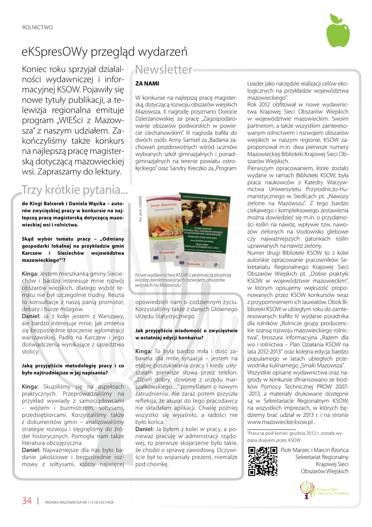 Rolnictwo ekspresowy przegląd wydarzeń Koniec roku sprzyjał działal- Newsletter Trzy krótkie pytania... do Kingi Balcerek i Daniela Wąsika – autorów zwycięskiej pracy w konkursie na najlepszą pracę magisterską dotyczącą mazowieckiej wsi i rolnictwa. ZA NAMI W konkursie na najlepszą pracę magisterską, dotyczącą rozwoju obszarów wiejskich Mazowsza, II nagrodę przyznano Dorocie Dzierżanowskiej za pracę „Zagospodarowanie obszarów podworskich w powiecie ciechanowskim”. III nagroda trafiła do dwóch osób: Anny Samsel za „Badania zachowań prozdrowotnych wśród uczniów wybranych szkół gimnazjalnych i ponadgimnazjalnych na terenie powiatu ostrołęckiego” oraz Sandry Kreczko za „Program Fot. arch. UMWM ności wydawniczej i informacyjnej KSOW. Pojawiły się nowe tytuły publikacji, a telewizja regionalna emituje program „WIEŚci z Mazowsza” z naszym udziałem. Zakończyliśmy także konkurs na najlepszą pracę magisterską dotyczącą mazowieckiej wsi. Zapraszamy do lektury. Skąd wybór tematu pracy – „Odmiany gospodarki lokalnej na przykładzie gmin Karczew i Sieciechów województwa mazowieckiego”1? Kinga: Jestem mieszkanką gminy Sieciechów i bardzo interesuje mnie rozwój obszarów wiejskich, dlatego wybór tematu nie był szczególnie trudny. Reszta to konsultacje z naszą panią promotor, debaty i burze mózgów. Daniel: Ja z kolei jestem z Warszawy, ale bardzo interesuje mnie, jak zmienia się bezpośrednie otoczenie aglomeracji warszawskiej. Padło na Karczew i jego doświadczenia wynikające z sąsiedztwa stolicy. Jaką przyjęliście metodologię pracy i co było najtrudniejsze w jej napisaniu? Kinga: Skupiliśmy się na aspektach praktycznych. Przeprowadzaliśmy na przykład wywiady z samorządowcami – wójtem i burmistrzem, sołtysami, przedsiębiorcami. Korzystaliśmy także z dokumentów gmin – analizowaliśmy strategie rozwoju i sięgnęliśmy do źródeł historycznych. Pomogła nam także literatura obcojęzyczna. Daniel: Najważniejsze dla nas było badanie jakościowe i bezpośrednie rozmowy z sołtysami, którzy najwięcej 34 KRONIKA MAZOWIECKA NR 1 (119) 2013 ROK Nowe wydawnictwa KSOW z pewnością poszerzą wiedzę zainteresowanych rozwojem obszarów wiejskich na Mazowszu opowiedzieli nam o codziennym życiu. Korzystaliśmy także z danych Głównego Urzędu Statystycznego. Jak przyjęliście wiadomość o zwycięstwie w ostatniej edycji konkursu? Kinga: To była bardzo miła i dość zabawna dla mnie sytuacja – jestem na etapie poszukiwania pracy i kiedy usłyszałam pierwsze słowa przez telefon: „Dzień dobry, dzwonię z urzędu marszałkowskiego…” pomyślałam o nowym zatrudnieniu. Ale zaraz potem przyszła refleksja, że akurat do tego pracodawcy nie składałam aplikacji. Chwilę później wszystko się wyjaśniło, a radości nie było końca. Daniel: Ja byłem z kolei w pracy, a ponieważ pracuję w administracji rządowej, to pierwsze skojarzenie było takie, że chodzi o sprawę zawodową. Oczywiście był to wspaniały prezent, niemalże pod choinkę. Leader jako narzędzie realizacji celów ekologicznych na przykładzie województwa mazowieckiego”. Rok 2012 obfitował w nowe wydawnictwa Krajowej Sieci Obszarów Wiejskich w województwie mazowieckim. Swoim partnerom, a także wszystkim zainteresowanym rolnictwem i rozwojem obszarów wiejskich w naszym regionie, KSOW zaproponował m.in. dwa pierwsze numery Mazowieckiej Biblioteki Krajowej Sieci Obszarów Wiejskich. Pierwszym opracowaniem, które zostało wydane w ramach Biblioteki KSOW, była praca naukowców z Katedry Warzywnictwa Uniwersytetu Przyrodniczo-Humanistycznego w Siedlcach pt. „Nawozy zielone na Mazowszu”. Z tego bardzo ciekawego i kompleksowego zestawienia można dowiedzieć się m.in. o przydatności roślin na nawóz, wpływie tzw. nawozów zielonych na środowisko glebowe czy najważniejszych gatunkach roślin uprawianych na nawóz zielony. Numer drugi Biblioteki KSOW to z kolei autorskie opracowanie pracowników Sekretariatu Regionalnego Krajowej Sieci Obszarów Wiejskich pt. „Dobre praktyki KSOW w województwie mazowieckim”, w którym opisujemy większość proponowanych przez KSOW konkursów wraz z przypomnieniem ich laureatów. Obok Biblioteki KSOW w ubiegłym roku do zainteresowanych trafiło IV wydanie poradnika dla rolników „Rolnicze grupy producenckie szansą rozwoju mazowieckiego rolnictwa”, broszura informacyjna „Razem dla wsi i rolnictwa – Plan Działania KSOW na lata 2012-2013” oraz kolejna edycja bardzo popularnego w latach ubiegłych przewodnika kulinarnego „Smaki Mazowsza”. Wszystkie opisane wydawnictwa oraz nagrody w konkursie sfinansowano ze środków Pomocy Technicznej PROW 2007-2013, a materiały drukowane dostępne są w Sekretariacie Regionalnym KSOW, na wszystkich imprezach, w których będziemy brać udział w 2013 r. i na stronie www.mazowieckie.ksow.pl . 1 Praca ta pod koniec grudnia 2012 r. została wydana drukiem przez KSOW. Piotr Marzec i Marcin Rzońca Sekretariat Regionalny Krajowej Sieci Obszarów Wiejskich