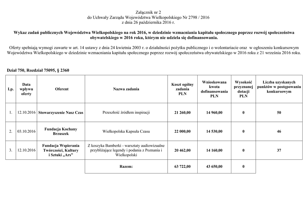 Załącznik nr 2 do Uchwały Zarządu Województwa Wielkopolskiego Nr 2798 / 2016 z dnia 26 października 2016 r. Wykaz zadań publicznych Województwa Wielkopolskiego na rok 2016, w dziedzinie wzmacniania kapitału społecznego poprzez rozwój społeczeństwa obywatelskiego w 2016 roku, którym nie udziela się dofinansowania. Oferty spełniają wymogi zawarte w art. 14 ustawy z dnia 24 kwietnia 2003 r. o działalności pożytku publicznego i o wolontariacie oraz w ogłoszeniu konkursowym Województwa Wielkopolskiego w dziedzinie wzmacniania kapitału społecznego poprzez rozwój społeczeństwa obywatelskiego w 2016 roku z 21 września 2016 roku. Dział 750, Rozdział 75095, § 2360 Lp. Data wpływu oferty Oferent Nazwa zadania Koszt ogólny zadania PLN Wnioskowana kwota dofinansowania PLN Wysokość przyznanej dotacji PLN Liczba uzyskanych punktów w postępowaniu konkursowym Przeszłość źródłem inspiracji 21 260,00 14 960,00 0 50 1. 12.10.2016 Stowarzyszenie Nasz Czas 2. 03.10.2016 Fundacja Kochany Brzuszek Wielkopolska Kapsuła Czasu 22 000,00 14 530,00 0 46 3. 12.10.2016 Fundacja Wspierania Twórczości, Kultury i Sztuki „Ars” Z koszyka Bamberki - warsztaty audiowizualne przybliżające legendy i podania z Poznania i Wielkopolski 20 462,00 14 160,00 0 37 Razem: 63 722,00 43 650,00 0