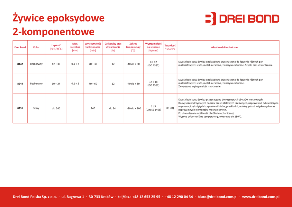 Żywice epoksydowe 2-komponentowe Drei Bond Kolor Lepkość [Pa•s/25oC] Max. szczelina [mm] Wytrzymałość funkcjonalna [min] Całkowity czas utwardzania [h] Zakres temperatury [oC] Wytrzymałość na ścinanie [N/mm2] 8142 Bezbarwny 12 ÷ 30 0,1 ÷ 2 20 ÷ 30 12 -40 do + 80 8 ÷ 12 (ISO 4587) Dwuskładnikowa żywica epoksydowa przeznaczona do łączenia różnych par materiałowych: szkło, metal, ceramika, tworzywa sztuczne. Szybki czas utwardzania. 8544 Bezbarwny 10 ÷ 24 0,1 ÷ 2 40 ÷ 60 12 -40 do + 80 14 ÷ 18 (ISO 4587) Dwuskładnikowa żywica epoksydowa przeznaczona do łączenia różnych par materiałowych: szkło, metal, ceramika, tworzywa sztuczne. Zwiększona wytrzymałość na ścinanie. 8231 Szary ok. 240 240 do 24 -20 do + 200 11,5 (DIN ES 1465) Twardość o Shore’a 85 (D) Właściwości techniczne Dwuskładnikowa żywica przeznaczona do regeneracji ubytków metalowych. Do wysokowytrzymałych napraw części stalowych i żeliwnych, napraw wad odlewniczych, regeneracji pękniętych korpusów silników, przekładni, wałów, gniazd łożyskowych oraz napraw innych elementów mechanicznych. Po utwardzeniu możliwość obróbki mechanicznej. Wysoka odporność na temperaturę, okresowo do 280oC. Drei Bond Polska Sp. z o.o. · ul. Bagrowa 1 · 30-733 Kraków · tel/fax.: +48 12 653 25 95 · +48 12 290 04 34 · [email protected] · www.dreibond.com.pl
