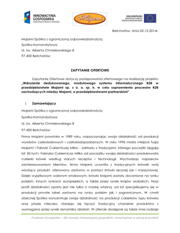 Bełchatów, dnia 02.12.2014r. Majami Spółka z ograniczoną odpowiedzialnością Spółka Komandytowa Ul. św. Alberta Chmielowskiego 8 97-400 Bełchatów ZAPYTANIE OFERTOWE Zapytanie Ofertowe dotyczy postępowania ofertowego na realizację projektu „Wdrożenie dedykowanego, modułowego systemu informatycznego B2B w przedsiębiorstwie Majami sp. z o. o. sp. k. w celu usprawnienia procesów B2B zachodzących miedzy Majami, a przedsiębiorstwami partnerskimi” I. Zamawiający Majami Spółka z ograniczoną odpowiedzialnością Spółka Komandytowa Ul. św. Alberta Chmielowskiego 8 97-400 Bełchatów Firma Majami powstała w 1989 roku, rozpoczynając swoja działalność od produkcji wyrobów czekoladowych i czekoladopodobnych. W roku 1996 miała miejsce fuzja Majami i Fabryki Cukierniczej Milko - zakładu z tradycjami, którego początki sięgają lat 50-tych. Fabryka Cukiernicza Milko od początku swojej działalności produkowała cukierki krówki według starych receptur i technologii. Wychodząc naprzeciw zainteresowaniom klientów, firma Majami uczyniła z tradycyjnych krówek swój wiodący produkt, oferowany zarówno w postaci krówki ręcznej jak i maszynowej. Dzięki wyjątkowym walorom smakowym, krówki Majami zostały docenione na rynku polskim, innych rynkach europejskich, a także przez rynek krajów arabskich. Nasz profil działalności oparty jest nie tylko o markę własną, od lat specjalizujemy się w produkcji private label zarówno na rynku polskim jak i zagranicznym. W chwili obecnej Spółka koncentruje swoja działalność na produkcji cukierków typu krówka oraz ptasie mleczko, starając się łączyć tradycyjny charakter produktów z wymagana przez rynek dynamika działań. W ofercie dostępne są także inne rodzaje Fundusze Europejskie – dla rozwoju innowacyjnej gospodarki. Inwestujemy w waszą przyszłość produktów, takie jak galaretki w czekoladzie, pianko-galaretki, sosy i kremy do deserów, cukierki typu toffi. Sprzedaż odbywa się w kanale tradycyjnym, w sieciach (takich jak Carrefour, E.Leclerc, Aldi, Makro Cash, Sedal), oraz na rynkach zagranicznych w takich krajach jak Niemcy, Francja, Finlandia, Anglia kraje arabskie. Jesteśmy jedynym zakładem w Polsce produkującym prawie 100 ton krówki ręcznej w ciągu miesiąca. II. Przedmiot zamówienia W związku z realizacją projektu który polega na opracowaniu i wdrożeniu dedykowanego systemu B2B, który usprawni działanie przedsiębiorstwa Majami w zakresie procesów zewnętrznych takich jak : Sprzedaż, Dystrybucja, Marketing i promocja oraz Zaopatrzenie składamy zapytanie na: Zakup panela magazynowego (model: PPC-6170-RC8AE jedna sztuka sztuki) Zakup laptopów mobilne model HP ProBook 450 I3 15,6” (5 sztuk) Planowana realizacja od 02.12.2014r. od 30.12.2014r. Szczegółowych informacji na temat przedmiotu zamówienia udziela Pani Agnieszka Grzywacz, tel. 44 634 83 31 wew 43 III. Składanie ofert częściowych Nie jest dopuszczane. IV. Możliwość podwykonawstwa Zamawiający dopuszcza możliwość zlecenie części lub całości zamówienia podwykonawcom. V. Przygotowanie oferty Oferta powinna zawierać : datę sporządzenia i datę ważności, adres lub siedzibę oferenta, nr NIP oferenta, Fundusze Europejskie – dla rozwoju innowacyjnej gospodarki. Inwestujemy w waszą przyszłość cenę netto zamówienia, podpis i pieczęć oferenta. Oferta może być sporządzona na Załączniku nr 1. VI. Kryteria oceny ofert Zamawiający dokona wyboru ofert na podstawie porównania cen. Kryterium cena 100%. VII. Wycofanie oferty Oferent przed datą wyboru dostawcy może zmienić lub wycofać swoją ofertę. VIII. Miejsce i termin składania ofert 1. Oferta może być dostarczona za pośrednictwem: poczty, kurierem lub osobiście: Ul. św. Alberta Chmielowskiego 8 97-400 Bełchatów poczty elektronicznej na adres e-mail: [email protected] 2. Wybór oferenta nastąpi w dniu 15.12.2014r. o godzina 16.00 3. Oferty należy składać do dnia 13.12.2014r. do godziny 12.00 4. Oferty złożone po terminie wskazanym w pkt. 3 nie będą rozpatrywane IX. Kontakt w sprawie postępowania ofertowego Dodatkowych informacji dotyczących postępowania oraz przedmiotu zamówienia udziela Pani Agnieszka Grzywacz, tel. 44 634 83 31 wew.43 Fundusze Europejskie – dla rozwoju innowacyjnej gospodarki. Inwestujemy w waszą przyszłość ZAŁĄCZNIK nr 1 Dotyczy postępowania ofertowego na realizację projektu „Wdrożenie dedykowanego, modułowego systemu informatycznego B2B w przedsiębiorstwie Majami sp. z o. o. sp. k. w celu usprawnienia procesów B2B zachodzących miedzy Majami, a przedsiębiorstwami partnerskimi” Dane oferenta: Nazwa oferenta: ……………………………………………………………………………….. Adres/ siedziba firmy: ………………………………………………………………………… NIP:…………………………………………………………………………………………….. OFERTA: Wyszczególnienie zakupu Zakup panela magazynowego (model: PPC-6170-RC8AE jedna sztuka sztuki) Zakup laptopów mobilne model HP ProBook 450 I3 15,6” (5 sztuk) RAZEM Cena Łączna cena oferty: …………………………………………………………………… Dane osoby do kontaktu w sprawie oferty: Imię, nazwisko …………………………………………………………………………………. Numer telefonu: ………………………………………………………..………………………. Adres e-mail: ………………………………………..……………………….…………………. Data sporządzenia…………………………………………… Data ważności oferty:.……………………………………… Fundusze Europejskie – dla rozwoju innowacyjnej gospodarki. Inwestujemy w waszą przyszłość
