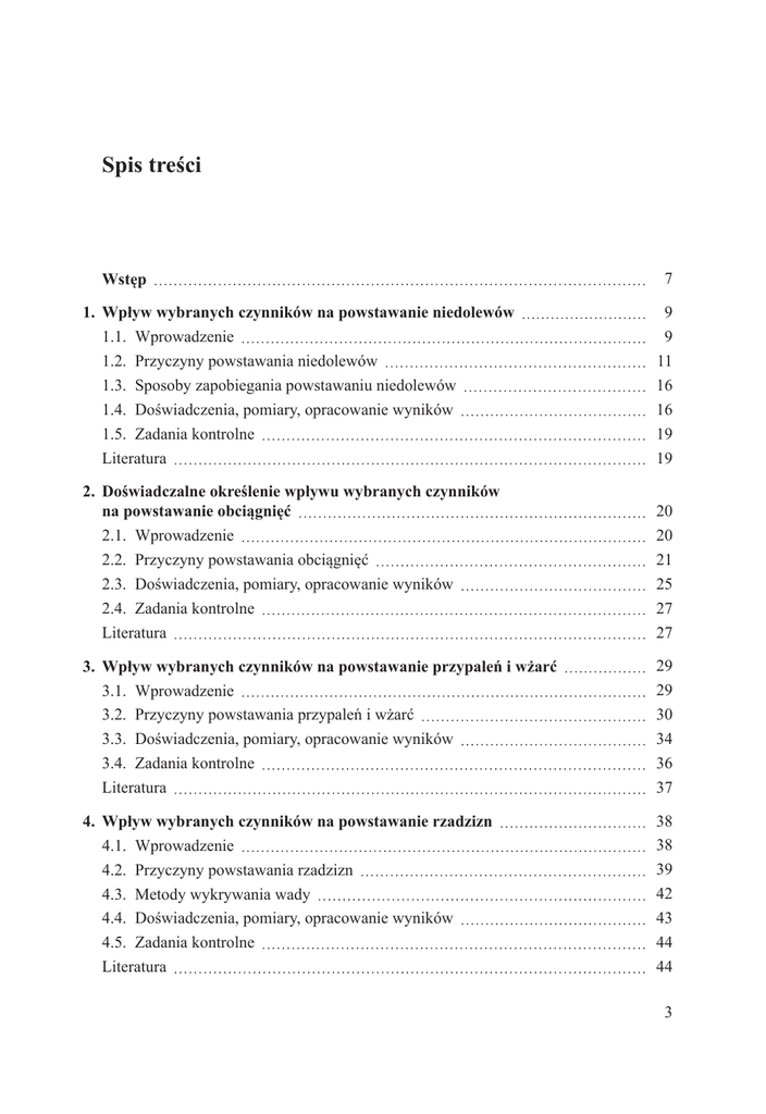 Spis treści Wstęp 7 1.Wpływ wybranych czynników na powstawanie niedolewów 1.1.Wprowadzenie 1.2. Przyczyny powstawania niedolewów 1.3. Sposoby zapobiegania powstawaniu niedolewów 1.4. Doświadczenia, pomiary, opracowanie wyników 1.5. Zadania kontrolne Literatura 9 9 11 16 16 19 19 2.Doświadczalne określenie wpływu wybranych czynników na powstawanie obciągnięć 2.1. Wprowadzenie 2.2. Przyczyny powstawania obciągnięć 2.3.Doświadczenia, pomiary, opracowanie wyników 2.4. Zadania kontrolne Literatura 20 20 21 25 27 27 3.Wpływ wybranych czynników na powstawanie przypaleń i wżarć 3.1.Wprowadzenie 3.2.Przyczyny powstawania przypaleń i wżarć 3.3. Doświadczenia, pomiary, opracowanie wyników 3.4. Zadania kontrolne Literatura 29 29 30 34 36 37 4.Wpływ wybranych czynników na powstawanie rzadzizn 4.1. Wprowadzenie 4.2. Przyczyny powstawania rzadzizn 4.3. Metody wykrywania wady 4.4. Doświadczenia, pomiary, opracowanie wyników 4.5. Zadania kontrolne Literatura 38 38 39 42 43 44 44 3 5.Chropowatość powierzchni odlewów: wpływ czynników technologicznych, metody pomiarów 5.1.Wprowadzenie 5.2.Wpływ czynników technologicznych na chropowatość powierzchni odlewów 5.2.1. Zjawisko filtracji i wnikania metalu w pory masy formierskiej 5.2.2. Wpływ czynników technologicznych 5.3.Pomiary chropowatości 5.3.1.Podstawowe pojęcia 5.3.2.Wskaźniki (parametry) chropowatości 5.3.3.Metody pomiaru chropowatości powierzchni odlewów 5.4.Cel, zakres i przebieg ćwiczenia 5.5.Wykonanie sprawozdania 5.6.Zadania kontrolne Literatura 6.Zastosowanie analizy termicznej do kontroli jakości stopów odlewniczych 6.1. Wprowadzenie 6.2. Metody analizy termicznej 6.3. Aparatura pomiarowa stosowana w analizie termicznej 6.3.1. Próbniki (kubki) pomiarowe stosowane do analizy termicznej 6.3.2. Termoelementy i czujniki pomiarowe 6.3.3. Statywy pomiarowe 6.3.4.Urządzenia przetwarzające i rejestrujące sygnał termoelektryczny 6.4. Określenie podstawowych właściwości żeliwa 6.4.1.Wyznaczanie wskaźników składu chemicznego żeliwa: współczynnika Sc i równoważnika CE 6.4.2.Wyznaczenie zawartości węgla i krzemu 6.4.3.Wyznaczanie właściwości mechanicznych żeliwa szarego (Rm, HB) 6.4.4.Kontrola i ocena efektu modyfikacji żeliwa 6.5.Prognozowanie struktury żeliwa na podstawie analizy termicznej 6.5.1. Osnowa metalowa 6.5.2.Zabielenia w odlewach żeliwnych 6.6. Analiza termiczna żeliwa sferoidalnego 6.7.Inne obszary zastosowania analizy krzywych stygnięcia w ocenie żeliwa 6.8. Analiza termiczna stopów Al-Si 6.8.1. Ocena składników struktury i właściwości 6.8.2. Ocena efektu modyfikacji stopów Al-Si 6.8.3.Identyfikacja faz w stopach Al-Si 4 46 46 47 47 49 60 60 62 64 70 71 72 72 74 74 75 77 77 80 83 84 88 88 90 92 95 96 96 98 100 101 101 101 104 105 6.9.Zadania kontrolne Literatura 7. Kontrola jakości odlewów nieniszczącą metodą ultradźwiękową CZĘŚĆ I 7.1.Wprowadzenie 7.2.Podstawy fizyczne ultradźwiękowego badania materiałów 7.2.1.Prędkość fal ultradźwiękowych 7.2.2.Tłumienie fal ultradźwiękowych 7.3.Aparatura pomiarowa stosowana w badaniach ultradźwiękowych 7.3.1.Defektoskop ultradźwiękowy DI-4P 7.3.2. Grubościomierz cyfrowy MX-3 7.3.3. Próbnik materiałów typu CT3 7.3.4. Typy głowic ultradźwiękowych 7.4.Metodyka pomiarów 7.4.1.Zagadnienie sprzężenia akustycznego 7.4.2.Pomiar przy użyciu jednej i dwóch głowic ultradźwiękowych 7.4.3.Pomiary na surowych powierzchniach odlewów – dokładność pomiarowa 7.5.Wykrywanie wad strukturalnych, jam skurczowych i rzadzizn – pomiary laboratoryjne 7.5.1.Wady strukturalne odlewów żeliwnych 7.5.2.Wykrywanie i lokalizacja jam skurczowych 7.5.3.Wykrywanie i lokalizacja rzadzizn (W-404) 7.6. Doświadczenia, pomiary, opracowanie wyników 7.7. Zadania kontrolne 106 106 108 108 109 111 112 113 113 115 116 116 117 117 117 119 121 121 126 126 128 129 131 CZĘŚĆ II 7.8.Określanie właściwości mechanicznych, składu chemicznego (Sc, CE) żeliwa oraz ocena wrażliwości na szybkość stygnięcia i zabiegu sferoidyzacji żeliwa 131 131 7.8.1.Określanie Sc i CE żeliwa 132 7.8.2.Określanie właściwości mechanicznych żeliwa 134 7.8.3.Określanie stopnia sferoidyzacji żeliwa w odlewach 135 7.8.4.Ocena zabiegu sferoidyzacji żeliwa 137 7.8.5.Ocena wrażliwości na szybkość stygnięcia żeliwa 138 7.9.Doświadczenia, pomiary, opracowanie wyniku 139 7.10.Zadania kontrolne 140 Literatura