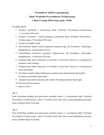 Protokół nr 4/2016 z posiedzenia Rady Wydziału Przyrodniczo-Technicznego z dnia 23 maja 2016 roku, godz. 15.00. Porządek obrad: 1. Przyjęcie protokołu z posiedzenia Rady Wydziału Przyrodniczo-Technicznego z 11 kwietnia 2016 roku 2. Przyjęcie protokołu z nadzwyczajnego posiedzenia Rady Wydziału PrzyrodniczoTechnicznego z 25 kwietnia 2016 roku 3. Przyjęcie porządku obrad 4. Zatwierdzenie składu komisji egzaminu dyplomowego dla kierunków: fizjoterapia, pielęgniarstwo, wychowanie fizyczne. 5. Zatwierdzenie terminarza egzaminu dyplomowego dla kierunków: fizjoterapia, pielęgniarstwo, wychowanie fizyczne. 6. Zaopiniowanie planu nauczania na kierunku wychowanie fizyczne ze specjalnością animator czasu wolnego 7. Zaopiniowanie planu nauczania na kierunku wychowanie fizyczne ze specjalnością trener personalny 8. Powołanie zespołu odpowiadającego za opracowanie dokumentacji dla studiów II stopnia na kierunku fizjoterapia 9. Zaopiniowanie planu nauczania dla studiów II stopnia kierunku fizjoterapia 10. Informacje kierownictwa 11. Sprawy różne Ad. 1 Pani Prodziekan poddała pod głosowanie protokół numer 2 z posiedzenia Rady Wydziału Przyrodniczo-Technicznego z dnia 11 kwietnia 2016 roku, który został jednogłośnie przyjęty przez członków Rady Wydziału. Ad. 2 Pani Prodziekan poddała pod głosowanie protokół numer 3 z posiedzenia Rady Wydziału Przyrodniczo-Technicznego z dnia 25 kwietnia 2016 roku, który został jednogłośnie przyjęty przez członków Rady Wydziału. 1 Ad. 3 Rada Wydziału Przyrodniczo-Technicznego jednogłośnie przyjęła porządek obrad przedstawiony przez Panią Prodziekan. Ad. 4 Pani Prodziekan przedstawiła skład komisji egzaminu dyplomowego dla kierunków fizjoterapia, pielęgniarstwo oraz wychowanie fizyczne (załącznik numer 1). Członkowie Rady Wydziału jednogłośnie przyjęli przedstawiony skład komisji egzaminu dyplomowego. Ad. 5 Pani Prodziekan przedstawiła terminarz egzaminu dyplomowego dla kierunków fizjoterapia, pielęgniarstwo oraz wychowanie fizyczne (załącznik numer 2). Członkowie Rady Wydziału jednogłośnie przyjęli przedstawiony terminarz egzaminu dyplomowego. Ad. 6 Głos zabrał Pan dr Jacek Falkenberg. Poinformował, iż został upoważniony przez Panią mgr Monikę Stanaszek do zaprezentowania planu nauczania dla kierunku wychowanie fizyczne ze specjalnością „Animator czasu wolnego” (załącznik numer 3 i załącznik nr 4). Poinformował, iż po konsultacji z Działem Nauczania, zostało ustalone, iż nie istnieją wytyczne regulujące liczbę godzin wymaganą do uruchomienia specjalności. Ponadto Pani mgr Monika Stanaszek tworząc siatkę godzin dla specjalności „Animator czasu wolnego” nie mogła zwiększyć ogólnej liczby godzin przewidzianej do realizacji przez studentów kierunku wychowanie fizyczne. Pan dr Jacek Falkenberg wskazał, iż liczba godzin nowych przedmiotów w siatce dla specjalności „Animator czasu wolnego” wyniesie 105 godzin. Ponadto poinformował, iż omawiana siatka godzin została merytorycznie sprawdzona przez Panią Dziekan i Prodziekan. Pani Prodziekan poddała pod głosowanie przedstawiony plan nauczania, który został jednogłośnie przyjęty przez członków Rady Wydziału. 2 Ad. 7 Pan dr Jacek Falkenberg poinformował, iż Pan dr Tomasz Jonak opracował plan nauczania dla kierunku wychowanie fizyczne ze specjalnością „Trener personalny” (załącznik numer 5 i załącznik numer 6). Liczba godzin nowych przedmiotów dla specjalności „Trener personalny” wyniesie 90 godzin. Pani Prodziekan poddała pod głosowanie przedstawiony plan nauczania, który został jednogłośnie przyjęty przez członków Rady Wydziału. Ad. 8 Pani Prodziekan poinformowała iż z dniem 31.05.2016 roku wchodzi w życie Ustawa o zawodzie fizjoterapeuty, która nakłada na uczelnie obowiązek wprowadzenia od roku 2017 jednolitych studiów magisterskich na kierunku fizjoterapia. W związku z powyższym zaproponowała powołanie zespołu odpowiadającego za opracowanie dokumentacji dla studiów drugiego stopnia lub jednolitych magisterskich na kierunku fizjoterapia. W skład zespołu wejdą n/w osoby: 1. Dr Monika Sobolak 2. Dr Rafał Szafraniec 3. Mgr Dorota Cichoń. Głos zabrała Pani mgr Dorota Cichoń. Wskazała, iż do prac związanych z uruchomieniem studiów drugiego stopnia bądź jednolitych studiów magisterskich na kierunku fizjoterapia będą angażowani również inni pracownicy. Pani dr Małgorzata Milko zaproponowała poszerzenie składu osobowego w/w zespołu oraz wskazała swoją kandydaturę na jego członka. Pani Prodziekan poddała pod głosowanie członków Rady Wydziału n/w skład osobowy zespołu odpowiadającego za opracowanie dokumentacji dla studiów drugiego stopnia lub jednolitych magisterskich na kierunku fizjoterapia: 1. Dr Monika Sobolak 2. Dr Rafał Szafraniec 3. Mgr Dorota Cichoń 4. Dr Małgorzata Milko. Rada Wydziału pozytywnie zaopiniowała skład osobowy powołanego zespołu. 3 Ad. 9 Pani Prodziekan przedstawiła pokrótce plan nauczania dla studiów drugiego stopnia na kierunku fizjoterapia (załącznik numer 7 i załącznik numer 8). Wskazała również, iż są to studia o profilu praktycznym. Ponadto przedstawiła wykaz egzaminów, liczbę godzin oraz punktów ECTS na poszczególnych semestrach (załącznik numer 9). Głos zabrała Pani mgr Teresa Gola. Wyraziła wątpliwość nad koniecznością zakończenia przedmiotu „Zdrowie publiczne” egzaminem. Pani Prodziekan poparła wątpliwość Pani mgr Teresy Goli, zważywszy na fakt, iż zakres tematyczny dwóch pozostałych egzaminów na pierwszym semestrze jest bardzo obszerny. W związku z powyższym Pani Prodziekan zmieniła formę zaliczenia przedmiotu „Zdrowie publiczne” z egzaminu na zaliczenie na ocenę. Pani Prodziekan poddała pod głosowanie przedstawiony plan nauczania dla studiów drugiego stopnia na kierunku fizjoterapia, który został jednogłośnie przyjęty prz