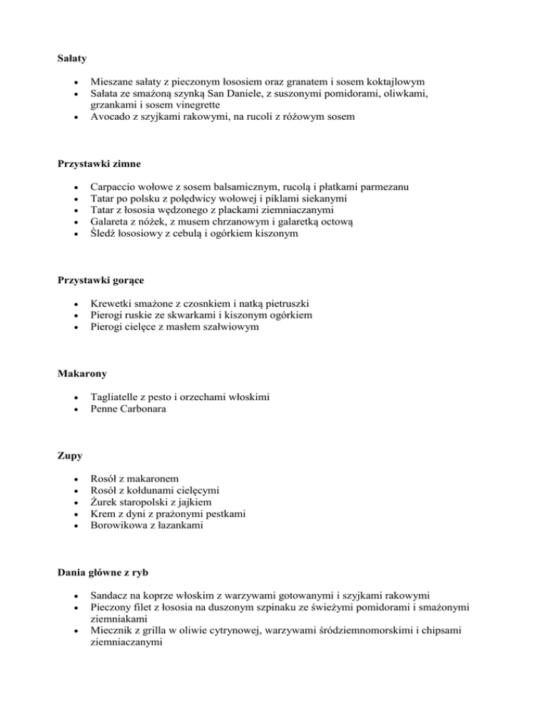 Sałaty Mieszane sałaty z pieczonym łososiem oraz granatem i sosem koktajlowym Sałata ze smażoną szynką San Daniele, z suszonymi pomidorami, oliwkami, grzankami i sosem vinegrette Avocado z szyjkami rakowymi, na rucoli z różowym sosem Przystawki zimne Carpaccio wołowe z sosem balsamicznym, rucolą i płatkami parmezanu Tatar po polsku z polędwicy wołowej i piklami siekanymi Tatar z łososia wędzonego z plackami ziemniaczanymi Galareta z nóżek, z musem chrzanowym i galaretką octową Śledź łososiowy z cebulą i ogórkiem kiszonym Przystawki gorące Krewetki smażone z czosnkiem i natką pietruszki Pierogi ruskie ze skwarkami i kiszonym ogórkiem Pierogi cielęce z masłem szałwiowym Makarony Tagliatelle z pesto i orzechami włoskimi Penne Carbonara Zupy Rosół z makaronem Rosół z kołdunami cielęcymi Żurek staropolski z jajkiem Krem z dyni z prażonymi pestkami Borowikowa z łazankami Dania główne z ryb Sandacz na koprze włoskim z warzywami gotowanymi i szyjkami rakowymi Pieczony filet z łososia na duszonym szpinaku ze świeżymi pomidorami i smażonymi ziemniakami Miecznik z grilla w oliwie cytrynowej, warzywami śródziemnomorskimi i chipsami ziemniaczanymi Dania główne Kaczka po polsku z sosem żurawinowym, karmelizowanym jabłkiem i smażonymi ziemniakami Kotlet schabowy z zasmażaną kapustą i gotowanymi ziemniakami z koperkiem Goleń wołowa z sosem winnym, marchewką słodko-kwaśną i kluskami kładzionymi Befsztyk z masłem czosnkowym, fasolką szparagową z boczkiem i pieczonymi ziemniakami Polędwiczki wieprzowe w sosie grzybowym, z ziemniakami z wody i grillowanymi warzywami Wołowina z rosołu w sosie chrzanowym z buraczkami zasmażanymi i ziemniakami z wody Desery Trio lodów mieszanych ze świeżymi owocami i musem truskawkowym Szarlotka na ciepło z lodami Sernik budyniowy z bakaliami Krem marcepanowy z musem truskawkowym Semifredo truskawkowe Dodatki Pomidory po włosku Warzywa z pary Sałata z vinegrette Frytki Ziemniaki opiekane Buraczki zasmażane Szpecle Napoje gorące Kawa z ekspresu EspressoCappuccinoIrish CoffeeAmericanoHerbata Ronnefeldt / Ronnefeldt Tea Earl Grey , Green Tea, Mint & Fresh, Cream Orange , Sweet Berries, Green Leaf Napoje zimne Sok naturalny pomarańczowy /grejfrutowy/jabłkowy/pożeczka Woda mineralna gazowana / niegazowana Coca-cola, Fanta, Sprite, Tonic, Red Bull Sok pomidorowy