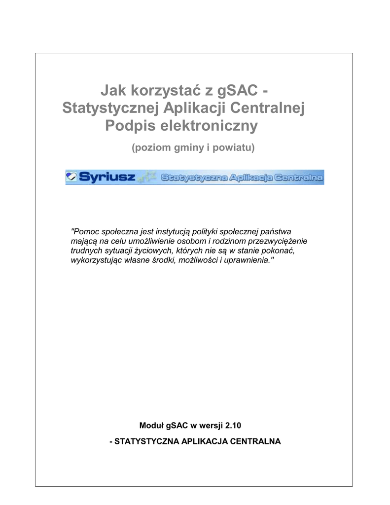 Jak korzystać z gSAC Statystycznej Aplikacji Centralnej Podpis elektroniczny (poziom gminy i powiatu) "Pomoc społeczna jest instytucją polityki społecznej państwa mającą na celu umożliwienie osobom i rodzinom przezwyciężenie trudnych sytuacji życiowych, których nie są w stanie pokonać, wykorzystując własne środki, możliwości i uprawnienia." Moduł gSAC w wersji 2.10 - STATYSTYCZNA APLIKACJA CENTRALNA Podpisywanie sprawozdań resortowych Podpisywanie sprawozdań resortowych Po dodaniu do okna "Lista sprawozdań" sprawozdania resortowego, za pomocą przycisku i jego zweryfikowaniu za pomocą przycisku Weryfikuj sprawozdania , użytkownik ma możliwość podpisania zweryfikowanego sprawozdania za pomocą podpisu elektronicznego. W tym celu należy zaznaczyć sprawozdanie lub sprawozdania na liście i wybrać przycisk Podpisz sprawozdania . Przycisk Podpisz sprawozdania nie będzie aktywny jeżeli: - nie będzie zaznaczone żadne sprawozdanie; - zaznaczone sprawozdanie nie spełnia kryteriów podpisu; - jeżeli w ustawieniach jest KESO filii (zaczyna się na 40). Aby podpis był możliwy, muszą być spełnione następujące kryteria: - sprawozdanie nie jest podpisane; - sprawozdanie ma status : 'Weryfikacja OK', 'Błąd weryfikacji regułami miękka walidacja', 'Błąd weryfikacji regułami warunkowa walidacja' i uzupełnione wyjaśnienia, 'Błąd przekazania SAC'; - jeśli sprawozdanie ma status 'Błąd weryfikacji regułami warunkowa walidacja' to zostały wprowadzone wyjaśnienia dla wszystkich reguł; - nie jest to sprawozdanie filii. Po wybraniu przycisku Podpisz sprawozdania otworzy się nowe okno "Podpis sprawozdania". 2 gSAC 2.10 Sygnity Podpisywanie sprawozdań resortowych W oknie prezentowane są dane sprawozdania (nazwa i numer sprawozdania oraz okres za który sporządzono sprawozdanie, a także nazwa i adres zarówno nadawcy jak i odbiorcy sprawozdania). Możliwy jest też podgląd podpisywanego sprawozdania oraz podgląd wyjaśnienia w przypadku, gdy sprawozdanie nie spełniało reguł oznaczonych jako warunkowe. Wyjaśnienia do reguł warunkowych również są podpisywane. Przycisk Podgląd sprawozdania - umożliwia wyświetlenie podglądu sprawozdania w formacie HTML przed jego podpisaniem. Sygnity gSAC 2.10 3 Podpisywanie sprawozdań resortowych Przycisk Podgląd wyjaśnień - aktywny dla sprawozdań o statusie 'Błąd weryfikacji regułami warunkowa walidacja', wyświetla podgląd wyjaśnień do reguł warunkowych w formacie HTML. Przycisk Podpisz - umożliwia podpisanie sprawozdania w oknie „PIN do klucza”. Przycisk Następne - dostępne tylko w przypadku podpisywania więcej niż jednego sprawozdania; umożliwia wybranie następnego sprawozdania do podpisania. Przycisk Anuluj - umożliwia rezygnację z podpisania sprawozdania (opuszczenie okna). Uwaga! Jeżeli podpisujemy jedno sprawozdanie, to po podpisaniu, okienko informacyjne zostaje zamknięte. Jeżeli więcej, to w okienku pojawi się kolejne sprawozdanie wybrane do podpisania. Aby wykonać podpis należy wybrać przycisk Podpisz i wprowadzić numer PIN do pola Wprowadź PIN do klucza. 4 gSAC 2.10 Sygnity Podpisywanie sprawozdań resortowych Informacja o podpisaniu zostanie wyświetlona na liście sprawozdań w kolumnie Podpisano. Podpisane sprawozdania należy następnie przekazać do aplikacji SAC poprzez wybranie przycisku Przekaż do SAC Sygnity . gSAC 2.10 5 Podpisywanie sprawozdań resortowych Uwaga! Następujące operacje wykonane po podpisaniu sprawozdania spowodują usunięcie podpisu: - modyfikacja sprawozdania -weryfikacja sprawozdania - zmiana opisu reguł warunkowych. Wówczas przed każdą z tych operacji pojawi się komunikat: Uwaga! Podpis wymaga poprawnie zainstalowanego w systemie urządzenia oraz karty z certyfikatem kwalifikowanym. W przypadku braku urządzenia lub karty z certyfikatem po wybraniu przycisku Podpisz w oknie Podpis sprawozdania pojawi się komunikat: 6 gSAC 2.10 Sygnity Podpisywanie sprawozdań jednorazowych Podpisywanie sprawozdań jednorazowych Po wypełnieniu danymi sprawozdania jednorazowego w trybie edycji , a następnie jego zweryfikowaniu za pomocą przycisku Weryfikuj sprawozdanie , użytkownik ma możliwość podpisania zweryfikowanego sprawozdania za pomocą podpisu elektronicznego. W tym celu należy zaznaczyć sprawozdanie lub sprawozdania na liście i wybrać przycisk Podpisz sprawozdanie na "Liście sprawozdań". Przycisk Podpisz sprawozdanie będzie aktywny jeżeli: - nie będzie zaznaczone żadne sprawozdanie; - zaznaczone sprawozdanie nie spełnia kryteriów podpisu. Aby podpis był możliwy, muszą być spełnione następujące kryteria: - sprawozdanie nie jest podpisane; - sprawozdanie ma status : 'Weryfikacja OK', 'Błąd weryfikacji regułami miękka walidacja', 'Błąd przekazania SAC'. Po wybraniu przycisku Podpisz sprawozdanie otworzy się nowe okno "Podpis sprawozdania". W oknie prezentowane są dane sprawozdania (nazwa i numer sprawozdania oraz termin jego zbierania, a także nazwa i adres zarówno nadawcy jak i odbiorcy sprawozdania). Możliwy jest też podgląd podpisywanego sprawozdania. Sygnity gSAC 2.10 7 Podpisywanie sprawozdań jednorazowych Przycisk Podgląd sprawozdania - umożliwia wyświetlenie podglądu sprawozdania w formacie HTML przed jego podpisaniem. Przycisk Podpisz - umożliwia podpisanie sprawozdania - otwiera okno „PIN do klucza”. Przycisk Anuluj - umożliwia rezygnację z podpisania sprawozdania oraz opuszczenie okna. Aby wykonać podpis należy wybrać przycisk Podpisz i wprowadzić PIN do pola Wprowadź PIN do klucza. Informacja o podpisaniu zostanie wyświetlona na liście sprawozdań w kolumnie Podpisano. Podpisane sprawozdanie należy następnie przekazać do aplikacji SAC poprzez wybranie przycisku Przekaż do SAC . Uwaga! Następujące operacje wykonane po podpisaniu sprawozdania spowodują 8 gSAC 2.10 Sygnity Podpisywanie sprawozdań jednorazowych usunięcie podpisu. - modyfikacja sprawozdania - wer