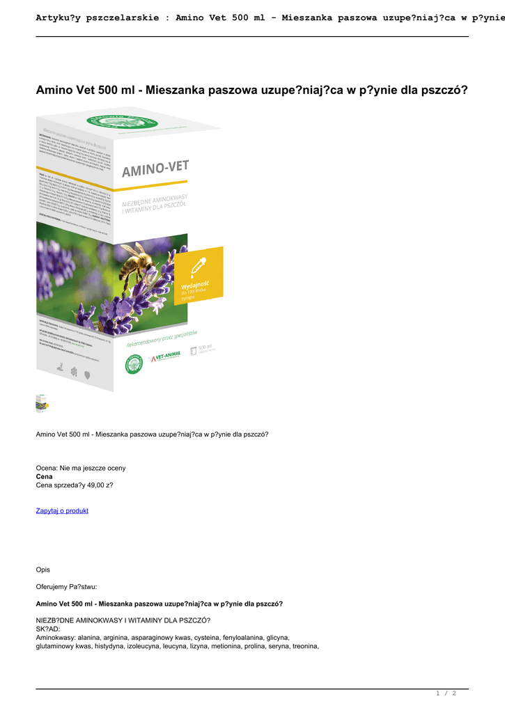 Artyku?y pszczelarskie : Amino Vet 500 ml - Mieszanka paszowa uzupe?niaj?ca w p?ynie