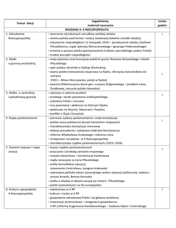 Temat lekcji 1. Odrodzenie Rzeczypospolitej 2. Walki o granicę wschodnią 3. Walka o zachodnią i południową granicę 4. Rządy parlamentarne 5. Zamach majowy i rządy sanacji 6. Kultura i gospodarka II Rzeczypospolitej Zagadnienia, materiał nauczania ROZDZIAŁ II: II RZECZPOSPOLITA – tworzenie się lokalnych ośrodków polskiej władzy – ziemie polskie pod koniec I wojny światowej (lokalne ośrodki władzy) – odzyskanie niepodległości 11 listopada 1918 r. (przekazanie władzy Józefowi Piłsudskiemu, rządy Jędrzeja Moraczewskiego i Ignacego Paderewskiego) – ententa a sprawa polska (postanowienia traktatu wersalskiego wobec Polski) – trudne początki niepodległości – wizje paostwa oraz koncepcje polskich granic Romana Dmowskiego i Józefa Piłsudskiego – spór polsko-ukraioski o Galicję Wschodnią – wojna polsko-bolszewicka (wyprawa na Kijów, ofensywa bolszewików od czerwca 1920 r., Bitwa Warszawska, pokój w Rydze) – kwestia Wileoszczyzny (bunt gen. Lucjana Żeligowskiego i problem Litwy Środkowej, stosunki polsko-litewskie) – sytuacja w zaborze pruskim – przebieg i skutki powstania wielkopolskiego – zaślubiny Polski z morzem – trzy powstania i plebiscyt na Górnym Śląsku – plebiscyty na Warmii, Mazurach i Powiślu – konflikt o Śląsk Cieszyoski – pierwsze wybory parlamentarne i mała konstytucja – polska scena polityczna (przed zamachem majowym) – charakterystyka konstytucji marcowej – elekcja prezydenta i zabójstwo Gabriela Narutowicza – reformy Władysława Grabskiego i reforma rolna – mniejszości narodowe w II Rzeczypospolitej – charakterystyka rządów parlamentarnych (1919–1926) – kryzys rządów parlamentarnych – przyczyny i przebieg zamachu majowego – nowela sierpniowa i konstytucja kwietniowa – rządy sanacyjne za życia Piłsudskiego – próby konsolidacji opozycji, utworzenie Centrolewu, kongres krakowski – represyjna polityka obozu sanacyjnego wobec opozycji politycznej, wybory i proces brzeski, Bereza Kartuska – walka o władzę w obozie sanacji po śmierci Piłsudskiego – polski autorytaryzm na tle europejskim – szkolnictwo w II RP – kultura i nauka w II RP – gospodarka odrodzonej Polski i jej główne problemy – inwestycje przemysłowe i osiągnięcia gospodarcze II RP (reformy Eugeniusza Kwiatkowskiego – budowa Gdyni i Centralnego Liczba godzin 1 1 1 1 1 1 7. Polityka zagraniczna II Rzeczypospolitej 8. Polska w przededniu II wojny światowej 9. Lekcja powtórzeniowa 10. Sprawdzian wiadomości Okręgu Przemysłowego) – sytuacja międzynarodowa II Rzeczypospolitej – układy w Rapallo i Locarno – polityka zagraniczna Piłsudskiego – polityka równowagi i „równych odległości” – zajęcie Zaolzia – relacje polsko-litewskie – niemieckie żądania wobec Polski w latach 1938–1939 – zacieśnienie współpracy z Wielką Brytanią i Francją – pakt Ribbentrop-Mołotow – sojusz z Wielką Brytanią – aktywizacja polskiego społeczeostwa w przededniu wojny 1 1 1 1
