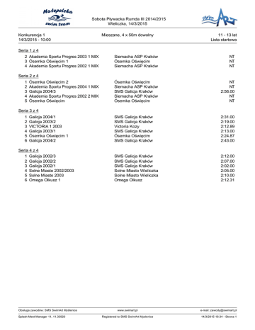 Sobota Pływacka Rumda III 2014/2015 Wieliczka, 14/3/2015 Konkurencja 1 14/3/2015 - 10:00 Mieszane, 4 x 50m dowolny 11 - 13 lat Lista startowa Seria 1 z 4 2 Akademia Sportu Progres 2003 1 MIX 3 Ósemka Oświęcim 1 4 Akademia Sportu Progres 2002 1 MIX Siemacha ASP Kraków Ósemka Oświęcim Siemacha ASP Kraków NT NT NT Ósemka Oświęcim Siemacha ASP Kraków SMS Galicja Kraków Siemacha ASP Kraków Ósemka Oświęcim NT NT 2:56.00 NT NT SMS Galicja Kraków SMS Galicja Kraków Victoria Kozy SMS Galicja Kraków Ósemka Oświęcim SMS Galicja Kraków 2:31.00 2:19.00 2:12.89 2:13.00 2:24.87 2:43.00 SMS Galicja Kraków SMS Galicja Kraków SMS Galicja Kraków Solne Miasto Wieliczka Solne Miasto Wieliczka Omega Olkusz 2:12.00 2:07.00 2:02.00 2:05.00 2:10.00 2:12.31 Seria 2 z 4 1 2 3 4 5 Ósemka Oświęcim 2 Akademia Sportu Progres 2004 1 MIX Galicja 2004/3 Akademia Sportu Progres 2002 2 MIX Ósemka Oświęcim Seria 3 z 4 1 2 3 4 5 6 Galicja 2004/1 Galicja 2003/2 VICTORIA 1 2003 Galicja 2003/1 Ósemka Oświęcim 1 Galicja 2004/2 Seria 4 z 4 1 Galicja 2002/3 2 Galicja 2002/2 3 Galicja 2002/1 4 Solne Miasto 2002/2003 5 Solne Miasto 2003 6 Omega Olkusz 1 Obsługa zawodów: SMS SwimArt Myślenice Splash Meet Manager 11, 11.33920 www.swimart.pl e-mail: [email protected] Registered to SMS SwimArt Myslenice 14/3/2015 18:34 - Strona 1