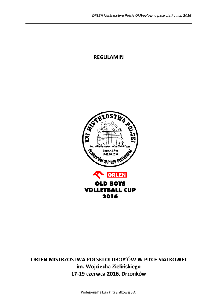 ORLENMistrzostwaPolskiOldboy’ówwpiłcesiatkowej,2016 REGULAMIN ORLENMISTRZOSTWAPOLSKIOLDBOY’ÓWWPIŁCESIATKOWEJ im.WojciechaZielińskiego 17-19czerwca2016,Drzonków ProfesjonalnaLigaPiłkiSiatkowejS.A. ORLENMistrzostwaPolskiOldboy’ówwpiłcesiatkowej,2016 1.ORGANIZATOR ProfesjonalnaLigaPiłkiSiatkowejS.A. ul.Bagno2,00-112,Warszawa tel.222531111,fax.222536363 e-mail:[email protected] Patronat:PolskiZwiązekPiłkiSiatkowej 2.TERMINIMIEJSCE 17–19czerwca2016 WojewódzkiOśrodekSportuiRekreacjiim.ZbigniewaMajewskiego Drzonków,Olimpijska20 3.MistrzostwaPolskirozgrywanasąrazwroku,systememturniejowym. 4.Zespół,któryzajmujepierwszemiejsceotrzymujetytuł„MistrzaPolskiOldBoyówwpiłce siatkowej”wdanejkategoriiwiekowej. 5.Meczebędąrozgrywanezgodniez„Przepisamigrywpiłkęsiatkową”wydanymiprzezPZPS. 6.Spotkaniabędągranedodwóchwygranychsetów,wprzypadkuwyniku1:1,seta decydującegograsiędo15punktów(zprzewagą2punktów). Wrozgrywkachgrupowychzespółwygrywającymeczotrzymujezazwycięstwo2 punkty,zespółprzegrywającymeczotrzymuje1punkt,zawalkowerzespółotrzymuję0 punktów.Kolejnośćdrużynwtabeliustalanajestwedług: a)większejliczbyzdobytychpunktówmeczowych; b)większegoilorazusetówwygranychdoprzegranych; c)większegoilorazumałychpunktówzdobytychdostraconych, d)jeżelipomimozastosowaniaregułokreślonychwpodpunktacha),b)ic)niemożnaustalić kolejności,owyższymmiejscuwtabelidecydująwynikimeczówpomiędzy zainteresowanymidrużynami. 7.Meczedlakategoriiwiekowychpowyżej50latistarszychbędąrozgrywanenasiatceo wysokości238cm. 8.LOSOWANIEGRUP ProfesjonalnaLigaPiłkiSiatkowejS.A. ORLENMistrzostwaPolskiOldboy’ówwpiłcesiatkowej,2016 10.06.2016(piątek) godz.11.00-losowaniegrupORLENMistrzostwaPolskiOldboy’ówwpiłcesiatkowej(w internecie)www.siatkarskaligatv.pl PROGRAM 17.06.2016(piątek) 15.30–odprawatechniczna,halaszermiercza(obecnośćobowiązkowakierownikówdrużyn lubosobyupoważnionejdoreprezentowaniazespołu) 17.00rozpoczęciezawodów 18.06.2016(sobota) godzinymeczówzgodniezprogramem 14.30uroczysteotwarcieMistrzostwPolskiOldBoyówwpiłcesiatkowej 19.06.2016(niedziela) godzinymeczówzgodniezprogramem okołogodz.15.30zakończeniezawodów 9.UCZESTNICTWO 9.1.Zawodyzostanąrozegranew6(sześciu)kategoriachwiekowych: 9.1.1. powyżej35lat(rokurodzenia1981istarsi) 9.1.2. powyżej40lat(rokurodzenia1976istarsi) 9.1.3. powyżej45lat(rokurodzenia1971istarsi) 9.1.4. powyżej50lat(rokurodzenia1966istarsi) 9.1.5. powyżej55lat(rokurodzenia1961istarsi) 9.1.6. powyżej60lat(rokurodzenia1956istarsi) 9.2.Ozakwalifikowaniudodanejgrupywiekowejdecydujerokurodzenia. 9.3.Warunkiemutworzeniadanejkategoriiwiekowejjestzgłoszenieconajmniej4drużyn. 9.4.Zawodnicystartującywzawodachmusząpodpisaćoświadczenieogrzenawłasną odpowiedzialność.Oświadczeniepowinnozostaćprzekazanenaodprawietechnicznejprzez kierownikadrużyny.Zawodnicygrającywturniejumusząposiadaćjednakowe, ponumerowane(zgodniezprzepisami)strojesportowe. 9.5.ZawodnicybiorącyudziałwMistrzostwachPolskiOldBoyówmogąreprezentowaćbarwy tylkojednegozespołu. ProfesjonalnaLigaPiłkiSiatkowejS.A. ORLENMistrzostwaPolskiOldboy’ówwpiłcesiatkowej,2016 10.ZGŁOSZENIA 10.1.Formularzezgłoszenioweopublikowanesąnastronieinternetowej www.plusliga.pl/imprezyniepóźniejniżnadzieńrozpoczęciaprzyjmowaniazgłoszeń.Termin przesyłaniazgłoszeńod1do31maja2016. 10.2.Zgłoszeniedoturniejupowinnozawierać: 10.2.1.nazwęzespołu, 10.2.2.imiennąlistęzawodnikówzdokładnądatąurodzenia.(Wskładdrużynywchodzi max.12zawodników/trener/kierownikdrużyny), 10.2.3.dokładnyadres,telefonorazadrese-mailosoby,,kontaktowej”(kierownika zespołu), 10.2.4.potwierdzenieprzelewuopłatyzawpisowe /wwersjielektronicznejwysyłamydoorganizatorazawodówznazwądrużyny orazkategorii/ 10.3.Wpisowezaudziałwturniejupobieranajestopłatawwysokości:861,00złbrutto (kwotadotyczyzgłoszonejdrużyny). 10.4.WpłatynależydokonaćnakontoProfesjonalnejLigiPiłkiSiatkowejS.A.: BGŻS.A.F.Nr1,IOddziałwWarszawie51203000451110000000293000 10.5.Terminzgłoszeńupływa: 31-05-2016.Powyznaczonymterminiezgłoszenianiebędąprzyjmowane. 11.KomitetOrganizacyjnyzastrzegasobieprawodo: -podziałunagrupyeliminacyjne -rozstrzyganiasprawspornychnieobjętychniniejszymregulaminem KomitetOrganizacyjny MistrzostwPolskiOldBoyówwpiłcesiatkowej2016 ProfesjonalnaLigaPiłkiSiatkowejS.A.