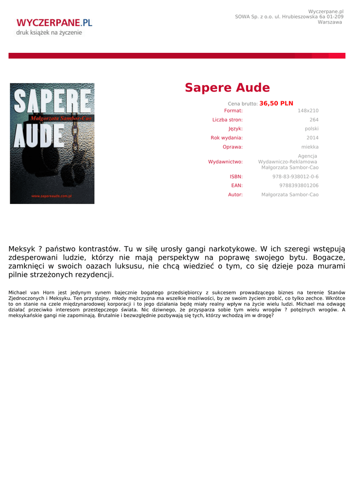 Wyczerpane.pl SOWA Sp. z o.o. ul. Hrubieszowska 6a 01-209 Warszawa Sapere Aude Cena brutto: Format: 36,50 PLN 148x210 Liczba stron: 264 Język: polski Rok wydania: 2014 Oprawa: miekka Wydawnictwo: Agencja Wydawniczo-Reklamowa Małgorzata Sambor-Cao ISBN: 978-83-938012-0-6 EAN: 9788393801206 Autor: Małgorzata Sambor-Cao Meksyk ? państwo kontrastów. Tu w siłę urosły gangi narkotykowe. W ich szeregi wstępują zdesperowani ludzie, którzy nie mają perspektyw na poprawę swojego bytu. Bogacze, zamknięci w swoich oazach luksusu, nie chcą wiedzieć o tym, co się dzieje poza murami pilnie strzeżonych rezydencji. Michael van Horn jest jedynym synem bajecznie bogatego przedsiębiorcy z sukcesem prowadzącego biznes na terenie Stanów Zjednoczonych i Meksyku. Ten przystojny, młody mężczyzna ma wszelkie możliwości, by ze swoim życiem zrobić, co tylko zechce. Wkrótce to on stanie na czele międzynarodowej korporacji i to jego działania będę miały realny wpływ na życie wielu ludzi. Michael ma odwagę działać przeciwko interesom przestępczego świata. Nic dziwnego, że przysparza sobie tym wielu wrogów ? potężnych wrogów. A meksykańskie gangi nie zapominają. Brutalnie i bezwzględnie pozbywają się tych, którzy wchodzą im w drogę?