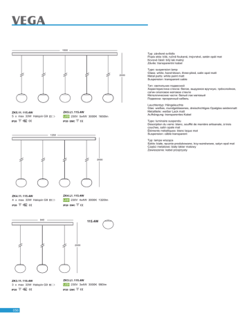 1500 Typ: závěsné svítidlo Popis skla: bílé, ručně foukané, trojvrstvé, satén opál mat Kovové části: bílý lak matný Závěs: transparentní kabel 2000 Type: suspension lamp Glass: white, hand-blown, three-plied, satin opal matt Metal parts: white paint matt Suspension: transparent cable Тип: светильник подвесной Характеристика стекла: белое, выдувное вручную, трёхслойное, сатин опаловое матовое стекло Металлические части: белый лак матовый Подвеска: прозрачный кабель ZK5.L1. 115.4W ZK5.11. 115.4W 5 x max 33W Halopin G9 230V 5x4W 3000K 1650lm Leuchtentyp: Hängeleuchte Glas: weißes, mundgeblasenes, dreischichtiges Opalglas seidenmatt Metallteile: weißer Lack matt Aufhängung: transparentes Kabel Type: luminaire suspendu Description du verre: blanc, soufflé de manière artisanale, à trois couches, satin opale mat Éléments métalliques: blanc laque mat Suspension: câble transparent 1250 Typ: lampa wisząca Szkło: białe, ręcznie produkowane, trzy-warstwowe, satyn opal mat Części metalowe: biały lakier matowy Zawieszenie: kabel przejrzysty 2000 ZK4.11. 115.4W 4 x max 33W Halopin G9 ZK4.L1. 115.4W 230V 4x4W 3000K 1320lm 840 115.4W 2000 ZK3.11. 115.4W 3 x max 33W Halopin G9 056 ZK3.L1. 115.4W 230V 3x4W 3000K 990lm 1500 1500 2000 ZK5.11. 105.4W ZK5.L1. 110.4W ZK5.11. 110.4W 230V 5x4W 3000K 1650lm 5 x max 33W Halopin G9 ZK5.L1. 105.4W 230V 5x4W 3000K 1650lm 5 x max 33W Halopin G9 1250 1250 2000 2000 ZK4.11. 110.4W ZK4.11. 105.4W ZK4.L1. 110.4W 4 x max 33W Halopin G9 230V 4x4W 3000K 1320lm ZK4.L1. 105.4W 4 x max 33W Halopin G9 230V 4x4W 3000K 1320lm 840 840 105.4W 110.4W 2000 2000 ZK3.11. 110.4W 3 x max 33W Halopin G9 ZK3.L1. 110.4W 230V 3x4W 3000K 990lm ZK3.11. 105.4W 3 x max 33W Halopin G9 ZK3.L1. 105.4W 230V 3x4W 3000K 990lm 057