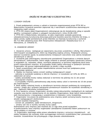 OGÓLNE WARUNKI UCZESTNICTWA I.ZASADY OGÓLNE 1. Przed podpisaniem umowy o udział w imprezie organizowanej przez PTTK RO w Białymstoku Uczestnik powinien zapoznać się z warunkami uczestnictwa stanowiącymi integralną część umowy. 2. PTTK RO zwane dalej Organizatorem zobowiązuje się do świadczenia usług w sposób zgodny z przepisami ustawy o usługach turystycznych z dnia 29.08.1997 3. PTTK RO w Białymstoku oświadcza, że jako organizator posiada gwarancję ubezpieczeniową turystyczną dotyczącą pokrycia kosztów powrotu klientów do kraju, a także zwrotu wpłat poniesionych przez klientów za imprezę turystyczną o numerze 00.712.460 udzieloną przez AXA Towarzystwo Ubezpieczeń i Reasekuracji S.A. w Warszawie, ul. Chłodna 51. II. ZAWARCIE UMOWY 1. Zawarcie umowy następuje po zapoznaniu się przez uczestnika z ofertą, Warunkami i informacjami szczegółowymi, które są integralną częścią umowy. Podpisanie umowy, stanowi wyrażenie zgody na postanowienia niniejszych warunków oraz zakres świadczeń określonych w ofercie. 2. Uczestnik jest zobowiązany niezwłocznie powiadomić Organizatora o zmianie danych personalnych i dokumentów, które uległy zmianie w okresie pomiędzy zawarciem Umowy a wyjazdem (tj. nazwisko, adres, wymiana paszportu) w terminie najpóźniej do10 dnia przed rozpoczęciem imprezy. W przypadku braku takiej informacji w podanym terminie Organizator nie ponosi odpowiedzialności za skutki z tego wynikłe. 3. Jeżeli uczestnikiem jest osoba niepełnoletnia umowa musi być podpisana przez ustawowego opiekuna. 4. Wpłaty za imprezę należy wnosić według następujących zasad: - zaliczkę w wysokości podanej w ofercie imprezy ( w wysokości od 10% do 30% w zależności od ceny) - wpłaty pozostałej kwoty należy dokonać w terminie nie później niż 21 dni przed rozpoczęciem imprezy - w przypadku imprezy jednodniowej całą kwotę należy uiścić w terminie do 10 dni przed jej rozpoczęciem. 5. Brak wpłaty należnej kwoty w określonym terminie stanowi podstawę do rozwiązania umowy i wiąże się z prawem potrącenia poniesionych kosztów do wysokości określonej w pkt. Ogólnych Warunków Uczestnictwa. 6. Przy zawarciu umowy Organizator określa rodzaj dokumentów niezbędnych do realizacji wyjazdu oraz termin dostarczenia ich do siedziby Organizatora. Brak takich dokumentów jest równoznaczny z rezygnacją z uczestnictwa w imprezie z winy Uczestnika. 7. Organizator ma prawo do podniesienia ceny imprezy jeżeli wzrosną koszty imprezy na skutek następujących okoliczności: - wzrost kosztów transportu, - wzrost ceł, podatków, opłat lotniskowych, drogowych, - zmiany cen wiz w wyniku wzrostu kursu walut. Podniesienie ceny imprezy jest możliwe do 21-ego dnia przed wyjazdem. O podwyższeniu ceny imprezy organizator zawiadamia Uczestnika listem poleconym na adres podany w umowie. 8. Organizator zastrzega sobie prawo odwołania imprezy z przyczyn niezależnych od siebie (działanie siły wyższej, brak wymaganego minimum uczestników) bez ponoszenia kosztów. Uczestnikowi nie przysługuje z tego powodu odszkodowanie. III. REZYGNACJA Z IMPREZY 1.Rezygnacja z imprezy może nastąpić wyłącznie w formie pisemnej i musi zawierać datę jej zgłoszenia u Organizatora. 2.Uczestnikowi przysługuje zwrot dokonanej wpłaty jeżeli rezygnacja lub niemożność wzięcia udziału w imprezie następuje z przyczyn leżących po stronie Organizatora, tj.: - zmiana warunków imprezy (cena, termin, trasa, miejsce i standard zakwaterowania, środek transportu), rezygnacja z tych przyczyn może nastąpić w ciągu 3 dni po otrzymaniu od Organizatora pisemnego zawiadomienia. Brak odpowiedzi w tym terminie uważa się za akceptację zmienionych warunków umowy; - odwołanie imprezy. 3. Jeżeli Uczestnik rezygnuje z udziału w imprezie z przyczyn leżących po jego stronie, Organizator dokonuje zwrotu wpłaconej na poczet udziału w imprezie kwoty, po potraceniu poniesionych nakładów i kosztów związanych z przygotowaniem imprezy oraz odwołaniem uczestnictwa Klienta w tej imprezie. Rezygnację należy złożyć w siedzibie Organizatora w formie pisemnej. Uczestnik imprezy może ubezpieczyć się od kosztów rezygnacji i przerwania podróży podczas trwania imprezy turystycznej. 4.W przypadku, gdy Klient odstępujący od umowy wskaże osobę spełniająca warunki udziału w imprezie, która przyjmuje obowiązki wynikające z tej umowy, Uczestnik nie ponosi wyżej wymienionych kosztów. Zasada nie dotyczy krajów do których obowiązują wizy. IV. UBEZPIECZENIE 1. Uczestnicy wszystkich wyjazdów organizowanych przez PTTK RO w Białymstoku ubezpieczeni są od kosztów leczenia i następstw nieszczęśliwych wypadków w AXA S.A. 2. Uczestnik przed podpisaniem umowy zobowiązany jest do zapoznania się z „ Ogólnymi warunkami ubezpieczenia” dostępnymi w siedzibie Organizatora. 3. Zawierając umowę, Uczestnik deklaruje, że stan jego zdrowia umożliwia udział w imprezie. Ubezpieczenie nie obejmuje chorób przewlekłych. 4. Istnieje możliwość wykupienia dodatkowych ubezpieczeń. 5.Dochodzenie roszczeń wynikających z ubezpieczenia , odbywa się w granicach polisy ubezpieczeniowej, bezpośrednio w towarzystwie ubezpieczeniowym. V. REALIZACJA UMOWY 1. Uczestnik zobowiązany jest do posiadania aktualnie obowiązujących dokumentów upoważniających do przekroczenia granic ( paszport, wiza, voucher, przy wyjazdach młodzieży aktualna legitymacje szkolną). 2. Uczestnicy są zobowiązani do przestrzegania regulaminów i innych przepisów obowiązujących w kraju pobytu, obiektach noclegowych, gastronomicznych, jak również zaleceń pilota (np. co do miejsca i czasu zbiórki). 3. Uczestnik odpowiada za wyrządzone przez siebie szkody, za które ma obowiązek zapłacić w miejscu ich powstania z własnych środków. Za szkody wyrządzone przez osoby niepełnoletnie odpowiadają ich prawni opiekunowie. 4. Organizator nie ponosi odpowiedzialności