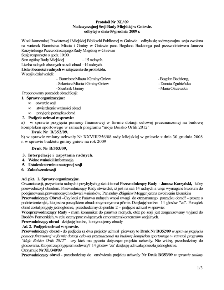 Protokół Nr XL/ 09 Nadzwyczajnej Sesji Rady Miejskiej w Gniewie. odbytej w dniu 09 grudnia 2009 r. W sali kameralnej Powiatowej i Miejskiej Biblioteki Publicznej w Gniewie odbyła się nadzwyczajna sesja zwołana na wniosek Burmistrza Miasta i Gminy w Gniewie pana Bogdana Badzionga pod przewodnictwem Janusza Karzyńskiego Przewodniczącego Rady Miejskiej w Gniewie Sesję rozpoczęto o godz. 10:00. Stan ogólny Rady Miejskiej – 15 radnych. Liczba radnych obecnych na sali obrad –14 radnych. Lista obecności radnych w załączeniu do protokółu. W sesji udział wzięli: - Burmistrz Miasta i Gminy Gniew - Bogdan Badziong, - Sekretarz Miasta i Gminy Gniew - Danuta Zgubieńska - Skarbnik Gminy - Maria Olszewska Proponowany porządek obrad Sesji: 1. Sprawy organizacyjne: • otwarcie sesji • stwierdzenie waŜności obrad • przyjęcie porządku obrad 2. Podjęcie uchwał w sprawie: a) w sprawie przyjęcia pomocy finansowej w formie dotacji celowej przeznaczonej na budowę kompleksu sportowego w ramach programu "moje Boisko Orlik 2012" Druk Nr B/352/09, b) w sprawie zmiany uchwały Nr XXVIII/256/08 rady Miejskiej w gniewie z dnia 30 grudnia 2008 r. w sprawie budŜetu gminy gniew na rok 2009 Druk Nr B/353/09, 3. 4. 5. 6. Interpelacje i zapytania radnych. Wolne wnioski i informacje. Ustalenie terminu następnej sesji Zakończenie sesji Ad. pkt. 1. Sprawy organizacyjne. Otwarcia sesji, przywitania radnych i przybyłych gości dokonał Przewodniczący Rady - Janusz Karzyński, który przewodniczył obradom. Przewodniczący Rady stwierdził, iŜ jest na sali 14 radnych a więc wymagane kworum do podejmowania prawomocnych uchwał i wniosków. Pan radny Zbigniew Megger jest na zwolnieniu lekarskim Przewodniczący Obrad –Czy ktoś z Państwa radnych wnosi uwagi do otrzymanego porządku obrad? - proszę o podniesienie ręki,. kto jest za porządkiem obrad otrzymanym na piśmie. Dziękuję bardzo: 14 głosów "za". Porządek obrad został przyjęty jednogłośnie, przechodzimy do punktu 2 - podjęcie uchwał w sprawie: Wiceprzewodniczący Rady - mam komunikat do państwa radnych, otóŜ po sesji jest zorganizowany wyjazd do Brodów Pomorskich, w celu oceny prac związanych z montaŜem kontenerów socjalnych. Przewodniczący obrad - dziękuję bardzo, kontynuujemy obrady Ad. 2. Podjęcie uchwał w sprawie. Przewodniczący obrad - do podjęcia są dwa projekty uchwał pierwszy to Druk Nr B/352/09 w sprawie przyjęcia pomocy finansowej w formie dotacji celowej przeznaczonej na budowę kompleksu sportowego w ramach programu "Moje Boisko Orlik 2012" - czy ktoś ma pytania dotyczące projektu uchwały. Nie widzę, przechodzimy do głosowania. Kto jest za przyjęciem uchwały? 14 głosów "za" dziękuję uchwała przeszła jednogłośnie. Otrzymuje Nr XL/340/09 Przewodniczący obrad - przechodzimy do omówienia projektu uchwały Nr Druk B/353/09 w sprawie zmiany 1/3 uchwały Nr XXVIII/256/08 rady Miejskiej w Gniewie z dnia 30 grudnia 2008r. w sprawie budŜetu Gminy Gniew na rok 2009 " Przewodniczący obrad Czy ktoś ma pytania do przedstawionych zmian w budŜecie. Nie widzę przystępujemy do głosowania. Kto jest za przyjęciem uchwały 14 głosów "za'" uchwała przeszła jednomyślnie, otrzymuje Nr XL/341/09 Przewodniczący obrad - przechodzimy do następnego puntu obrad tj: Ad 3. Interpelacje i zapytania radnych Grzegorz Wasielewski - jako członek Komisji d/s sprzedaŜy Wzgórza Zamkowego w Gniewie, chciałbym poinformować koleŜanki i kolegów radnych o pracach w tej komisji. Jest duŜy problem z Muzeum Archeologicznym Pomaga nam w rozwiązaniu tego problemu prawnik z UMiG pan Braun, po przeprowadzonych trudnych rozmowach gmina ma zabezpieczyć 300 m2 powierzchni dla muzeum w obrębie Starego Miasta. Wybrano na ten cel budynek dawnej "Jowity". Gmina musi dokonać tego zapisu w księgach wieczystych, będzie to taki wirtualny zapis, ale muzeum wymaga tego zapisu. Aby kontynuować negocjacje naleŜy, się dogadać, a do dokonania tego zapisu będzie konieczna uchwała Rady. Muzeum zatrudnia 2 pracowników. Trzeba zauwaŜyć, iŜ działalność Muzeum jest mizerna, nie było Ŝadnej wystawy o Gniewie, trzeba powiedzieć, iŜ sytuacja Fundacji jest równieŜ bardzo trudna, trzeba duŜo nakładów i inwestycji, na przykład w chwili obecnej pokoje gościnne w hotelu Marysieńka wymagają ogromnych nakładów, by osiągnąć jakiś standard. Sumisławski Franciszek - mam pytanie co się stanie jak Muzeum Archeologiczne się nie dogada i nie zrezygnuje z dzierŜawy na "Zamku". Burmistrz - nie wiem co się stanie, być moŜe POLMLEK odstąpi od negocjacji. Marszałek Sejmiku poinformował, iŜ w Wejherowie przekazano duŜe magazyny, w których moŜna by było przewieść zbiory z Gniewu. Andrzej Solecki - chcemy oddać budynek dawnej "Jowity", jaki budynek nam zostanie do celów kulturalnych, jest to ostatni bastion kultury, gdzie moŜna, coś zorganizować oczywiście po remoncie. Nie mamy Ŝadnego budynku, do działalności kulturalnej, Ŝadnej sali widowiskowej. Pozbyliśmy się wszystkiego. Byłem na spotkaniu stowarzyszenia "Pąsowa RóŜa" - przybyło 60 osób do tej sali, nie było czym oddychać, ta sala nie jest przystosowana do tych celów było duszno, ludzie siedzieli gdzie się da, na schodach, tak być nie moŜe, a teraz chcemy oddać ostatni budynek w centrum miasta, który by moŜna było ewentualnie zaadaptować na ośrodek kultury. Dlaczego nie wyłączyć ze sprzedaŜy budynku sądu i tam zabezpieczyć te 300 m dla Muzeum. Burmistrz - nie jest to Ŝaden bastion kultury, straŜ poŜarna nie wyda zgody na jakoŜkolwiek działalność w tym budynku. Z tym zabezpieczeniem tej powierzchni dla muzeum to, moŜe być tak, iŜ muzeum nigdy nie skorzysta z tego budynku, jest to taki zapis umowny. Muzeum by mogło się zrzec w ogóle tej powierzchni na rzecz samorządu. MoŜna to obciąŜenie wpisać na jakimkolwiek budynku. Aby wyłączyć sąd ze sprzedaŜy, to trzeba wykonać nową wycenę 