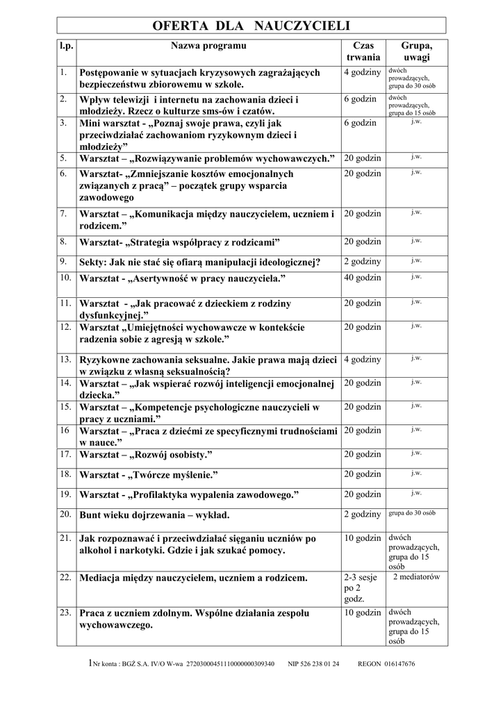 OFERTA DLA NAUCZYCIELI l.p. Nazwa programu Czas trwania Grupa, uwagi 1. Postępowanie w sytuacjach kryzysowych zagrażających bezpieczeństwu zbiorowemu w szkole. 4 godziny dwóch prowadzących, grupa do 30 osób 2. 6 godzin Wpływ telewizji i internetu na zachowania dzieci i młodzieży. Rzecz o kulturze sms-ów i czatów. 6 godzin Mini warsztat - „Poznaj swoje prawa, czyli jak przeciwdziałać zachowaniom ryzykownym dzieci i młodzieży” Warsztat – „Rozwiązywanie problemów wychowawczych.” 20 godzin dwóch prowadzących, grupa do 15 osób j.w. 3. 5. j.w. 6. Warsztat- „Zmniejszanie kosztów emocjonalnych związanych z pracą” – początek grupy wsparcia zawodowego 20 godzin j.w. 7. Warsztat – „Komunikacja między nauczycielem, uczniem i 20 godzin rodzicem.” j.w. 8. Warsztat- „Strategia współpracy z rodzicami” 20 godzin j.w. 9. Sekty: Jak nie stać się ofiarą manipulacji ideologicznej? 2 godziny j.w. 10. Warsztat - „Asertywność w pracy nauczyciela.” 40 godzin j.w. 11. Warsztat - „Jak pracować z dzieckiem z rodziny 20 godzin j.w. 20 godzin j.w. 13. Ryzykowne zachowania seksualne. Jakie prawa mają dzieci 4 godziny j.w. dysfunkcyjnej.” 12. Warsztat „Umiejętności wychowawcze w kontekście radzenia sobie z agresją w szkole.” w związku z własną seksualnością? 14. Warsztat – „Jak wspierać rozwój inteligencji emocjonalnej 20 godzin j.w. 20 godzin j.w. dziecka.” 15. Warsztat – „Kompetencje psychologiczne nauczycieli w pracy z uczniami.” Warsztat – „Praca z dziećmi ze specyficznymi trudnościami 20 godzin w nauce.” 17. Warsztat – „Rozwój osobisty.” 20 godzin j.w. 16 j.w. 18. Warsztat - „Twórcze myślenie.” 20 godzin j.w. 19. Warsztat - „Profilaktyka wypalenia zawodowego.” 20 godzin j.w. 20. Bunt wieku dojrzewania – wykład. 2 godziny 21. Jak rozpoznawać i przeciwdziałać sięganiu uczniów po 10 godzin dwóch alkohol i narkotyki. Gdzie i jak szukać pomocy. 22. Mediacja między nauczycielem, uczniem a rodzicem. 23. Praca z uczniem zdolnym. Wspólne działania zespołu prowadzących, grupa do 15 osób 2 mediatorów 2-3 sesje po 2 godz. 10 godzin dwóch prowadzących, grupa do 15 osób wychowawczego. 1Nr konta : BGŻ S.A. IV/O W-wa grupa do 30 osób 27203000451110000000309340 NIP 526 238 01 24 REGON 016147676 24. „Kiedy życie traci sens.” Profilaktyka prób samobójczych i depresji. Mini warsztat dla nauczycieli. 8 godzin 25. Bulimia i anoreksja. Jak rozpoznawać, gdzie szukać pomocy? 8 godzin 26. „Samoobrona dla nauczycieli – czyli jak nie stać się ofiarą napaści oraz co kiedy dzieci biją się na naszych oczach.” Warsztaty umiejętności psychomotorycznych. 3x4 godziny 27. "Praca z grupą klasową z orzeczeniami, w szczególności 20 godzin z dysfunkcjami zachowań". warsztat 20 godz. dla nauczycieli. dwóch prowadzących, grupa do 15 osób dwóch prowadzących, grupa do 15 osób Dwóch prowadzących, grupa do 15 osób j.w. Zakres tematyczny: 1.Integracja klasy ze względu na zaburzenia zachowania, agresję. 2.Praca z dziećmi z orzeczeniami. 3.Jak pracować z dzieckiem z zaburzeniami zachowania. 4.Jak pracować z dzieckiem agresywnym i z jego rodzicem. 28. 8 godzin „Nowa stara moda – subkultura EMO, jak przeżywać, żeby nie bolało” – praca z grupą dzieci, z samookaleczeniami i innymi objawami subkultury EMO. 2Nr konta : BGŻ S.A. IV/O W-wa 27203000451110000000309340 NIP 526 238 01 24 dwóch prowadzących, grupa do 15 osób REGON 016147676