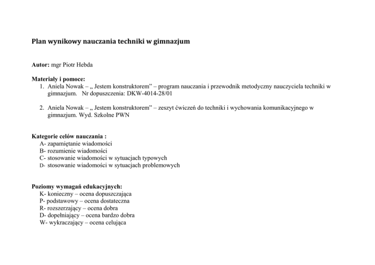 Plan wynikowy nauczania techniki w gimnazjum Autor: mgr Piotr Hebda Materiały i pomoce: 1. Aniela Nowak – „ Jestem konstruktorem” – program nauczania i przewodnik metodyczny nauczyciela techniki w gimnazjum. Nr dopuszczenia: DKW-4014-28/01 2. Aniela Nowak – „ Jestem konstruktorem” – zeszyt ćwiczeń do techniki i wychowania komunikacyjnego w gimnazjum. Wyd. Szkolne PWN Kategorie celów nauczania : A- zapamiętanie wiadomości B- rozumienie wiadomości C- stosowanie wiadomości w sytuacjach typowych D- stosowanie wiadomości w sytuacjach problemowych Poziomy wymagań edukacyjnych: K- konieczny – ocena dopuszczająca P- podstawowy – ocena dostateczna R- rozszerzający – ocena dobra D- dopełniający – ocena bardzo dobra W- wykraczający – ocena celująca JEDNOSTKI LEKCYJNE 1-2 Zapoznanie się z programem nauczania i kryteriami ocen. 3. Jestem bezpiecznym uczestnikiem ruchu drogowego. CELE KSZTAŁCENIA W UJĘCIU OPERACYJNYM WRAZ Z OKRESLENIEM WYMAGAŃ KATEGORIA A KATEGORIA B KATEGORIA C KATEGORIA D UCZEŃ ZNA: UCZEŃ ROZUMIE: UCZEŃ UMIE: UCZEŃ UMIE: • regulamin lekcji techniki (K) • pojęcie: technika (K) • • • podstawowe zasady ruchu drogowego (P) • znaczenie znaków drogowych (P) • znaczenie zasad porządkowych (P) • • • • zasady korzystania z przejść dla pieszych (K) • zasady korzystania przez pieszego z różnych miejsc na drodze (K-P) • • • • podstawowe pojęcia z dziedziny ruchu drogowego (K) • kategorie znaków drogowych (K) • hierarchię ważności norm (K) znaczenie techniki w życiu codziennym człowieka (P-R) czytać znaki drogowe (P) stosować się do znaków i zasad ruchu drogowego (D) analizować zagrożenia wynikające z nieprzestrzegania zasad Brd (W) • opisywać sytuacje drogowe (D) • 4. Poznajemy przepisy o ruchu pieszych. 5-6. Poznajemy przepisy o ruchu rowerzystów. osoby kierujące ruchem drogowym (P) • podstawowe pojęcia dotyczące pieszych. (K) • miejsca na drodze, z których może korzystać pieszy (K) • podstawowe pojęcia dotyczące rowerzystów (K-P) • tryb i zasady uzyskania karty rowerowej (K-P) • podstawowe wyposażenie roweru (P) • miejsca na drodze dla znaczenie znaków drogowych (P) • zasady poruszania się po drogach przez rowerzystów (P-R) stosować się do zasad ruchu drogowego dotyczących pieszych (KR) czytać znaki drogowe(P) bezpiecznie wykonywać manewry (wymijanie, omijanie, wyprzedzanie, włączanie się do ruchu) (R) • stosować się do znaków i przepisów ruchu drogowego dotyczących rowerzystów(R) • zachować się przed przejściem dla • ustalać zasady zachowania się na drodze (D) • tworzyć rozwiązania wpływające na poprawę bezpieczeństwa pieszych (W) • tworzyć rozwiązania wpływające na poprawę bezpieczeństwa rowerzystów (W) • bezpiecznie poruszać się po drogach (R-D) Uwagi • 7. Test z przepisów ruchu drogowego. 8. Podstawowe wiadomości o rysunku technicznym. • • • • • 9-12. Poznajemy pismo techniczne. • 13. Polscy i zagraniczni wynalazcy techniki. • V.4. • rowerzystów (P) podstawowe manewry w ruchu drogowym (K-P) rodzaje linii rysunkowych (K-P) arkusze rysunkowe „A” (P) przybory kreślarskie (K) pojęcie rysunku technicznego (K) rodzaje rysunków technicznych (R) rodzaje i normy pisma technicznego (P) kształt liter i cyfr pisma technicznego (KR) pojęcia: wynalazek, wynalazca (K) • najwybitniejszych wynalazców techniki (K-P) • najważniejsze wynalazki ostatniego stulecia (K-P) pieszych i przejazdem kolejowym (R-D) • zastosowanie linii rysunkowych (P-R) • zastosowanie pisma technicznego (P) • znaczenie norm pisma technicznego (K-P) • znaczenie wynalazności dla rozwoju cywilizacji (P) • znaczenie rozwoju techniki dla miejscowości i regionu, w którym się mieszka (P-D) • posługiwać się liniami rysunkowymi (K-R) • posługiwać się przyborami kreślarskimi (K-P) • odwzorować wielkie i małe litery oraz cyfry (K) • pisać zdania za pomocą pisma technicznego (P-D) • stosować normy pisma technicznego (P-D) • wskazać i opisać wynalazki, które zmieniły życie człowieka (K-P) • wskazać i opisać wynalazki, które wpłynęły na rozwój Legnicy i Dolnego Śląska (K-D) • wyszukiwać informacje z literatury i Internetu (K-R) • • wykorzystywać pismo techniczne do opisywania rysunków technicznych, plansz, plakatów itp. (D-W) prezentować opracowane przez siebie prace (D-W) • opisywać sylwetki wynalazców i ich wynalazków z wykorzystaniem nowoczesnych technik prezentacji (W) 14. Jak chronić własną twórczość? • pojęcia: znak towarowy, patent, prawa autorskie (K) • przepisy prawa chroniące twórczość (PR) • 15-16. Znaczenie norm i normalizacji w technice. VII. 7 • • 17. Europejskie etykiety energetyczne i ekologiczne. VII.7. 18-19. Poznajemy instrukcje obsługi urządzeń. II. 2.a. 20. Poznajemy przyrządy pomiarowe. pojęcia: norma techniczna, normalizacja, kod kreskowy (K) • symbole klas zabezpieczeń urządzeń (P) • symbole literowe norm (P) • pojęcia: etykieta energetyczna, etykieta ekologiczna, certyfikat jakości (K-P) potrzebę ochrony twórczości autorów i wynalazców (P) • • system znakowania towarów (R) • znaczenie normalizacji (PR) • obliczyć zużycie energii elektrycznej (K-D) • czytać symbole stosowane na urządzeniach (K-P) zaproponować rozwiązanie chroniące prawa autorskie (D-W) • analizować własne postępowanie w odniesieniu do regulacji prawnych chroniących twórczość (D) • samodzielnie wyszukiwać informacji o firmach i produktach (DW) • • • oceniać wyroby, w tym sprzęt AGD, pod względem ekonomiki, ich używania oraz ekologii (D-W) • opracować własne teksty techniczne (P-W) • dobierać odpowiedni sprzęt pomiarowy do dokonywanej czynności pomiarowej. (R-W) znaczenie stosowanych etykiet energetycznych, ekologicznych i certyfikatów jakości (K-P) zaprojektować znak towarowy zg