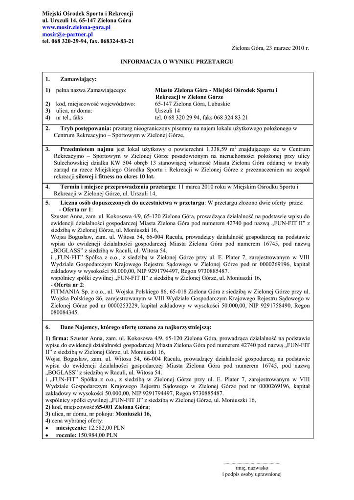 Miejski Ośrodek Sportu i Rekreacji ul. Urszuli 14, 65-147 Zielona Góra www.mosir.zielona-gora.pl [email protected] tel. 068 320-29-94, fax. 068324-83-21 Zielona Góra, 23 marzec 2010 r. INFORMACJA O WYNIKU PRZETARGU 1. Zamawiający: 1) pełna nazwa Zamawiającego: 2) kod, miejscowość województwo: 3) ulica, nr domu: 4) nr tel., faks Miasto Zielona Góra - Miejski Ośrodek Sportu i Rekreacji w Zielone Górze 65-147 Zielona Góra, Lubuskie Urszuli 14 tel. 0 68 320 29 94, faks 068 324 83 21 2. Tryb postępowania: przetarg nieograniczony pisemny na najem lokalu użytkowego położonego w Centrum Rekreacyjno – Sportowym w Zielonej Górze, 3. Przedmiotem najmu jest lokal użytkowy o powierzchni 1.338,59 m2 znajdującego się w Centrum Rekreacyjno – Sportowym w Zielonej Górze posadowionym na nieruchomości położonej przy ulicy Sulechowskiej działka KW 504 obręb 13 stanowiącej własność Miasta Zielona Góra oddanej w trwały zarząd na rzecz Miejskiego Ośrodka Sportu i Rekreacji w Zielonej Górze z przeznaczeniem na zespół rekreacji siłowej i fitness na okres 10 lat. 4. Termin i miejsce przeprowadzenia przetargu: 11 marca 2010 roku w Miejskim Ośrodku Sportu i Rekreacji w Zielonej Górze, ul. Urszuli 14, 5. Liczna osób dopuszczonych do uczestnictwa w przetargu: W przetargu złożono dwie oferty przez: - Oferta nr 1: Szuster Anna, zam. ul. Kokosowa 4/9, 65-120 Zielona Góra, prowadząca działalność na podstawie wpisu do ewidencji działalności gospodarczej Miasta Zielona Góra pod numerem 42740 pod nazwą „FUN-FIT II” z siedzibą w Zielonej Górze, ul. Moniuszki 16, Wojsa Bogusław, zam. ul. Witosa 54, 66-004 Racula, prowadzący działalność gospodarczą na podstawie wpisu do ewidencji działalności gospodarczej Miasta Zielona Góra pod numerem 16745, pod nazwą „BOGLASS” z siedzibą w Raculi, ul. Witosa 54. i „FUN-FIT” Spółka z o.o., z siedzibą w Zielonej Górze przy ul. E. Plater 7, zarejestrowanym w VIII Wydziale Gospodarczym Krajowego Rejestru Sądowego w Zielonej Górze pod nr 0000269196, kapitał zakładowy w wysokości 50.000,00, NIP 9291794497, Regon 9730885487. wspólnicy spółki cywilnej „FUN-FIT II” z siedzibą w Zielonej Górze, ul. Moniuszki 16, - Oferta nr 2: FITMANIA Sp. z o.o., ul. Wojska Polskiego 86, 65-018 Zielona Góra z siedzibą w Zielonej Górze przy ul. Wojska Polskiego 86, zarejestrowanym w VIII Wydziale Gospodarczym Krajowego Rejestru Sądowego w Zielonej Górze pod nr 0000253229, kapitał zakładowy w wysokości 50.000,00, NIP 9291758490, Regon 080084345. 6. Dane Najemcy, którego ofertę uznano za najkorzystniejszą: 1) firma: Szuster Anna, zam. ul. Kokosowa 4/9, 65-120 Zielona Góra, prowadząca działalność na podstawie wpisu do ewidencji działalności gospodarczej Miasta Zielona Góra pod numerem 42740 pod nazwą „FUN-FIT II” z siedzibą w Zielonej Górze, ul. Moniuszki 16, Wojsa Bogusław, zam. ul. Witosa 54, 66-004 Racula, prowadzący działalność gospodarczą na podstawie wpisu do ewidencji działalności gospodarczej Miasta Zielona Góra pod numerem 16745, pod nazwą „BOGLASS” z siedzibą w Raculi, ul. Witosa 54. i „FUN-FIT” Spółka z o.o., z siedzibą w Zielonej Górze przy ul. E. Plater 7, zarejestrowanym w VIII Wydziale Gospodarczym Krajowego Rejestru Sądowego w Zielonej Górze pod nr 0000269196, kapitał zakładowy w wysokości 50.000,00, NIP 9291794497, Regon 9730885487. wspólnicy spółki cywilnej „FUN-FIT II” z siedzibą w Zielonej Górze, ul. Moniuszki 16, 2) kod, miejscowość:65-001 Zielona Góra; 3) ulica, nr domu, nr pokoju: Moniuszki 16, 4) cena wybranej oferty: • miesięcznie: 12.582,00 PLN • rocznie: 150.984,00 PLN ................................................ imię, nazwisko i podpis osoby uprawnionej