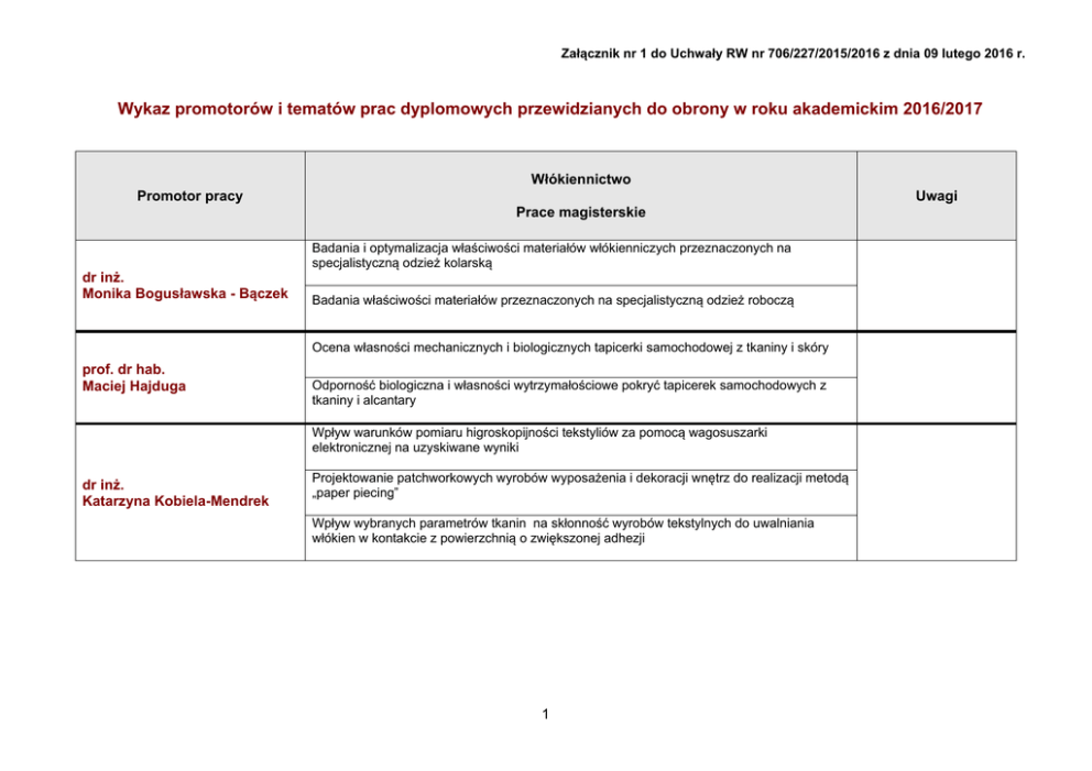 Załącznik nr 1 do Uchwały RW nr 706/227/2015/2016 z dnia 09 lutego 2016 r. Wykaz promotorów i tematów prac dyplomowych przewidzianych do obrony w roku akademickim 2016/2017 Włókiennictwo Promotor pracy Uwagi Prace magisterskie dr inż. Monika Bogusławska - Bączek Badania i optymalizacja właściwości materiałów włókienniczych przeznaczonych na specjalistyczną odzież kolarską Badania właściwości materiałów przeznaczonych na specjalistyczną odzież roboczą Ocena własności mechanicznych i biologicznych tapicerki samochodowej z tkaniny i skóry prof. dr hab. Maciej Hajduga Odporność biologiczna i własności wytrzymałościowe pokryć tapicerek samochodowych z tkaniny i alcantary Wpływ warunków pomiaru higroskopijności tekstyliów za pomocą wagosuszarki elektronicznej na uzyskiwane wyniki dr inż. Katarzyna Kobiela-Mendrek Projektowanie patchworkowych wyrobów wyposażenia i dekoracji wnętrz do realizacji metodą „paper piecing” Wpływ wybranych parametrów tkanin na skłonność wyrobów tekstylnych do uwalniania włókien w kontakcie z powierzchnią o zwiększonej adhezji 1