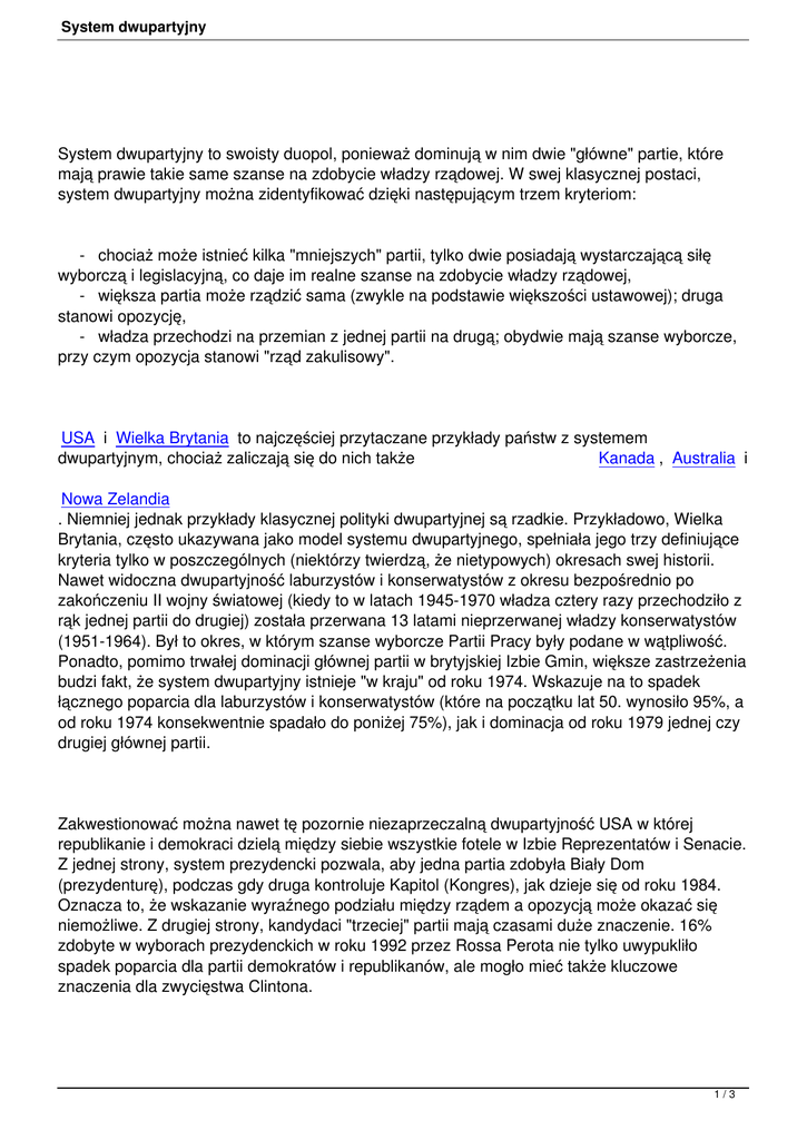 System dwupartyjny System dwupartyjny to swoisty duopol, ponieważ dominują w nim dwie "główne" partie, które mają prawie takie same szanse na zdobycie władzy rządowej. W swej klasycznej postaci, system dwupartyjny można zidentyfikować dzięki następującym trzem kryteriom: - chociaż może istnieć kilka "mniejszych" partii, tylko dwie posiadają wystarczającą siłę wyborczą i legislacyjną, co daje im realne szanse na zdobycie władzy rządowej, - większa partia może rządzić sama (zwykle na podstawie większości ustawowej); druga stanowi opozycję, - władza przechodzi na przemian z jednej partii na drugą; obydwie mają szanse wyborcze, przy czym opozycja stanowi "rząd zakulisowy". USA i Wielka Brytania to najczęściej przytaczane przykłady państw z systemem dwupartyjnym, chociaż zaliczają się do nich także Kanada , Australia i Nowa Zelandia . Niemniej jednak przykłady klasycznej polityki dwupartyjnej są rzadkie. Przykładowo, Wielka Brytania, często ukazywana jako model systemu dwupartyjnego, spełniała jego trzy definiujące kryteria tylko w poszczególnych (niektórzy twierdzą, że nietypowych) okresach swej historii. Nawet widoczna dwupartyjność laburzystów i konserwatystów z okresu bezpośrednio po zakończeniu II wojny światowej (kiedy to w latach 1945-1970 władza cztery razy przechodziło z rąk jednej partii do drugiej) została przerwana 13 latami nieprzerwanej władzy konserwatystów (1951-1964). Był to okres, w którym szanse wyborcze Partii Pracy były podane w wątpliwość. Ponadto, pomimo trwałej dominacji głównej partii w brytyjskiej Izbie Gmin, większe zastrzeżenia budzi fakt, że system dwupartyjny istnieje "w kraju" od roku 1974. Wskazuje na to spadek łącznego poparcia dla laburzystów i konserwatystów (które na początku lat 50. wynosiło 95%, a od roku 1974 konsekwentnie spadało do poniżej 75%), jak i dominacja od roku 1979 jednej czy drugiej głównej partii. Zakwestionować można nawet tę pozornie niezaprzeczalną dwupartyjność USA w której republikanie i demokraci dzielą między siebie wszystkie fotele w Izbie Reprezentatów i Senacie. Z jednej strony, system prezydencki pozwala, aby jedna partia zdobyła Biały Dom (prezydenturę), podczas gdy druga kontroluje Kapitol (Kongres), jak dzieje się od roku 1984. Oznacza to, że wskazanie wyraźnego podziału między rządem a opozycją może okazać się niemożliwe. Z drugiej strony, kandydaci "trzeciej" partii mają czasami duże znaczenie. 16% zdobyte w wyborach prezydenckich w roku 1992 przez Rossa Perota nie tylko uwypukliło spadek poparcia dla partii demokratów i republikanów, ale mogło mieć także kluczowe znaczenia dla zwycięstwa Clintona. 1/3 System dwupartyjny Polityka dwupartyjna była kiedyś postrzegana jako najpewniejszy sposób na pogodzenie otwartości z porządkiem, rządu reprezentatywnego z rządem skutecznym. Jej główną zaletą jest fakt, że umożliwia istnienie systemu rządów partii, charakteryzujących się rzekomo stabilnością, możliwością wyboru i odpowiedzialnością. Dwie główne partie są w stanie zaoferować wyborcom prosty wybór pomiędzy rywalizującymi programami i odmiennymi rządami. Wyborcy mogą popierać partię, wiedząc, że jeśli wygra wybory, będzie miała możliwość dotrzymania obietnic programowych bez potrzeby negocjowania czy osiągania kompromisów z koalicyjnymi partnerami. Jest to czasem postrzegane jako jedna z zalet większościowych systemów wyborczych, które wyolbrzymiają poparcie dla dużych partii. Systemy dwupartyjne są także wychwalane za dostarczanie silnego, lecz odpowiedzialnego rządu, opartego na niesłabnącej rywalizacji pomiędzy partiami rządzącymi a znajdującymi się w opozycji. Mimo że rząd może sprawować władzę, nigdy nie może pozwolić sobie na odpoczynek ani na samozadowolenie, ponieważ cały czas jest konfrontowany przez opozycję, która działa jak rząd "w pogotowiu". Ponadto dwupartyjność sprzyja umiarkowaniu, jako że dwoje rywali o władzę musi walczyć o głosy niezdecydowanego elektoratu z centrum. Było to widoczne w tak zwanej zgodzie socjaldemokratycznej, która przeważała w Wielkiej Brytanii w latach 50. i 60. XX wieku. Jednakże od lat 70. polityka dwupartyjna i rządy partii nie cieszą się wielkim szacunkiem. Zamiast zagwarantować umiarkowanie, systemy dwupartyjne, takie jak Wielka Brytania, wykazują okresową tendencję do uprawiania polityki konfrontacji. Przejawia się to w ideologicznej polaryzacji i przykładaniu dużej wagi do konfliktu i kłótni, a nie do zgody i kompromisu. W Wielkiej Brytanii najlepszym tego przykładem było mające miejsce na początku lat 80. XX wieku przesunięcie pozostającej pod wpływem Margaret Thatcher Partii Konserwatywnej w prawą, a radykalnej Partii Pracy w lewą stronę, pomimo tego, że wkrótce pojawiło się nowe, postthatcherowskie porozumienie. Antagonistyczną dwupartyjność często wyjaśnia się poprzez odniesienie do klasowej natury poparcia partyjnego (przy czym konflikt partyjny jest ostatecznie postrzegany jako odbicie walki klas) lub jako skutek demokratyzacji partii i wpływu ideologicznie zaangażowanych aktywistów należących do szeregowych członków. Kolejnym problemem dotyczącym systemu dwupartyjnego jest fakt, że dwie dorównujące sobie partie są zachęcane do rywalizacji o głosy poprzez prześciganie się w wyborczych obietnicach, co powoduje być może rosnące w niekontrolowany sposób wydatki publiczne i napędza inflację. Sprowadza się to do nieodpowiedzialnych rządów partii, jako że partie dochodzą do władzy na podstawie programów wyborczych, których nie są w stanie spełnić. Ostatnią wadą systemu dwupartyjnego są oczywiste ograniczenia, jakie wprowadzają pod względem opcji wyborczej i ideologicznej. Podczas gdy wybór między zaledwie dwoma programami rządu w czasach zbieżności stronników i solidarności klasowej był może wystarcza