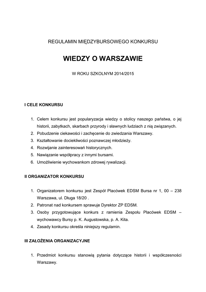 REGULAMIN MIĘDZYBURSOWEGO KONKURSU WIEDZY O WARSZAWIE W ROKU SZKOLNYM 2014/2015 I CELE KONKURSU 1. Celem konkursu jest popularyzacja wiedzy o stolicy naszego państwa, o jej historii, zabytkach, skarbach przyrody i sławnych ludziach z nią związanych. 2. Pobudzenie ciekawości i zachęcenie do zwiedzania Warszawy. 3. Kształtowanie dociekliwości poznawczej młodzieży. 4. Rozwijanie zainteresowań historycznych. 5. Nawiązanie współpracy z innymi bursami. 6. Umożliwienie wychowankom zdrowej rywalizacji. II ORGANIZATOR KONKURSU 1. Organizatorem konkursu jest Zespół Placówek EDSM Bursa nr 1, 00 – 238 Warszawa, ul. Długa 18/20 . 2. Patronat nad konkursem sprawuje Dyrektor ZP EDSM. 3. Osoby przygotowujące konkurs z ramienia Zespołu Placówek EDSM – wychowawcy Bursy p. K. Augustowska, p. A. Kita. 4. Zasady konkursu określa niniejszy regulamin. III ZAŁOŻENIA ORGANIZACYJNE 1. Przedmiot konkursu stanowią pytania dotyczące historii i współczesności Warszawy. 2. Miejscem przeprowadzenia konkursu jest siedziba organizatora. 3. Termin Konkursu marzec 2015 r. 4. Konkurs jest otwarty dla wychowanek/wychowanków burs z terenu Warszawy. 5. Uczestników konkursy należy zgłosić do 28.02.2015 r. mailowo, telefonicznie lub faxem. IV FORMA I ZASADY KONKURSU 1. Konkurs zostanie przeprowadzony dnia 09.03.2015r. o godz. 19.30 w Bursie nr 1 w Warszawie. 2. Prace konkursowe sprawdza i wyłania finalistów komisja w składzie : przewodniczący – dyrektor placówki, członkowie – wychowawcy przygotowujący konkurs oraz opiekunowie wytypowani przez każdą placówkę. 3. Konkurs odbędzie się dwuetapowo. 4. Etap I - test wyboru odpowiedzi oraz pytania otwarte. 5. Etap II – do drugiego etapu przejdzie pięciu uczestników, którzy uzyskają najwyższą liczbę punktów. 6. W II etapie uczestnicy konkursu będą odpowiadali na pytania w formie teleturnieju. 7. W przypadku uzyskania takiej samej liczby punktów przez więcej niż 1 osobę odbędzie się dogrywka. 8. Wyniki konkursu zostaną ogłoszone w dniu jego odbycia. Jednocześnie odbędzie się wręczenie nagrody dla zwycięzcy. V NAGRODY 1. Nagrodę Dyrektora Bursy nr 1 i Tytuł - „Omnibus warszawski roku szkolnego 2014/2015” uzyska uczestnik, który zdobędzie najwyższą liczbę punktów w obu etapach. 2. Nagrodą główną będzie voucher na weekendowy pobyt dla 3 osób w Europejskim Domu Spotkań Młodzieży oraz album o Warszawie. Pozostałych dwóch finalistów również zostanie uhonorowanych nagrodami w postaci wydawnictw książkowych o Warszawie. Wszystkich przybyłych czeka słodki poczęstunek. 3. Informacje o wynikach konkursu zostaną umieszczone na stronie internetowej Bursy nr 1. Organizatorzy bardzo serdecznie zachęcają do szlachetnej rywalizacji na gruncie wiedzy o stolicy.