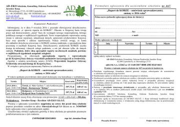 Formularz zgłoszenia dla uczestników szkolenia nr 467 AD–EKO Szkolenia, Konsulting, Ochrona Środowiska Jarosław Knop ul. Słowackiego 27/33, 42-200 Częstochowa tel. +48 343605683, faks +48 343605669, kom. +48 606482005 www.ad-eko.pl [email protected] NIP: 573-227-24-56 „Raport do KOBiZE – omówienie sprawozdawczości, zmiany w 2016 roku” Pełna nazwa jednostki zgłaszającej (dane do faktury): …………………………………………………………………..……………………….…….. Szanowni Państwo! …………………………………………………………………..……………………….…….. Informujemy, że w dniu 9 września 2016 r. przestało obowiązywać dotychczasowe rozporządzenie „w sprawie raportu do KOBiZE”. Obecnie w Krajowej bazie trwają prace nad dostosowaniem „starej” bazy do wymagań nowego rozporządzenia, którego publikacja nastąpi w najbliższych tygodniach. Nowe rozporządzenie wprowadza szereg zmian w zakresie rejestracji, aktualizacji danych, uprawnień użytkowników Krajowej bazy oraz sposobu i zakresu raportowania. Należy zwrócić uwagę, że konta dla zakładów dotychczas utworzone w KOBiZE zostaną zamknięte, a zgromadzone dane pozostaną w zasobach Krajowej bazy. Dotychczasowy użytkownik KOBiZE uzyska dostęp do informacji i danych całego podmiotu, a nie jak obecnie tylko do danych zakładu. Podmioty, które chcą sporządzić raporty na obecnych zasadach, powinny w najbliższych tygodniach uzupełnić zaległości. Przypominamy, że obowiązek sporządzania raportu i wprowadzania go do Krajowej bazy dotyczy wszystkich podmiotów korzystających ze środowiska. Zgodnie z ostatnią nowelizacją ustawy (USZE) Wojewódzki Inspektor Ochrony Środowiska otrzymał dostęp do Krajowej bazy. W związku z powyższym zapraszamy Państwa na szkolenie: adres: ..………………………………………………………….…………………...….…….. „Raport do KOBiZE – omówienie sprawozdawczości, zmiany w 2016 roku” W trakcie spotkania przewidziano także panel dyskusyjny oraz konsultacje z wykładowcą. Termin Miejsce Toruń, ul. Małe Garbary 7, sala konferencyjna, Hotel - Restauracja "Heban" Bydgoszcz, ul. Rumińskiego 6, sala 209, 30.11.2016 r. godz. 10:00-15:00 Bydgoski Dom Technika NOT 29.11.2016 r. godz. 10:00-15:00 Koszt netto Koszt brutto (z 23% VAT) 357,72 zł 440 zł / os. 357,72 zł 440 zł / os. Stałych klientów naszej firmy obowiązuje cena promocyjna: 317,07 + 23% VAT = 390 zł/os. Wykładowca: Jarosław Knop - Dyrektor AD-EKO S.K.O.Ś. Prosimy o zgłaszanie uczestników najpóźniej na cztery dni przed datą szkolenia poprzez przesłanie e-mailem na adres: [email protected] lub faksem na nr: 343605669 karty zgłoszenia wraz z potwierdzeniem zapłaty. Umożliwiamy również zapłacenie gotówką w dniu szkolenia po uprzednim pisemnym poinformowaniu nas o tym zamiarze. Z WYRAZAMI SZACUNKU mgr inż. Jarosław Knop tel. ............................................................... fax: ....................................................................... NIP: ............................................................ e-mail: .................................................................. Osoby zgłaszane na szkolenie: Lp. Imię Nazwisko Termin Miasto 1. 2. opłatę należy wpłacić na konto: AD–EKO Szkolenia, Konsulting, Ochrona Środowiska Jarosław Knop 42-200 Częstochowa, ul. Słowackiego 27/33 mBANK S.A. ŁÓDŹ nr 13 1140 2017 0000 4302 0243 0411 Prosimy o wpisanie numeru szkolenia (nr 467) na przelewie bankowym. Przesłanie wypełnionego formularza stanowi prawnie wiążące zobowiązanie do uczestnictwa w szkoleniu oraz pokrycia jego kosztów. Niedokonanie opłaty za szkolenie nie oznacza rezygnacji ze szkolenia. Nieobecność uczestnika podczas szkolenia nie zwalnia z obowiązku uiszczenia opłaty za szkolenie Uczestnikowi przysługuje zwrot całości wpłaconej kwoty w przypadku pisemnej rezygnacji ze szkolenia, jednak nie później niż 3 dni przed datą rozpoczęcia szkolenia. Po tym terminie wpłaty nie podlegają zwrotowi. Prosimy o przesłanie stosownego oświadczenia w przypadku, gdy szkolenie finansowane jest w co najmniej 70% ze środków publicznych (środki unijne i/lub budżetowe) i jest ono zwolnione z podatku VAT. Upoważniamy AD-EKO Szkolenia, Konsulting, Ochrona Środowiska Jarosław Knop do wystawienia faktury VAT bez naszego podpisu. Wyrażamy zgodę na otrzymywanie od AD-EKO S.K.O.Ś. J. Knop informacji handlowych drogą elektroniczną w rozumieniu ustawy o świadczeniu usług drogą elektroniczną oraz na przetwarzanie danych w celach marketingowych. …………………..………..…………… Pieczątka firmowa ….……………………...…….……....… Podpis osoby upoważnionej