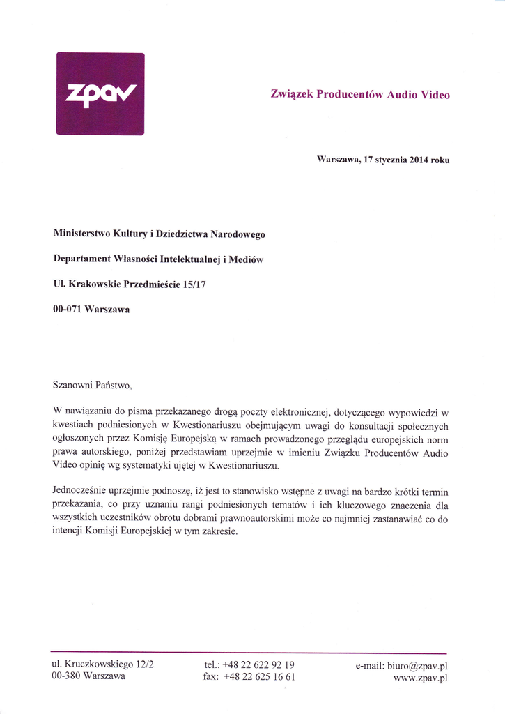 Związek Producentów Audio Video Warszawa, l7 sĘcznia 2014 roku Ministerstwo Kultury i Dziedzictwa Narodowego Depańament WłasnościIntelektualnej i Mediów Ul. Krakowskie Przedmieście l5ll7 00-071 Warszawa Szanowni Państwo, W nawiązaniu do pisma przekazanego drogą poczty elektronicznej, dotyczącego wypowiedzi w kwestiach podniesionych w Kwestionariuszu obejmującym uwagi do konsultacji społecznych ogłoszonychprzez Komisję Europejską w ramach prowadzonego przeglądu europejskich norm prawa autorskiego, ponizej przedstawiam uprzejmie w imieniu Związku Producentów Audio Video opinię wg systematyki ujętej w Kwestionariuszu. Jednocześnie uprzejmie podnoszę' iz jest to stanowisko wstępne zvwagl nabardzo krótki termin przekazania, co ptzy uznaniu rangi podniesionych tematów i ich kluczowego znaczenia dla wszystkich uczestników obrotu dobrami prawnoautorskimi moŻe co najmniej zastanawiaó co do intencji Komisji Europejskiej w tym zakresie. ul. Kruczkowskiego 1212 00-380 Warszawa tel.: +48 22 622 9219 fax: +48 22 625 16 6l e-mail: [email protected] www.zpav.pl UWAGI ZPAV: I.1. Terytorialność prawa autorskiego Nie mamy informacji o jakichkolwiek problemach przy probie korzystania z serwisów online operujących w krajach członkowskich UE poza Polską. Trudności pojawiają się natomiast ptzy próbie świadczenia usług transgranicznych w zakresie dostarczania muzyki online w obrębie UE - najwaŻniejszą barierą w rozwoju muzycznych serwisów cyfrowych jest zjawisko piractwa internetowego, które w Znacznym stopniu utrudnia takim serwisom podjęcie i rozwijanie dzlaŁania w krajach, w których powszechnie funkcjonują strony i serwisy oferujące nieautoryzowaną muzykę. Wytwórnie płytowe regularnie udzielają, bezpośrednio lub za poŚrednictwem organizacji zbiorowego zarządzania, licencji transgranicznych w obrębie UE na wykorzystanie praw do nagrań dźwiękowych. Przemysł fonograficzny promuje legalne serwisy i popiera jak najszerszą ich obecnośó na jak największej liczbie rynków. Praktyka pokazuje jednak, że wiele platform cyfrowych decyduje się na stopniowe wejŚcie na kolejne rynki - ze względów komercyjnych i w celu jak najlepszego przystosowania swoich serwisów do oczekiwań i upodobań konsumentów w kazdym kraju. Nawet największe firmy' dysponujące ogromnymi nakładami, takie jak Apple i Google, opóźniały pojawianie się na poszczegolnych rynkach. Jak wszystkie firmy, serwisy cyfrowe mają swoją politykę zarządzania rozwojem firmy' która uwzględnia Szefeg ęlementów biznesu, takich jak np. testowanie nowych modeli biznesowych, koszty infrastruktury (organizowanie lokalnych filii, marketing, komunikacj a), nawiązywanie współpracy z lokainymi dostawcami usług internetowych i reklamodawcami, przygotowanie lokalnych wersji językowych, dystrybucji, systemu raportowania i płatności.Kluczowym elemęntem sukcesu serwisu muzycznego online jest minimalizowanie dystansu do lokalnego konsumenta - zdarza się, że serwisy decydują się np. naza-warcie w swojej ofercie jedynie katalogu specyficznego dla lokalnej grupy odbiorców. Pospieszne i nieprzygotowane wejŚcie na rynek' bez dobrego marketingu i testowania lokalnych reakcji rynkowych, może prowadzic do upadku serwisu. Jak zaprezentowano podczas inicjatywy Komisji Europejskiej ,,Licencje dla Europy" i podczas obrad grup roboczych w ramach tej inicjatywy, w ostatnich latach przemysł fonograficzny przeprowadził rewolucyjne zmiany i Europa staje się dziśpodstawowym centrum kreatywności dla sektora muzycznęgo na całym świecie. Europejski rynek muzyki cyfrowej wztósł znacząco w ostatnich pięciu latach (od 200 mln euro w 2004 roku do |,2 mld euro w 2012 roku) i wzbogacił swoją ofertę. Ta zmtana była moŻliwa dzięki licencjom multiterytorialnym i globalnemu wsparciu. ul. Kruczkowskiego I2l2 00-380 Warszawa tel.: +48 22 6ŻŻ 92 19 fax: +48 22625 16 61 e-mail: [email protected] www.zpav.pl Działalnośćcyfrowych serwisów muzycznych osiągnęła niezwykłą skalę w krótkim czasie,takŻe w Europie. Dziśw Europie dostępnych jest267 serwisów o rożnych formach świadczeniausług _ ich katalog to ponad 30 mln utworów, a oferta jest ciągle poszetzana. Pięó największych serwisów - iTunes, Deezer, 7Digital, Youtube, MySpace - dostępnych jest w całej Europie. Serwis Spotify dostępny jest w 25 krajach europej skich, w tym w Polsce, a inne serwisy są takŻe szeroko dostępne: XBoxMusic w 27 krajach, Rara w 20, eMusic w 25, GooglePlay w 10. Ltczba dostępnych w Europie sęrwisów ciągle rośnie. Wiele czołowych serwisów na świecieto serwisy europejskie: Spotiff, Deezer, Last.FM, 7digital. Do rozwoju swojej działalnościniezbędna jest im skuteczna ochrona praw autorskich i pokrewnych. Decyzja serwisów o rozpoczynaniu działalnościkolejno w poszczególnych krajach' a nie w jednocześnie w całej Europie, nie jest podyktowana względami związanymi Z prawem autorskim, ale raczej jest związafia z różnorodnością europejskiej kultury i zróżnicowaniem rynków. W celu zaśrozwiązania najwaŻniejszego problemu _ piractwa internetowe go - na|eŻy wzmocnió skutecznośó środków słuŻących egzekwowaniu prawa (vide uwagi w pkt. I.7). Przemysł fonograficzny dostarcza szereg narzędzi informacyjnych, które mają podnieśó świadomośczwiązaną z dostępnością serwisów muzycznych w Polsce i Europie (np. inicjatywa Sektor fonograficzny nie popiera wprowadzania restrykcji terytorialnych. Wytwórnie płytowe l;rdzielają transgranicznych licencji i udostępniają swój repertuar na wszystkich rynkach' na których mają do tego prawo. Ewentualna odmowa udzielenia praw moŻe wynikać jedynie z że firma nie posiada praw na dane terytorium. Nie należy mylió terytorialnego definiowania praw z ograniczeniami terytorialnymi. Europejski system prawny w zakresie praw autorskich jest oparty o prawa udzielane właścicielompraw w każdym państwie członkowskim, ale n