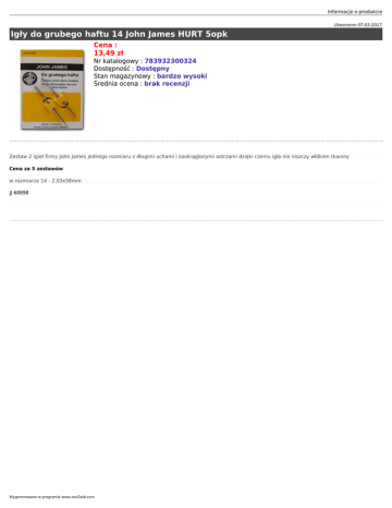 Informacje o produkcie Utworzono 07-03-2017 Igły do grubego haftu 14 John James HURT 5opk Cena : 13,49 zł Nr katalogowy : 783932300324 Dostępność : Dostępny Stan magazynowy : bardzo wysoki Średnia ocena : brak recenzji Zestaw 2 igieł firmy John James jednego rozmiaru z długimi uchami i zaokrąglonymi ostrzami dzięki czemu igła nie niszczy włókien tkaniny Cena za 5 zestawów w rozmiarze 14 - 2.03x58mm JJ 68898 Wygenerowano w programie www.oscGold.com