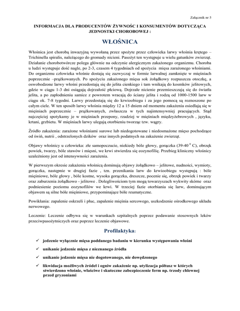 Załącznik nr 5 INFORMACJA DLA PRODUCENTÓW ŻYWNOŚC I KONSUMENTÓW DOTYCZĄCA JEDNOSTKI CHOROBOWEJ : WŁOŚNICA Włośnica jest chorobą inwazyjną wywołaną przez spożyte przez człowieka larwy włośnia krętego – Trichinella spiralis, należącego do gromady nicieni. Pasożyt ten występuje u wielu gatunków zwierząt. Działanie chorobotwórcze polega głównie na odczynie alergicznym zakażonego organizmu. Choroba u ludzi występuje dość nagle, po 2-3, czasem 4 tygodniach od spożycia mięsa zarażonego włośniami. Do organizmu człowieka włośnie dostają się zazwyczaj w formie larwalnej zamknięte w mięśniach poprzecznie –prążkowanych. Po spożyciu zakażonego mięsa sok żołądkowy rozpuszcza otoczkę, a oswobodzone larwy włośni przedostają się do jelita cienkiego i tam wnikają do kosmków jelitowych, gdzie w ciągu 1-3 dni osiągają dojrzałość płciową. Dojrzałe nicienie przemieszczają się do światła jelita, a po zapłodnieniu samice z powrotem wracają do ściany jelita i rodzą od 1000-1500 larw w ciągu ok. 7-8 tygodni. Larwy przedostają się do krwioobiegu i za jego pomocą są roznoszone po całym ciele. W ten sposób larwy włośnia między 12 a 15 dniem od momentu zakażenia osiedlają się w mięśniach poprzecznie – prążkowanych, zwłaszcza w tych najintensywniej pracujących. Stąd najczęściej spotykamy je w mięśniach przepony, rzadziej w mięśniach międzyżebrowych , języku, krtani, grzbietu. W mięśniach larwy ulegają otorbieniu tworząc tzw. wągry. Źródło zakażenia: zarażone włośniami surowe lub niedogotowane i niedosmażone mięso pochodzące od świń, nutrii , odstrzelonych dzików oraz innych podatnych na zakażenie zwierząt. Objawy włośnicy u człowieka: złe samopoczucie, niekiedy bóle głowy, gorączka (39-40 0 C), obrzęk powiek, twarzy, bóle stawów i mięsni, we krwi stwierdza się eozynofilię. Przebieg kliniczny włośnicy uzależniony jest od intensywności zarażenia. W pierwszym okresie zakażenia włośnicą dominują objawy żołądkowo – jelitowe, nudności, wymioty, gorączka, następnie w drugiej fazie , tzn. przenikania larw do krwioobiegu występują : bóle mięśniowe, bóle głowy , bóle kostne, wysoka gorączka, dreszcze, pocenie się, obrzęk powiek i twarzy oraz zaburzenia żołądkowo - jelitowe . Dolegliwościom tym mogą towarzyszach wykwity skórne oraz podniesienie poziomu eozynofilów we krwi. W trzeciej fazie otorbiania się larw, dominującym objawem są silne bóle mięśniowe, przypominające bóle reumatyczne. Powikłania: zapalenie oskrzeli i płuc, zapalenie mięśnia sercowego, uszkodzenie ośrodkowego układu nerwowego. Leczenie: Leczenie odbywa się w warunkach szpitalnych poprzez podawanie stosownych leków przeciwpasożytniczych oraz poprzez leczenie objawowe. Profilaktyka: jedzenie wyłącznie mięsa poddanego badaniu w kierunku występowania włośni unikanie jedzenie mięsa z nieznanego źródła unikanie jedzenie mięsa nie dogotowanego, nie dowędzonego likwidacja możliwych źródeł i ogniw zakażenie np. utylizacja półtusz w których stwierdzono włośnie, właściwe i skuteczne zabezpieczenie ferm np. trzody chlewnej przed gryzoniami