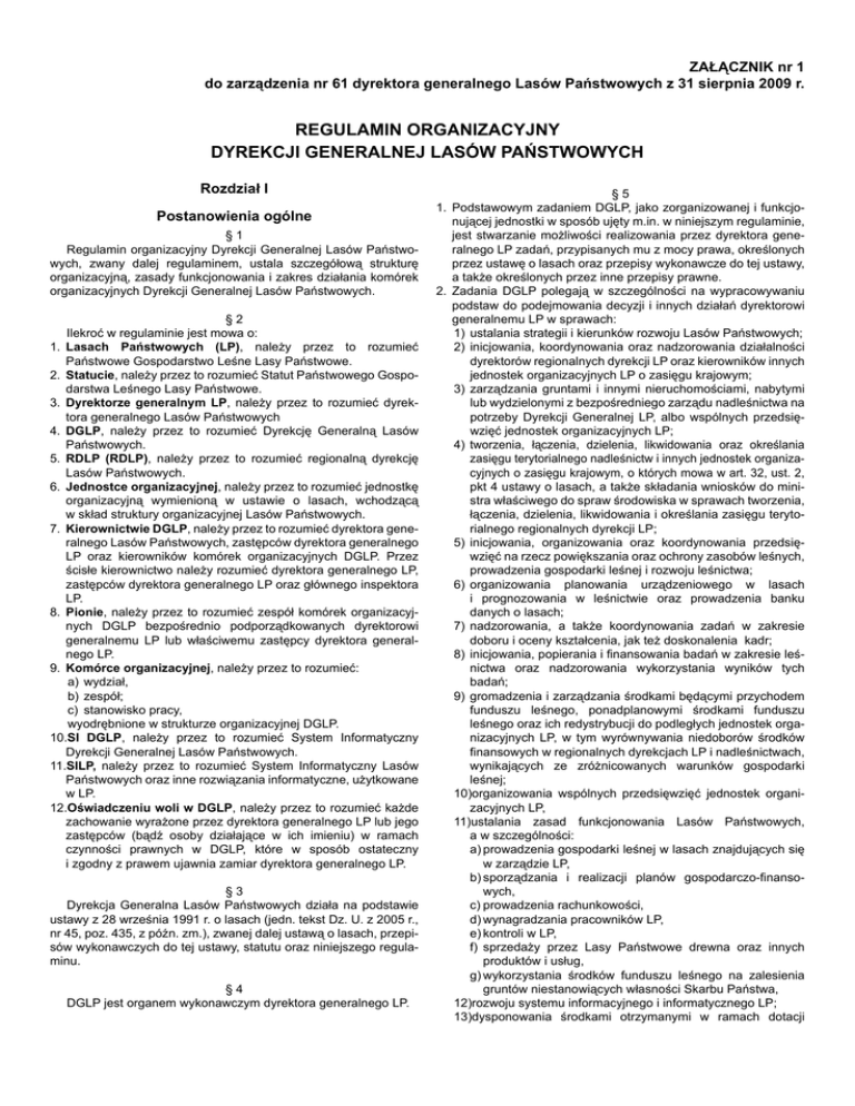ZAŁĄCZNIK nr 1 do zarządzenia nr 61 dyrektora generalnego Lasów Państwowych z 31 sierpnia 2009 r. REGULAMIN ORGANIZACYJNY DYREKCJI GENERALNEJ LASÓW PAŃSTWOWYCH Rozdział I Postanowienia ogólne §1 Regulamin organizacyjny Dyrekcji Generalnej Lasów Państwowych, zwany dalej regulaminem, ustala szczegółową strukturę organizacyjną, zasady funkcjonowania i zakres działania komórek organizacyjnych Dyrekcji Generalnej Lasów Państwowych. §2 Ilekroć w regulaminie jest mowa o: 1. Lasach Państwowych (LP), należy przez to rozumieć Państwowe Gospodarstwo Leśne Lasy Państwowe. 2. Statucie, należy przez to rozumieć Statut Państwowego Gospodarstwa Leśnego Lasy Państwowe. 3. Dyrektorze generalnym LP, należy przez to rozumieć dyrektora generalnego Lasów Państwowych 4. DGLP, należy przez to rozumieć Dyrekcję Generalną Lasów Państwowych. 5. RDLP (RDLP), należy przez to rozumieć regionalną dyrekcję Lasów Państwowych. 6. Jednostce organizacyjnej, należy przez to rozumieć jednostkę organizacyjną wymienioną w ustawie o lasach, wchodzącą w skład struktury organizacyjnej Lasów Państwowych. 7. Kierownictwie DGLP, należy przez to rozumieć dyrektora generalnego Lasów Państwowych, zastępców dyrektora generalnego LP oraz kierowników komórek organizacyjnych DGLP. Przez ścisłe kierownictwo należy rozumieć dyrektora generalnego LP, zastępców dyrektora generalnego LP oraz głównego inspektora LP. 8. Pionie, należy przez to rozumieć zespół komórek organizacyjnych DGLP bezpośrednio podporządkowanych dyrektorowi generalnemu LP lub właściwemu zastępcy dyrektora generalnego LP. 9. Komórce organizacyjnej, należy przez to rozumieć: a) wydział, b) zespół; c) stanowisko pracy, wyodrębnione w strukturze organizacyjnej DGLP. 10.SI DGLP, należy przez to rozumieć System Informatyczny Dyrekcji Generalnej Lasów Państwowych. 11.SILP, należy przez to rozumieć System Informatyczny Lasów Państwowych oraz inne rozwiązania informatyczne, użytkowane w LP. 12.Oświadczeniu woli w DGLP, należy przez to rozumieć każde zachowanie wyrażone przez dyrektora generalnego LP lub jego zastępców (bądź osoby działające w ich imieniu) w ramach czynności prawnych w DGLP, które w sposób ostateczny i zgodny z prawem ujawnia zamiar dyrektora generalnego LP. §3 Dyrekcja Generalna Lasów Państwowych działa na podstawie ustawy z 28 września 1991 r. o lasach (jedn. tekst Dz. U. z 2005 r., nr 45, poz. 435, z późn. zm.), zwanej dalej ustawą o lasach, przepisów wykonawczych do tej ustawy, statutu oraz niniejszego regulaminu. §4 DGLP jest organem wykonawczym dyrektora generalnego LP. §5 1. Podstawowym zadaniem DGLP, jako zorganizowanej i funkcjonującej jednostki w sposób ujęty m.in. w niniejszym regulaminie, jest stwarzanie możliwości realizowania przez dyrektora generalnego LP zadań, przypisanych mu z mocy prawa, określonych przez ustawę o lasach oraz przepisy wykonawcze do tej ustawy, a także określonych przez inne przepisy prawne. 2. Zadania DGLP polegają w szczególności na wypracowywaniu podstaw do podejmowania decyzji i innych działań dyrektorowi generalnemu LP w sprawach: 1) ustalania strategii i kierunków rozwoju Lasów Państwowych; 2) inicjowania, koordynowania oraz nadzorowania działalności dyrektorów regionalnych dyrekcji LP oraz kierowników innych jednostek organizacyjnych LP o zasięgu krajowym; 3) zarządzania gruntami i innymi nieruchomościami, nabytymi lub wydzielonymi z bezpośredniego zarządu nadleśnictwa na potrzeby Dyrekcji Generalnej LP, albo wspólnych przedsięwzięć jednostek organizacyjnych LP; 4) tworzenia, łączenia, dzielenia, likwidowania oraz określania zasięgu terytorialnego nadleśnictw i innych jednostek organizacyjnych o zasięgu krajowym, o których mowa w art. 32, ust. 2, pkt 4 ustawy o lasach, a także składania wniosków do ministra właściwego do spraw środowiska w sprawach tworzenia, łączenia, dzielenia, likwidowania i określania zasięgu terytorialnego regionalnych dyrekcji LP; 5) inicjowania, organizowania oraz koordynowania przedsięwzięć na rzecz powiększania oraz ochrony zasobów leśnych, prowadzenia gospodarki leśnej i rozwoju leśnictwa; 6) organizowania planowania urządzeniowego w lasach i prognozowania w leśnictwie oraz prowadzenia banku danych o lasach; 7) nadzorowania, a także koordynowania zadań w zakresie doboru i oceny kształcenia, jak też doskonalenia kadr; 8) inicjowania, popierania i finansowania badań w zakresie leśnictwa oraz nadzorowania wykorzystania wyników tych badań; 9) gromadzenia i zarządzania środkami będącymi przychodem funduszu leśnego, ponadplanowymi środkami funduszu leśnego oraz ich redystrybucji do podległych jednostek organizacyjnych LP, w tym wyrównywania niedoborów środków finansowych w regionalnych dyrekcjach LP i nadleśnictwach, wynikających ze zróżnicowanych warunków gospodarki leśnej; 10)organizowania wspólnych przedsięwzięć jednostek organizacyjnych LP, 11)ustalania zasad funkcjonowania Lasów Państwowych, a w szczególności: a)prowadzenia gospodarki leśnej w lasach znajdujących się w zarządzie LP, b)sporządzania i realizacji planów gospodarczo-finansowych, c)prowadzenia rachunkowości, d)wynagradzania pracowników LP, e)kontroli w LP, f) sprzedaży przez Lasy Państwowe drewna oraz innych produktów i usług, g)wykorzystania środków funduszu leśnego na zalesienia gruntów niestanowiących własności Skarbu Państwa, 12)rozwoju systemu informacyjnego i informatycznego LP; 13)dysponowania środkami otrzymanymi w ramach dotacji na zadania zlecone przez administrację rządową oraz środkami (dotacjami i pożyczkami) z budżetów państwowych, funduszy celowych, środkami pomocy zagranicznej, jak też otrzymanymi z innych źródeł, stosownie do umów, porozumień i zobowiązań ciążących na DGLP; 14)kształtowania struktury zatrudnienia w Lasach Państwowych; 15)kontroli jednostek organi