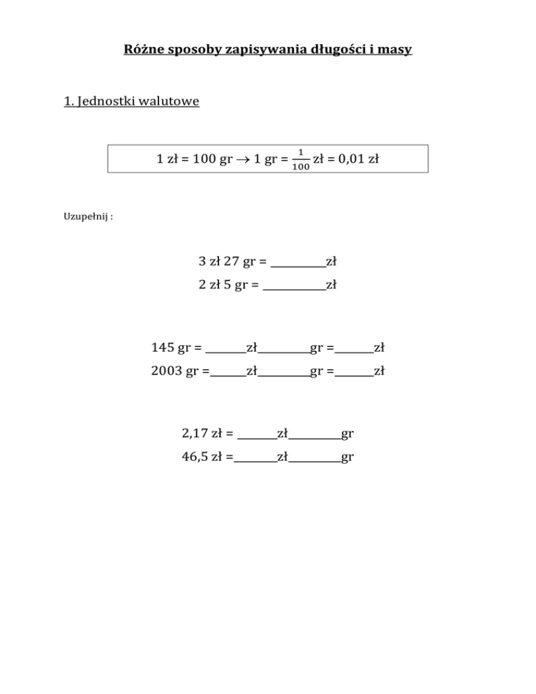 Różne sposoby zapisywania długości i masy 1. Jednostki walutowe 1 zł = 100 gr → 1 gr = zł = 0,01 zł Uzupełnij : 3 zł 27 gr = zł 2 zł 5 gr = zł 145 gr = zł gr = zł 2003 gr = zł gr = zł 2,17 zł = zł gr 46,5 zł = zł gr 2. Jednostki długości 1 cm = 10 mm → 1 mm = cm = 0,1 cm 1 dm = 10 cm → 1 cm = dm = 0,1 dm 1 m = 100 cm → 1 cm = m = 0,01 m 1 m = 10 dm → 1 dm = 1 km = 1000 m → 1 m = m = 0,1 m km = 0,001 km Uzupełnij : 5 cm 2 mm = cm 10 dm 3 cm = dm 5 m 2 dm = m 4 m 6 cm = m 6 km 20 m = km 17 mm = cm 22 mm = m 13 dm = m 1125 m = km 18,5 cm = cm mm 8,6 dm = dm cm 12,07 m = m cm 39,2 m = m cm 3,8 km = km m 3. Jednostki masy 1 dag = 10 g → 1 g = dag = 0,1 dag 1 kg = 100 dag → 1 dag = 1 kg = 1000 g → 1 g = kg = 0,01 kg kg = 0,001 kg 1 t = 1000 kg → 1 kg = t = 0,001 t Uzupełnij : 3 dag 7 g = dag kg 15 kg 35 dag = 12 kg 25 g = kg 4 t 300 kg = t 25 g = dag 105 g = kg 225 kg = 12,3 dag = 5,03 kg = t dag kg g dag 18,1 kg = kg g 3,21 t = t kg