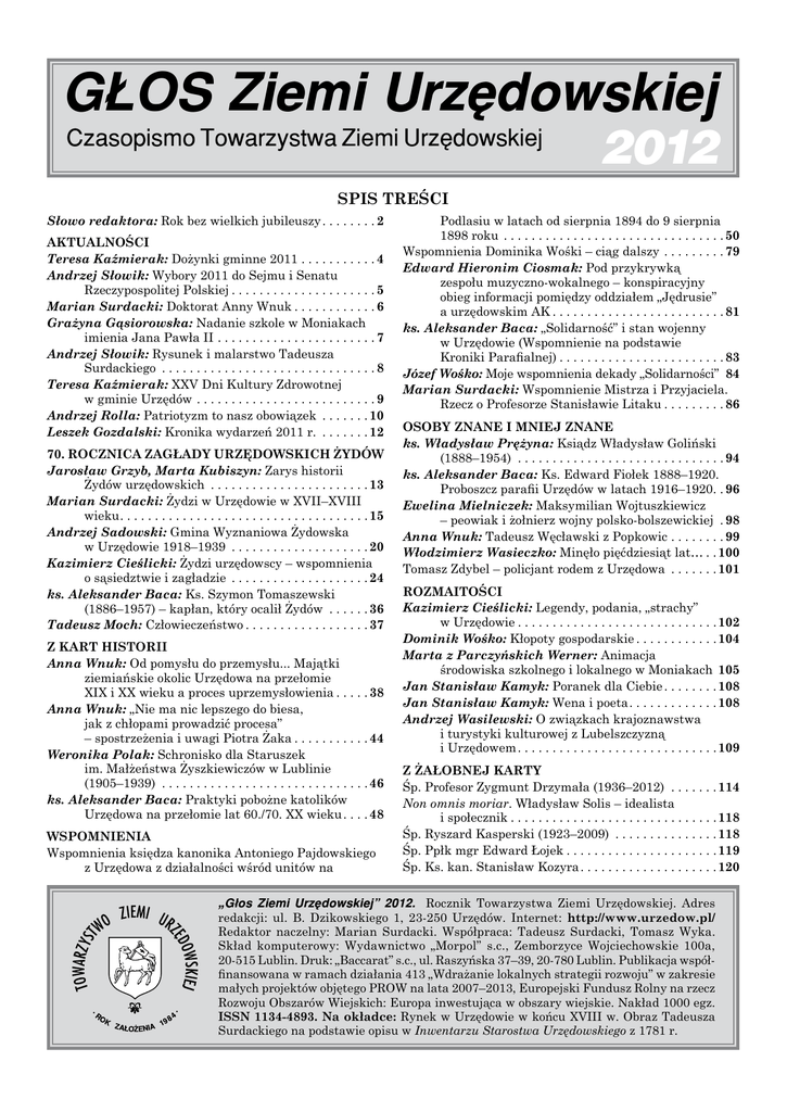 2012 Głos Ziemi Urzędowskiej G£OS Ziemi Urzêdowskiej Czasopismo Towarzystwa Ziemi Urzêdowskiej 1 2012 SPIS TREŚCI Słowo redaktora: Rok bez wielkich jubileuszy . . . . . . . 2 AKTUALNOŚCI Teresa Kaźmierak: Dożynki gminne 2011 . . . . . . . . . . . 4 Andrzej Słowik: Wybory 2011 do Sejmu i Senatu Rzeczypospolitej Polskiej . . . . . . . . . . . . . . . . . . . . 5 Marian Surdacki: Doktorat Anny Wnuk . . . . . . . . . . . 6 Grażyna Gąsiorowska: Nadanie szkole w Moniakach imienia Jana Pawła II . . . . . . . . . . . . . . . . . . . . . . . 7 Andrzej Słowik: Rysunek i malarstwo Tadeusza Surdackiego . . . . . . . . . . . . . . . . . . . . . . . . . . . . . . . 8 Teresa Kaźmierak: XXV Dni Kultury Zdrowotnej w gminie Urzędów . . . . . . . . . . . . . . . . . . . . . . . . . . 9 Andrzej Rolla: Patriotyzm to nasz obowiązek . . . . . . . 10 Leszek Gozdalski: Kronika wydarzeń 2011 r. . . . . . . . 12 70. ROCZNICA ZAGŁADY URZĘDOWSKICH ŻYDÓW Jarosław Grzyb, Marta Kubiszyn: Zarys historii Żydów urzędowskich . . . . . . . . . . . . . . . . . . . . . . . 13 Marian Surdacki: Żydzi w Urzędowie w XVII–XVIII wieku . . . . . . . . . . . . . . . . . . . . . . . . . . . . . . . . . . . 15 Andrzej Sadowski: Gmina Wyznaniowa Żydowska w Urzędowie 1918–1939 . . . . . . . . . . . . . . . . . . . . 20 Kazimierz Cieślicki: Żydzi urzędowscy – wspomnienia o sąsiedztwie i zagładzie . . . . . . . . . . . . . . . . . . . . 24 ks. Aleksander Baca: Ks. Szymon Tomaszewski (1886–1957) – kapłan, który ocalił Żydów . . . . . . 36 Tadeusz Moch: Człowieczeństwo . . . . . . . . . . . . . . . . . 37 Z KART HISTORII Anna Wnuk: Od pomysłu do przemysłu... Majątki ziemiańskie okolic Urzędowa na przełomie XIX i XX wieku a proces uprzemysłowienia . . . . Anna Wnuk: „Nie ma nic lepszego do biesa, jak z chłopami prowadzić procesa” – spostrzeżenia i uwagi Piotra Żaka . . . . . . . . . . Weronika Polak: Schronisko dla Staruszek im. Małżeństwa Żyszkiewiczów w Lublinie (1905–1939) . . . . . . . . . . . . . . . . . . . . . . . . . . . . . . ks. Aleksander Baca: Praktyki pobożne katolików Urzędowa na przełomie lat 60./70. XX wieku . . . 38 44 46 48 WSPOMNIENIA Wspomnienia księdza kanonika Antoniego Pajdowskiego z Urzędowa z działalności wśród unitów na Podlasiu w latach od sierpnia 1894 do 9 sierpnia 1898 roku . . . . . . . . . . . . . . . . . . . . . . . . . . . . . . . . 50 Wspomnienia Dominika Wośki – ciąg dalszy . . . . . . . . . 79 Edward Hieronim Ciosmak: Pod przykrywką zespołu muzyczno-wokalnego – konspiracyjny obieg informacji pomiędzy oddziałem „Jędrusie” a urzędowskim AK . . . . . . . . . . . . . . . . . . . . . . . . 81 ks. Aleksander Baca: „Solidarność” i stan wojenny w Urzędowie (Wspomnienie na podstawie Kroniki Parafialnej) . . . . . . . . . . . . . . . . . . . . . . . 83 Józef Wośko: Moje wspomnienia dekady „Solidarności” 84 Marian Surdacki: Wspomnienie Mistrza i Przyjaciela. Rzecz o Profesorze Stanisławie Litaku . . . . . . . . 86 OSOBY ZNANE I MNIEJ ZNANE ks. Władysław Prężyna: Ksiądz Władysław Goliński (1888–1954) . . . . . . . . . . . . . . . . . . . . . . . . . . . . . . 94 ks. Aleksander Baca: Ks. Edward Fiołek 1888–1920. Proboszcz parafii Urzędów w latach 1916–1920 . 96 Ewelina Mielniczek: Maksymilian Wojtuszkiewicz – peowiak i żołnierz wojny polsko-bolszewickiej . 98 Anna Wnuk: Tadeusz Węcławski z Popkowic . . . . . . . . 99 Włodzimierz Wasieczko: Minęło pięćdziesiąt lat… . 100 Tomasz Zdybel – policjant rodem z Urzędowa . . . . . . . 101 ROZMAITOŚCI Kazimierz Cieślicki: Legendy, podania, „strachy” w Urzędowie . . . . . . . . . . . . . . . . . . . . . . . . . . . . Dominik Wośko: Kłopoty gospodarskie . . . . . . . . . . . Marta z Parczyńskich Werner: Animacja środowiska szkolnego i lokalnego w Moniakach Jan Stanisław Kamyk: Poranek dla Ciebie . . . . . . . Jan Stanisław Kamyk: Wena i poeta . . . . . . . . . . . . Andrzej Wasilewski: O związkach krajoznawstwa i turystyki kulturowej z Lubelszczyzną i Urzędowem . . . . . . . . . . . . . . . . . . . . . . . . . . . . Z ŻAŁOBNEJ KARTY Śp. Profesor Zygmunt Drzymała (1936–2012) . . . . . . . Non omnis moriar. Władysław Solis – idealista i społecznik . . . . . . . . . . . . . . . . . . . . . . . . . . . . . Śp. Ryszard Kasperski (1923–2009) . . . . . . . . . . . . . . . Śp. Ppłk mgr Edward Łojek . . . . . . . . . . . . . . . . . . . . . Śp. Ks. kan. Stanisław Kozyra . . . . . . . . . . . . . . . . . . . „G³os Ziemi Urzêdowskiej” 2012. Rocznik Towarzystwa Ziemi Urzędowskiej. Adres redakcji: ul. B. Dzikowskiego 1, 23-250 Urzędów. Internet: http://www.urzedow.pl/ Redaktor naczelny: Marian Surdacki. Współpraca: Tadeusz Surdacki, Tomasz Wyka. Skład komputerowy: Wydawnictwo „Morpol” s.c., Zemborzyce Wojciechowskie 100a, 20-515 Lublin. Druk: „Baccarat” s.c., ul. Raszyńska 37–39, 20-780 Lublin. Publikacja współfinansowana w ramach działania 413 „Wdrażanie lokalnych strategii rozwoju” w zakresie małych projektów objętego PROW na lata 2007–2013, Europejski Fundusz Rolny na rzecz Rozwoju Obszarów Wiejskich: Europa inwestująca w obszary wiejskie. Nakład 1000 egz. ISSN 1134-4893. Na okładce: Rynek w Urzędowie w końcu XVIII w. Obraz Tadeusza Surdackiego na podstawie opisu w Inwentarzu Starostwa Urzędowskiego z 1781 r. 102 104 105 108 108 109 114 118 118 119 120