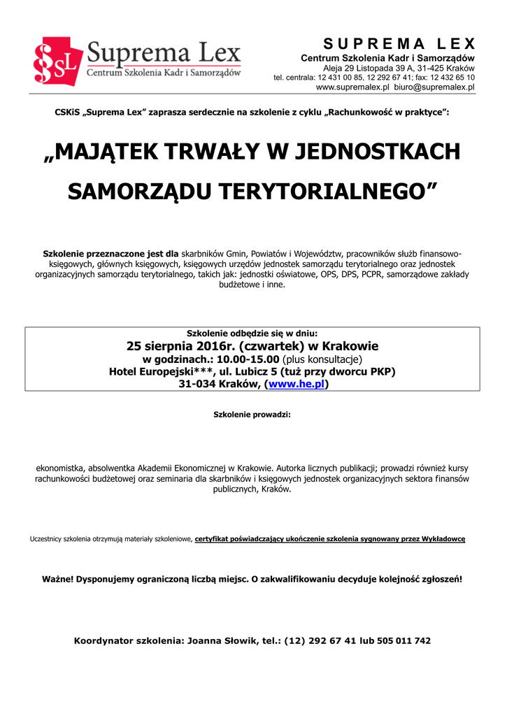 SUPREMA LEX Centrum Szkolenia Kadr i Samorządów Aleja 29 Listopada 39 A, 31-425 Kraków tel. centrala: 12 431 00 85, 12 292 67 41; fax: 12 432 65 10 www.supremalex.pl [email protected] CSKiS „Suprema Lex” zaprasza serdecznie na szkolenie z cyklu „Rachunkowość w praktyce”: „MAJĄTEK TRWAŁY W JEDNOSTKACH SAMORZĄDU TERYTORIALNEGO” Szkolenie przeznaczone jest dla skarbników Gmin, Powiatów i Województw, pracowników służb finansowoksięgowych, głównych księgowych, księgowych urzędów jednostek samorządu terytorialnego oraz jednostek organizacyjnych samorządu terytorialnego, takich jak: jednostki oświatowe, OPS, DPS, PCPR, samorządowe zakłady budżetowe i inne. Szkolenie odbędzie się w dniu: 25 sierpnia 2016r. (czwartek) w Krakowie w godzinach.: 10.00-15.00 (plus konsultacje) Hotel Europejski***, ul. Lubicz 5 (tuż przy dworcu PKP) 31-034 Kraków, (www.he.pl) Szkolenie prowadzi: ekonomistka, absolwentka Akademii Ekonomicznej w Krakowie. Autorka licznych publikacji; prowadzi również kursy rachunkowości budżetowej oraz seminaria dla skarbników i księgowych jednostek organizacyjnych sektora finansów publicznych, Kraków. Uczestnicy szkolenia otrzymują materiały szkoleniowe, certyfikat poświadczający ukończenie szkolenia sygnowany przez Wykładowcę Ważne! Dysponujemy ograniczoną liczbą miejsc. O zakwalifikowaniu decyduje kolejność zgłoszeń! Koordynator szkolenia: Joanna Słowik, tel.: (12) 292 67 41 lub 505 011 742 SUPREMA LEX Centrum Szkolenia Kadr i Samorządów Aleja 29 Listopada 39 A, 31-425 Kraków tel. centrala: 12 431 00 85, 12 292 67 41; fax: 12 432 65 10 www.supremalex.pl [email protected] Program szkolenia: „Majątek trwały w jednostkach samorządu terytorialnego” 25.08.2016r. godz.10.00-15.00, Hotel Europejski*** w Krakowie 10.00 Powitanie, omówienie harmonogramu, rozpoczęcie szkolenia (ok.13.00- Obiad) 10.00-15.00 1. Podstawy prawne dotyczące zakresu działalności inwestycyjnej w j.s.t. 2. Definicja środków trwałych w j.s.t. 3. Rzeczowe aktywa trwałe (środki trwałe, pozostałe środki trwałe, zbiory biblioteczne). 4. Wartości niematerialne i prawne. 5. Długoterminowe aktywa finansowe. 6. Środki trwałe w budowie: - koszty inwestycji, - ewidencja analityczna, - rozliczenie inwestycji i przyjęcie środków trwałych do użytkowania. 7. Inwentaryzacja majątku trwałego. 8. Ewidencja księgowa inwestycji w zakładzie budżetowym: - z dotacji, - z przychodów własnych. 9. Ewidencja inwestycji dochodami gromadzonymi przez jednostki budżetowe na podstawie art. 223 ustawy o finansach publicznych. 10. Ulepszenia i remonty środków trwałych. 11. Umorzenie i amortyzacja środków trwałych. 12. Ewidencja i likwidacja środków trwałych oraz wartości niematerialnych i prawnych. 13. Najczęściej występujące nieprawidłowości przy ewidencji majątku trwałego. 15.00 Podsumowanie szkolenia, wręczenie certyfikatów i zakończenie szkolenia Od 15.00 Odpowiedzi na pytania i konsultacje indywidualne z Wykładowcą CAŁOŚCIOWY KOSZT SZKOLENIA WYNOSI: 360,00zł OD OSOBY. CENA OBEJMUJE: - materiały szkoleniowe i ćwiczeniowe, lancz, serwis kawowy - certyfikat poświadczający ukończenie szkolenia sygnowany przez Wykładowcę Dojazd we własnym zakresie Koordynator szkolenia: Joanna Słowik, tel.: (12) 292 67 41 lub 505 011 742 SUPREMA LEX Centrum Szkolenia Kadr i Samorządów Aleja 29 Listopada 39 A, 31-425 Kraków tel. centrala: 12 431 00 85, 12 292 67 41; fax: 12 432 65 10 www.supremalex.pl [email protected] ......................................... dnia KARTA ZGŁOSZENIA UCZESTNICTWA W SZKOLENIU NAZWA FORMY DOSKONALENIA: „Majątek trwały w jednostkach samorządu terytorialnego” TERMIN I MIEJSCE: 25.08.2016r. Hotel Europejski*** 31-034 Kraków, ul. Lubicz 5 (www.he.pl) L.p. Imię i nazwisko (dane prosimy wpisywać drukowanymi literami) Funkcja ADRES E-MAIL:……………………………...............................TELEFON KONTAKTOWY …………………….........................…. FAKTURĘ VAT PROSZĘ WYSTAWIĆ NA:…………....................................……………………………......................……..……… ADRES:……………………………………………..............................…… NIP:............…..….…...….................................………. Wyrażam zgodę na przetwarzanie moich danych osobowych przez Studio Profilaktyki Społecznej oraz Suprema Lex CSKiS, dla potrzeb zgłoszonego szkolenia, zgodnie z ustawą z dnia 29 sierpnia 1997 r. o ochronie danych osobowych (Dz. U. z 1997 r. Nr 133, poz. .883). Wyrażam zgodę na otrzymywanie informacji o szkoleniach i usługach firmy Studio Profilaktyki Społecznej oraz Suprema Lex CSKiS w rozumieniu ust. z dnia 18 lipca 2002r. o świadczeniu usług drogą elektroniczną na adres e-mail. Dane nie będą przekazywane podmiotom trzecim.JS ……….……….….……..……………………..................………………… Pieczęć i podpis zgłaszającego się oraz Instytucji zgłaszającej Oświadczam, iż środki wydatkowane na w/w szkolenie pochodzą w co najmniej 70% ze środków publicznych w rozumieniu ustawy o finansach publicznych. …….………………………..................……………………………………. Pieczęć i podpis zgłaszającego się oraz Instytucji zgłaszającej Całkowity koszt szkolenia wynosi 360,00zł od osoby Cena obejmuje: wykłady połączone z konsultacjami, materiały szkoleniowe, lancz, serwis kawowy Kartę zgłoszenia prosimy przesłać faksem: tel./fax: 12 431 00 85 lub fax: 12 432 65 10 do dnia 12.08.2016r. Wysłanie formularza zgłoszeniowego jest równoznaczne z zakwalifikowaniem do udziału w szkoleniu Uwaga! Dysponujemy ograniczoną liczbą miejsc. O zakwalifikowaniu decyduje kolejność zgłoszeń. Należność za udział w szkoleniu należy przesłać po otrzymaniu faktury VAT w terminie 7 dni na konto: „Suprema Lex” Centrum Sz