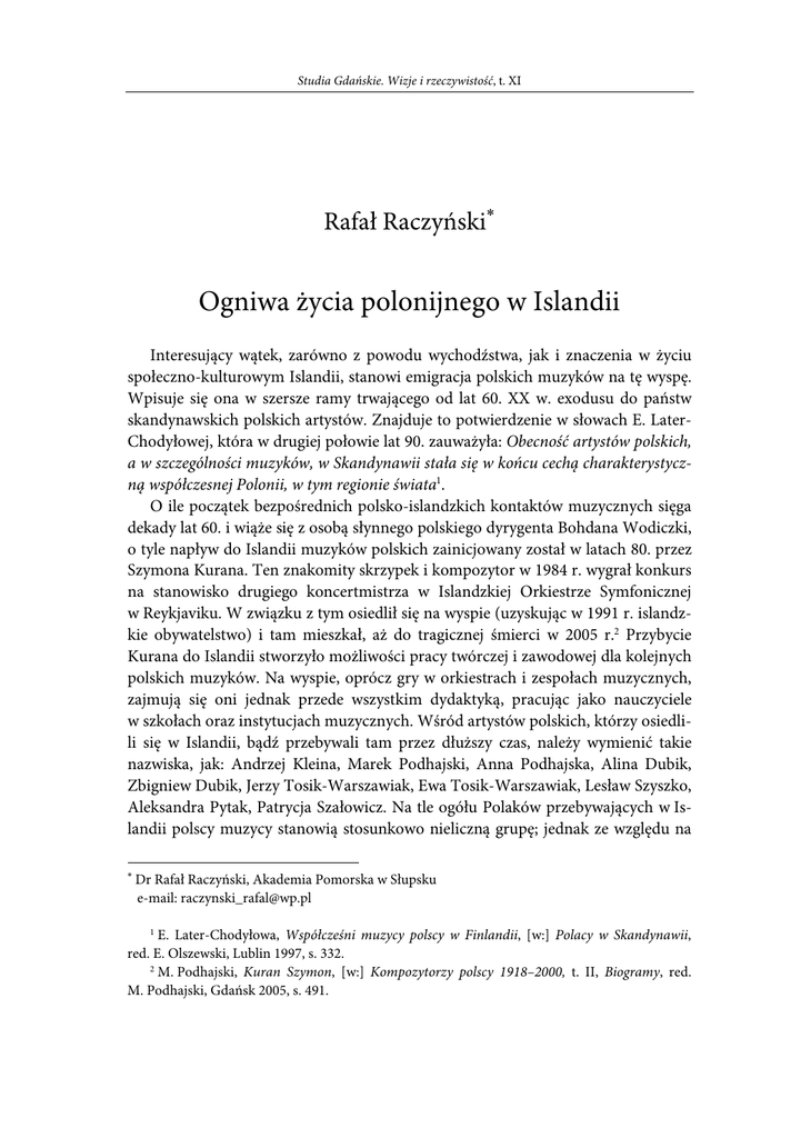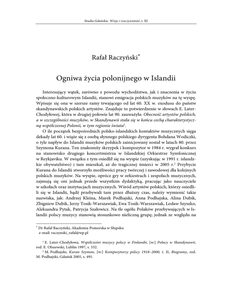 Studia Gdańskie. Wizje i rzeczywistość, t. XI Rafał Raczyński∗ Ogniwa życia polonijnego w Islandii Interesujący wątek, zarówno z powodu wychodźstwa, jak i znaczenia w życiu społeczno-kulturowym Islandii, stanowi emigracja polskich muzyków na tę wyspę. Wpisuje się ona w szersze ramy trwającego od lat 60. XX w. exodusu do państw skandynawskich polskich artystów. Znajduje to potwierdzenie w słowach E. LaterChodyłowej, która w drugiej połowie lat 90. zauważyła: Obecność artystów polskich, a w szczególności muzyków, w Skandynawii stała się w końcu cechą charakterystyczną współczesnej Polonii, w tym regionie świata1. O ile początek bezpośrednich polsko-islandzkich kontaktów muzycznych sięga dekady lat 60. i wiąże się z osobą słynnego polskiego dyrygenta Bohdana Wodiczki, o tyle napływ do Islandii muzyków polskich zainicjowany został w latach 80. przez Szymona Kurana. Ten znakomity skrzypek i kompozytor w 1984 r. wygrał konkurs na stanowisko drugiego koncertmistrza w Islandzkiej Orkiestrze Symfonicznej w Reykjaviku. W związku z tym osiedlił się na wyspie (uzyskując w 1991 r. islandzkie obywatelstwo) i tam mieszkał, aż do tragicznej śmierci w 2005 r.2 Przybycie Kurana do Islandii stworzyło możliwości pracy twórczej i zawodowej dla kolejnych polskich muzyków. Na wyspie, oprócz gry w orkiestrach i zespołach muzycznych, zajmują się oni jednak przede wszystkim dydaktyką, pracując jako nauczyciele w szkołach oraz instytucjach muzycznych. Wśród artystów polskich, którzy osiedlili się w Islandii, bądź przebywali tam przez dłuższy czas, należy wymienić takie nazwiska, jak: Andrzej Kleina, Marek Podhajski, Anna Podhajska, Alina Dubik, Zbigniew Dubik, Jerzy Tosik-Warszawiak, Ewa Tosik-Warszawiak, Lesław Szyszko, Aleksandra Pytak, Patrycja Szałowicz. Na tle ogółu Polaków przebywających w Islandii polscy muzycy stanowią stosunkowo nieliczną grupę; jednak ze względu na ∗ Dr Rafał Raczyński, Akademia Pomorska w Słupsku e-mail: [email protected] 1 E. Later-Chodyłowa, Współcześni muzycy polscy w Finlandii, [w:] Polacy w Skandynawii, red. E. Olszewski, Lublin 1997, s. 332. 2 M. Podhajski, Kuran Szymon, [w:] Kompozytorzy polscy 1918–2000, t. II, Biogramy, red. M. Podhajski, Gdańsk 2005, s. 491. Rafał Raczyński duży prestiż społeczny, jakim cieszą się w społeczeństwie islandzkim, zajmują oni ważne miejsce wśród islandzkiej Polonii. Choć rozwój zbiorowości polonijnej w Islandii determinowany był przede wszystkim czynnikami ekonomicznymi oraz – w znacznie mniejszym stopniu – osobistymi i poznawczymi, to w historii polskiego wychodźstwa do Islandii istnieje również epizod w postaci emigracji politycznej związanej z obywatelami polskimi, którzy po wprowadzeniu stanu wojennego znaleźli się na terytorium Austrii i postanowili nie wracać do kraju. Władze Austrii, nieprzygotowane na przyjęcie większej liczby polskich uciekinierów politycznych, zwróciły się do Wysokiego Komisarza ONZ ds. Uchodźców z prośbą o pozyskanie innych państw gotowych udzielić Polakom prawa azylu. Jednym z pierwszych krajów (oprócz Australii, Szwajcarii, Nowej Zelandii, Luksemburga i Holandii), który odpowiedział na ten apel, była Republika Islandii3. W ten sposób, dzięki zaangażowaniu islandzkiego Czerwonego Krzyża, 28.05.1982 r. na wyspę dotarła grupa 23 polskich uchodźców z obozu przejściowego w Traiskirchen4. Władze Islandii w początkowym okresie pobytu Polaków objęły ich wsparciem, zapewniając tymczasowe zakwaterowania, pomagając w znalezieniu pracy, a także oferując bezpłatny kurs języka islandzkiego prowadzony przez mówiącego po polsku prof. Jona R. Gunnarssona. Po upływie trzymiesięcznego okresu aklimatyzacji (w czasie którego polscy uchodźcy otrzymywali pomoc ze strony władz Islandii) azylanci stopniowo zaczęli opuszczać jednak wyspę, powracając do Polski, bądź obierając inne państwa jako miejsca osiedlenia. Już w 1983 r. z całej grupy pozostały w Islandii tylko cztery osoby. Podjęta przez tamtejszy rząd próba przygarnięcia i asymilacji polskich uciekinierów politycznych, podobnie jak wcześniej uchodźców z Węgier i Wietnamu, okazała się zatem niepowodzeniem. Ostatecznie na wyspie osiadła jedynie rodzina Klonowskich5. Pan Irek Klonowski pracuje obecnie w Instytucie Przemysłu Spożywczego jako inżynier, zaś jego żona Eva Elvira Klonowski, światowej sławy antropolog sądowy, od 1996 r. zajmuje się ekshumacją i identyfikacją ofiar masowych mordów dokonanych w latach 1992–1995 przez Serbów na bośniackich muzułmanach. Za swą pracę została m.in. odznaczona przez prezydenta Kwaśniewskiego Krzyżem Oficerskim Orderu Zasługi, zaś władze Bośni nadały jej honorowe obywatelstwo6. Specyficzne miejsce w ukształtowanej w Islandii zbiorowości polonijnej zajmują polskie siostry zakonne z Zakonu Mniszek Karmelitanek Bosych, które przejęły po holenderskich zakonnicach, położony niedaleko Reykjaviku, klasztor w Hafnarfjordur – obecnie Klasztor Niepokalanej Pani Jasnogórskiej i Św. Józefa. W 1984 r., 3 Ilu Polaków ma szanse na azyl polityczny, „Życie Warszawy” 1982, nr 84, s. 6. Jedną z osób witających przybyłych Polaków na lotnisku był Dariusz Sobczyński. 5 Wywiad przeprowadzony przez autora z Irkiem Klonowskim w Reykjaviku 4.02.2012 r. (w zbiorach autora). 6 D. Kornafel, Doctor Eva Elvira Klonowski awarded the Officer’s Cross of the Order of Merit of the Republic of Poland, „Anthropological Review” 2002, vol. 65, s. 105–106. 4 198 Ogniwa życia polonijnego w Islandii z inicjatywy ówczesnego biskupa Islandii Hendrika Huberta Frehena, udała się tam szesnastoosobowa grupa Karmelitanek Bosych z Elbląga. Następnie, wskutek zwiększenia liczby powołań, do Islandii stopniowo przybywały kolejne polskie mniszki. Z czasem było ich tyle, iż część mogła opuścić wyspę i przenieść się do karmelita