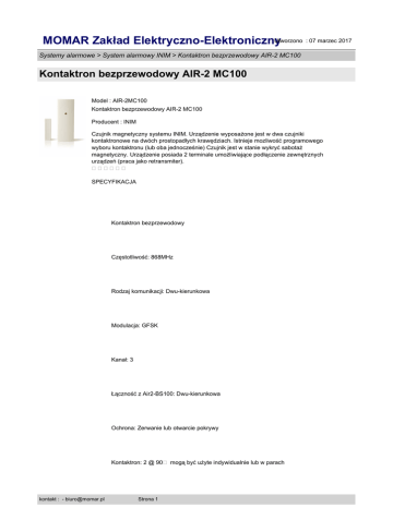 Utworzono : 07 marzec 2017 MOMAR Zakład Elektryczno-Elektroniczny Systemy alarmowe > System alarmowy INIM > Kontaktron bezprzewodowy AIR-2 MC100 Kontaktron bezprzewodowy AIR-2 MC100 Model : AIR-2MC100 Kontaktron bezprzewodowy AIR-2 MC100 Producent : INIM Czujnik magnetyczny systemu INIM. Urządzenie wyposażone jest w dwa czujniki kontaktronowe na dwóch prostopadłych krawędziach. Istnieje mozliwość programowego wyboru kontaktronu (lub oba jednocześnie) Czujnik jest w stanie wykryć sabotaż magnetyczny. Urządzenie posiada 2 terminale umożliwiające podłączenie zewnętrznych urządzeń (praca jako retransmiter). ������ SPECYFIKACJA Kontaktron bezprzewodowy Częstotliwość: 868MHz Rodzaj komunikacji: Dwu-kierunkowa Modulacja: GFSK Kanał: 3 Łączność z Air2-BS100: Dwu-kierunkowa Ochrona: Zerwanie lub otwarcie pokrywy Kontaktron: 2 @ 90� mogą być użyte indywidualnie lub w parach kontakt : - [email protected] Strona 1 Utworzono : 07 marzec 2017 MOMAR Zakład Elektryczno-Elektroniczny Systemy alarmowe > System alarmowy INIM > Kontaktron bezprzewodowy AIR-2 MC100 Kontaktron bezprzewodowy AIR-2 MC100 Terminale: 2 konfigurowalne indywidualnie jako wejście lub wyjście Parametryzacja terminali: NO, NC, pojedynczy parametr, podwójny parametr Zarządzanie detektorem wstrząsu i rolet: Tak, w obu terminalach Kanały sygnału alarmowego: Sygnalizacja alarmowa oddzielnie dla kontaktronu, pierwszego terminalu i drugiego terminalu Kolory: Biały i brązowy Bateria: CR123A Żywotność baterii: 4 lata Wymiary: 95x36x26mm Waga: 130g Cena : 214,02 zł Brutto ( 174,00 zł Netto) kontakt : - [email protected] Strona 2 Utworzono : 07 marzec 2017 MOMAR Zakład Elektryczno-Elektroniczny Systemy alarmowe > System alarmowy INIM > Kontaktron bezprzewodowy AIR-2 MC100 Kontaktron bezprzewodowy AIR-2 MC100 Dostępność: Produkt dostępny w naszym sklepie od 07 marzec 2012 kontakt : - [email protected] Strona 3