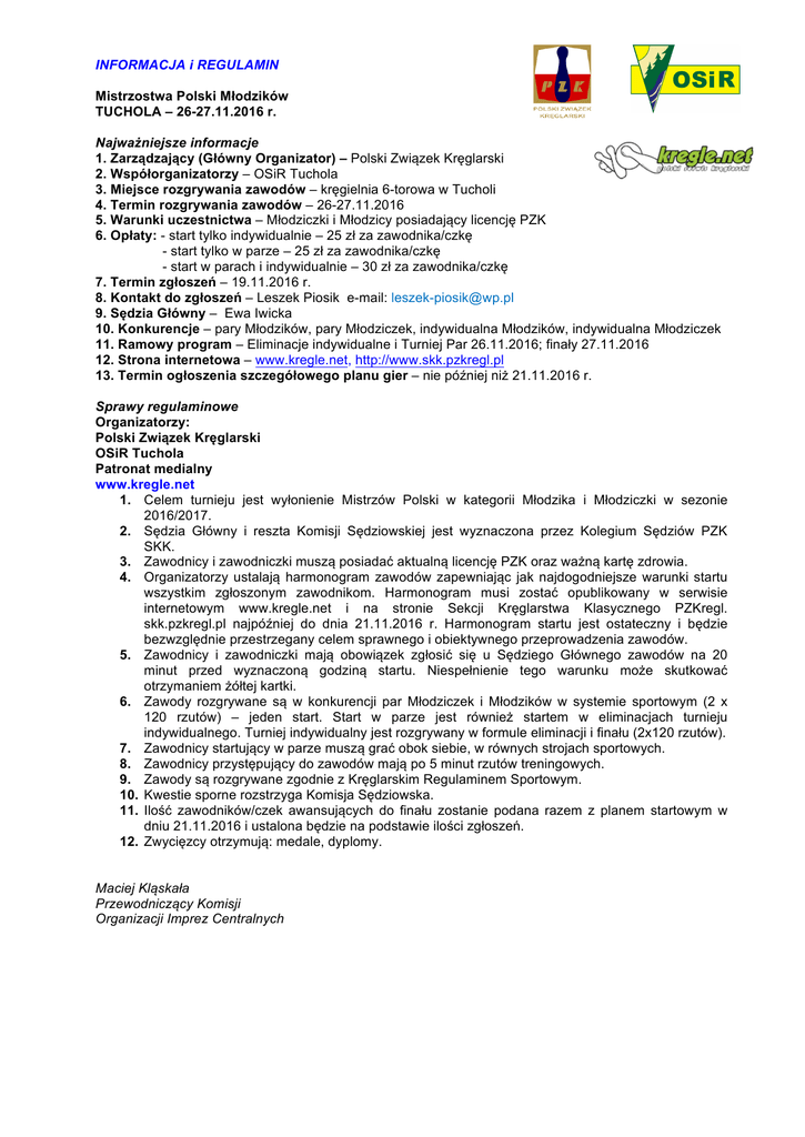 INFORMACJA i REGULAMIN Mistrzostwa Polski Młodzików TUCHOLA – 26-27.11.2016 r. Najważniejsze informacje 1. Zarządzający (Główny Organizator) – Polski Związek Kręglarski 2. Współorganizatorzy – OSiR Tuchola 3. Miejsce rozgrywania zawodów – kręgielnia 6-torowa w Tucholi 4. Termin rozgrywania zawodów – 26-27.11.2016 5. Warunki uczestnictwa – Młodziczki i Młodzicy posiadający licencję PZK 6. Opłaty: - start tylko indywidualnie – 25 zł za zawodnika/czkę - start tylko w parze – 25 zł za zawodnika/czkę - start w parach i indywidualnie – 30 zł za zawodnika/czkę 7. Termin zgłoszeń – 19.11.2016 r. 8. Kontakt do zgłoszeń – Leszek Piosik e-mail: [email protected] 9. Sędzia Główny – Ewa Iwicka 10. Konkurencje – pary Młodzików, pary Młodziczek, indywidualna Młodzików, indywidualna Młodziczek 11. Ramowy program – Eliminacje indywidualne i Turniej Par 26.11.2016; finały 27.11.2016 12. Strona internetowa – www.kregle.net, http://www.skk.pzkregl.pl 13. Termin ogłoszenia szczegółowego planu gier – nie później niż 21.11.2016 r. Sprawy regulaminowe Organizatorzy: Polski Związek Kręglarski OSiR Tuchola Patronat medialny www.kregle.net 1. Celem turnieju jest wyłonienie Mistrzów Polski w kategorii Młodzika i Młodziczki w sezonie 2016/2017. 2. Sędzia Główny i reszta Komisji Sędziowskiej jest wyznaczona przez Kolegium Sędziów PZK SKK. 3. Zawodnicy i zawodniczki muszą posiadać aktualną licencję PZK oraz ważną kartę zdrowia. 4. Organizatorzy ustalają harmonogram zawodów zapewniając jak najdogodniejsze warunki startu wszystkim zgłoszonym zawodnikom. Harmonogram musi zostać opublikowany w serwisie internetowym www.kregle.net i na stronie Sekcji Kręglarstwa Klasycznego PZKregl. skk.pzkregl.pl najpóźniej do dnia 21.11.2016 r. Harmonogram startu jest ostateczny i będzie bezwzględnie przestrzegany celem sprawnego i obiektywnego przeprowadzenia zawodów. 5. Zawodnicy i zawodniczki mają obowiązek zgłosić się u Sędziego Głównego zawodów na 20 minut przed wyznaczoną godziną startu. Niespełnienie tego warunku może skutkować otrzymaniem żółtej kartki. 6. Zawody rozgrywane są w konkurencji par Młodziczek i Młodzików w systemie sportowym (2 x 120 rzutów) – jeden start. Start w parze jest również startem w eliminacjach turnieju indywidualnego. Turniej indywidualny jest rozgrywany w formule eliminacji i finału (2x120 rzutów). 7. Zawodnicy startujący w parze muszą grać obok siebie, w równych strojach sportowych. 8. Zawodnicy przystępujący do zawodów mają po 5 minut rzutów treningowych. 9. Zawody są rozgrywane zgodnie z Kręglarskim Regulaminem Sportowym. 10. Kwestie sporne rozstrzyga Komisja Sędziowska. 11. Ilość zawodników/czek awansujących do finału zostanie podana razem z planem startowym w dniu 21.11.2016 i ustalona będzie na podstawie ilości zgłoszeń. 12. Zwycięzcy otrzymują: medale, dyplomy. Maciej Kląskała Przewodniczący Komisji Organizacji Imprez Centralnych