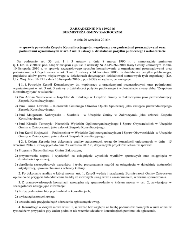 ZARZĄDZENIE NR 129/2016 BURMISTRZA GMINY ZAKROCZYM z dnia 20 września 2016 r. w sprawie powołania Zespołu Konsultacyjnego ds. współpracy z organizacjami pozarządowymi oraz podmiotami wymienionymi w art. 3 ust. 3 ustawy o działalności pożytku publicznego i wolontariacie Na podstawie art. 33 ust. 1 i 3 ustawy z dnia 8 marca 1990 r. o samorządzie gminnym (j. t. Dz. U. z 2016r. poz. 446) w związku z §4 ust. 2 uchwały Nr XLIV/262/2010 Rady Gminy Zakroczym z dnia 10 listopada 2010 r. w sprawie szczegółowego sposobu konsultowania z organizacjami pozarządowymi oraz podmiotami, o których mowa w art. 3 ust. 3 ustawy z 24 kwietnia 2003r. o działalności pożytku publicznego, projektów aktów prawa miejscowego w dziedzinach dotyczących działalności statutowych tych organizacji (Dz. Urz. Woj. Maz. Nr 221 z dnia 10 listopada 2010r., poz.7638) zarządzam, co następuje: § 1. 1. Powołuję Zespół Konsultacyjny ds. współpracy z organizacjami pozarządowymi oraz podmiotami wymienionymi w art. 3 ust. 3 ustawy o działalności pożytku publicznego i wolontariacie zwany dalej "Zespołem Konsultacyjnym" w składzie: 1) Pan Adrian Wiśniewski – Inspektor ds. Edukacji w Urzędzie Gminy w Zakroczymiu jako przewodniczący Zespołu Konsultacyjnego; 2) Pani Anna Lewicka – Kierownik Gminnego Ośrodka Opieki Społecznej jako zastępca przewodniczącego Zespołu Konsultacyjnego; 3) Pani Małgorzata Kobrzyńska - Skarbnik Konsultacyjnego; w Urzędzie Gminy w Zakroczymiu jako członek Zespołu 4) Pani Klaudia Tomczyk– Naczelnik Wydziału Ogólnoorganizacyjnego i Spraw Obywatelskich w Urzędzie Gminy w Zakroczymiu jako członek Zespołu Konsultacyjnego; 5) Pan Kamil Krajewski - Podinspektor w Wydziale Ogólnoorganizacyjnym i Spraw Obywatelskich w Urzędzie Gminy w Zakroczymiu jako członek Zespołu Konsultacyjnego. § 2. 1. Celem Zespołu jest dokonanie analizy zgłoszonych uwag do konsultacji ogłoszonych w dniu września 2016 r. i trwających do dnia 23 września 2016 r., dotyczących projektów uchwał w sprawie: 15 1) Programu Stypendialnego Gminy Zakroczym; 2) przyznawania nagród i wyróżnień za osiągnięcie wysokich wyników sportowych oraz osiągnięcia w działalności sportowej; 3) określenia szczegółowych warunków i trybu przyznawania nagród za osiągnięcia w dziedzinie twórczości artystycznej, upowszechniania i ochrony kultury. 2. Po dokonaniu analizy o której mowa ust. 1, Zespół wydaje i przekazuje Burmistrzowi Gminy Zakroczym opinie co do przyjęcia lub odrzucenia każdej ze złożonych uwag wraz z uzasadnieniem, w formie sprawozdania. 3. Z przeprowadzonych konsultacji sporządza się sprawozdanie o którym mowa w ust. 2, zawierające w szczególności następujące informacje: 1) liczbę podmiotów biorących udział w konsultacjach; 2) wykaz zgłoszonych uwag; 3) uzasadnienie przyjęcia bądź odrzucenia zgłoszonych uwag. 4. Konsultacje o których mowa w ust. 1, są ważne bez względu na liczbę podmiotów biorących w nich udział w tym także w przypadku gdy żaden podmiot nie weźmie udziału w konsultacjach pomimo ich ogłoszenia. § 3. Wykonanie Zarządzenia powierza się Przewodniczącemu Zespołu Konsultacyjnego. § 4. Zarządzenie wchodzi w życie z dniem podpisania. Burmistrz /-/ Artur Ciecierski