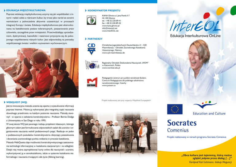 EDUKACJA MIĘDZYKULTUROWA Poprzez edukację międzykulturową uczymy się jak współdziałać z innymi i radzić sobie z różnicami kultur, by trwać jako naród ze swoimi wartościami a jednocześnie aktywnie uczestniczyć w procesach integracji Europy i świata. Edukacja międzykulturowa jest ukierunkowana na kształtowanie postaw tolerancyjnych, poszanowanie praw człowieka, szczególnie praw mniejszości. Przeciwdziałając uprzedze- KOORDYNATOR PROJEKTU KANA Gliwice ul. Jana Pawła II 7 44-100 Gliwice tel. +48 32 230-89-41 fax +48 32 230-89-42 www.kana.gliwice.pl [email protected] www.InterEOL.net niom, dyskryminacji, ksenofobii i rasizmowi przyczynia się do pokojowego współistnienia różnych kultur. Jest odpowiedzią na potrzeby współczesnego świata i wielkim wyzwaniem wychowawczym. PARTNERZY Edukacja Interkulturowa OnLine Christliches Jugenddorfwerk Deutschlands e.V. - CJD Maximiliansau - Ośrodek Zawodowego Kształcenia Ustawicznego, Niemcy www.cjd-maximiliansau.de Regionalny Ośrodek Doskonalenia Nauczycieli „WOM” w Katowicach, Polska www.womkat.edu.pl Pedagogické centrum pro polské národnosti školstvi, Centrum Pedagogiczne dla polskiego szkolnictwa narodowościowego, Czechy www.pctesin.cz WEBQUEST (WQ) Projekt realizowany jest przy wsparciu Wspólnot Europejskich Jest to innowacyjna metoda uczenia się oparta o wyszukiwanie informacji poprzez Internet. Można ją wykorzystać jako integralną część nauczania dowolnego przedmiotu na każdym poziomie nauczania. Metodę stworzył - w oparciu o założenia konstruktywizmu - Profesor Bernie Dodge z Uniwersytetu w San Diego w roku 1995. W swej istocie WQ jest pewnego rodzaju projektem klasowym, którego głównym celem jest formułowanie odpowiednich zadań dla uczniów i organizowanie nauczania wokół podstawowych pojęć. Realizuje on jeden z podstawowych postulatów konstruktywizmu dotyczący poszukiwania i doceniania uczniowskiego punktu widzenia w procesie kształcenia. Projekt realizowany w ramach programu Socrates Comenius Metoda WebQuestu daje możliwości konstruktywistycznego zastosowania technologii informacyjnej w kształceniu stacjonarnym i na odległość. Dzięki niej można zaprojektować kursy online dla nauczycieli i uczniów, wykorzystywać ją w samokształceniu, także w systemie kształcenia nieformalnego i nauczaniu trwającym całe życie (lifelong learning). „Obca kultura jest tajemnicą, którą można zgłębić jedynie przez dialog […]” Kardynał Karl Lehmann, biskup Moguncji PRODUKTY INFORMACJE O PROJEKCIE ZADANIA PROJEKTU Projekt InterEOL jest realizowany w ramach Projekt składa się z czterech głównych zadań, zawierających elementy programu Socrates Comenius 2.1. w dziedzinie produkcji, ewaluacji, upowszechniania, edukacji międzykulturowej. online: e-learningu i komunikacji ������������ ����������� ������� • organizacja konferencji; CEL PROJEKTU • opracowanie programu kursu i materiałów szkoleniowych; Ideą i celem 3-letniego projektu InterEOL; Edukacja Interkulturowa • szkolenie nauczycieli; OnLine jest przygotowanie nauczycieli i uczniów z regionów Polski, • przeprowadzenie standaryzacji WebQuestów i zorganizowanie Czech i Niemiec do dialogu i współdziałania w kształtowaniu Europy różnych kultur. Cel ten będzie realizowany poprzez budowanie i trans- konkursów dla uczniów. Rezultatami projektu będą: fer wiedzy o regionach partnerskich przy wykorzystaniu technologii • program kursu i materiały szkoleniowe; informacyjnej oraz nowych metod pedagogicznych, w tym Metody • kilkuset przeszkolonych nauczycieli; WebQuest • kilkaset opracowań uczniowskich; Poprzez realizację projektu InterEOL, objęci nim nauczyciele i uczniowie powinni: • dostrzegać wkład przedstawicieli różnych grup etnicznych, wyznaniowych, narodowościowych w różne sfery życia społecznego; • internetowa baza danych z multimedialnymi pomocami dydaktycznymi. 1. nauczyciele i uczniowie szkół uczestniczących w projekcie (w tym szkoły z których część osób pochodzi ze środowisk mniejszościo- ganiu ludzi innych kultur oraz potrzebę wiedzy i bezpośrednich wych, uczniowie niepełnosprawni i zagrożeni wykluczeniem z regio- kontaktów w ich przezwyciężaniu; nów partnerskich); dowania i prezentacji zdobytej wiedzy i doświadczeń; • współtworzyć międzynarodową multimedialną bazę pomocy dydaktycznych wspomagających dialog międzykulturowy. �� BENEFICJENCI PROJEKTU InterEOL • uświadamiać sobie istnienie uprzedzeń, stereotypów w postrze- • wykorzystywać WebQuesty i opracowania mutimedialne do bu- � ������� ���� ������ ����� ������ ���� ����� � ���� ��� ��� ��� ����� ���� ���� ��� ��� ���� � 2. instytucje i organizacje szkolące nauczycieli z krajów partnerskich; 3. placówki i uczelnie wyższe kształcące nauczycieli z krajów partnerskich; 4. samorządy lokalne i regionalne z krajów partnerskich. �� ��� � KONKURSY Uczniowie szkół partnerskich mają możliwość uczestniczenia w konkursach narodowych. Najlepsze prace uczniów - prezentacje i materiały multimedialne - wezmą udział w konkursie międzynarodowym. Edukacja Interkulturowa OnLine