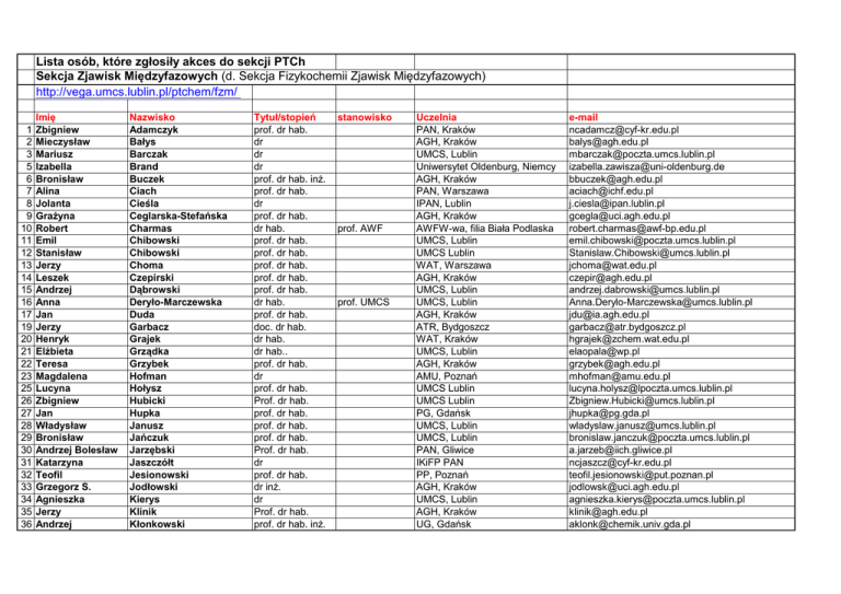 Lista osób, które zgłosiły akces do sekcji PTCh Sekcja Zjawisk Międzyfazowych (d. Sekcja Fizykochemii Zjawisk Międzyfazowych) http://vega.umcs.lublin.pl/ptchem/fzm/ 1 2 3 5 6 7 8 9 10 11 12 13 14 15 16 17 19 20 21 22 23 25 26 27 28 29 30 31 32 33 34 35 36 Imię Zbigniew Mieczysław Mariusz Izabella Bronisław Alina Jolanta Grażyna Robert Emil Stanisław Jerzy Leszek Andrzej Anna Jan Jerzy Henryk Elżbieta Teresa Magdalena Lucyna Zbigniew Jan Władysław Bronisław Andrzej Bolesław Katarzyna Teofil Grzegorz S. Agnieszka Jerzy Andrzej Nazwisko Adamczyk Bałys Barczak Brand Buczek Ciach Cieśla Ceglarska-Stefańska Charmas Chibowski Chibowski Choma Czepirski Dąbrowski Deryło-Marczewska Duda Garbacz Grajek Grządka Grzybek Hofman Hołysz Hubicki Hupka Janusz Jańczuk Jarzębski Jaszczółt Jesionowski Jodłowski Kierys Klinik Kłonkowski Tytuł/stopień prof. dr hab. dr dr dr prof. dr hab. inż. prof. dr hab. dr prof. dr hab. dr hab. prof. dr hab. prof. dr hab. prof. dr hab. prof. dr hab. prof. dr hab. dr hab. prof. dr hab. doc. dr hab. dr hab. dr hab.. prof. dr hab. dr prof. dr hab. Prof. dr hab. prof. dr hab. prof. dr hab. prof. dr hab. Prof. dr hab. dr prof. dr hab. dr inż. dr Prof. dr hab. prof. dr hab. inż. stanowisko prof. AWF prof. UMCS Uczelnia PAN, Kraków AGH, Kraków UMCS, Lublin Uniwersytet Oldenburg, Niemcy AGH, Kraków PAN, Warszawa IPAN, Lublin AGH, Kraków AWFW-wa, filia Biała Podlaska UMCS, Lublin UMCS Lublin WAT, Warszawa AGH, Kraków UMCS, Lublin UMCS, Lublin AGH, Kraków ATR, Bydgoszcz WAT, Kraków UMCS, Lublin AGH, Kraków AMU, Poznań UMCS Lublin UMCS Lublin PG, Gdańsk UMCS, Lublin UMCS, Lublin PAN, Gliwice IKiFP PAN PP, Poznań AGH, Kraków UMCS, Lublin AGH, Kraków UG, Gdańsk e-mail [email protected] [email protected] [email protected] [email protected] [email protected] [email protected] [email protected] [email protected] [email protected] [email protected] [email protected] [email protected] [email protected] [email protected] [email protected] [email protected] [email protected] [email protected] [email protected] [email protected] [email protected] [email protected] [email protected] [email protected] [email protected] [email protected] [email protected] [email protected] [email protected] [email protected] [email protected] [email protected] [email protected] 37 38 39 40 41 42 43 44 45 46 47 48 49 50 51 52 53 54 56 57 58 59 60 61 62 63 64 65 66 67 68 69 70 71 72 73 74 75 76 Ewa Marek Joanna Roman Marek Irena Kazimierz Adam Janina Jolanta Adam Paweł Ewelina Tomasz Tadeusz Zenon Wojciech Przemysław Wojciech Marta Stanisław Michał Władysław Jacek Zygmunt Małgorzata Ewa Piotr Dariusz Krzysztof Kazimierz Paweł Katarzyna Marta Małgorzata Konrad Andrzej Adam Kazimiera Anna Komorowska-Czepirska Kosmulski Krawczyk Leboda Majdan Malinowska Małysa Marczewski Milewska-Duda Narkiewicz-Michałek Nodzeński Nowak Ortyl Pańczyk Paryjczak Pawlak Płaziński Podkościelny Pudło Repelewicz Romanowski Rozwadowski Rudziński Rynkowski Sadowski Serwadczak Skwarek Staszczuk Sternik Stolarczyk Sykut Szabelski Szymczyk Szymula Śliwińska-Bartkowiak Terpiłowski Świątkowski Voelkel Wilk dr prof. dr hab. dr prof. dr hab. prof. dr hab. dr hab. prof. dr hab. dr hab. prof. dr hab. inż. dr hab. dr hab. dr hab. dr inż. dr hab. prof. dr hab. prof. dr hab. dr hab.. dr dr inż. dr prof. dr hab. prof. dr hab. prof. dr hab. prof. dr hab. prof. dr hab. dr inż. dr prof. dr hab. dr dr prof. dr hab. dr hab. dr dr hab. prof. dr hab. dr prof. dr hab. prof. dr hab. prof. dr hab. AGH, Kraków PL, Lublin UMCS, Lublin UMCS, Lublin UMCS, Lublin prof. UMCS UMCS, Lublin PAN, Kraków UMCS, Lublin AGH, Kraków prof. UMCS UMCS, Lublin AGH, Kraków prof. IKFiP PAN PAN, Kraków PW, Wrocław prof. IKFiP PAN UMCS, Lublin PŁ, Łódź ATR Bydgoszcz prof.. IKFiP IKFiP PAN UMCS Lublin Politechnika Sląska, WSP Kielce UŁ, Łódź UMK, Toruń UMCS, Lublin PŁ, Łódź PW, Wrocław PW, Wrocław UMCS, Lublin UMCS, Lublin UMCS Lublin UW, Warszawa UMCS, Lublin prof. UMCS UMCS Lublin UMCS Lublin UMCS, Lublin UAM, Poznań UMCS, Lublin WAT, Warszawa PP, Poznań PWr [email protected] [email protected] [email protected] [email protected] [email protected] [email protected] [email protected] [email protected] [email protected] [email protected] [email protected] [email protected] [email protected] [email protected] [email protected] [email protected] [email protected] [email protected] [email protected]. [email protected] [email protected] [email protected] [email protected] [email protected] [email protected] [email protected] [email protected] [email protected] [email protected] [email protected] [email protected] [email protected] [email protected] [email protected] [email protected] [email protected] [email protected] [email protected] 77 78 79 80 81 82 83 84 85 86 87 88 Małgorzata Zygfryd Małgorzata Krzysztof Marta Wiesław Katarzyna Anna Janusz Mieczysław Małgorzata Agnieszka Wiśniewska Witkiewicz Witko Woliński Wójcik Wójcik Zarębska Zdziennicka Ziętkiewicz Żyła Sęczkowska Chrzanowska dr hab. prof. dr hab. prof. dr hab. prof. dr hab. dr inż prof. dr hab. dr dr hab. dr prof. dr hab. mgr mgr prof.. UMCS prof.. UMCS UMCS, Lublin WAT, Warszawa IKiFP PAN UMCS, Lublin AGH, Kraków UMCS, Lublin AGH Kraków UMCS, Lublin AGH, Kraków AGH, Kraków UMCS, Lublin UMCS, Lublin [email protected] [email protected] [email protected] [email protected] [email protected] [email protected] [email protected] [email protected] [email protected] [email protected] [email protected]