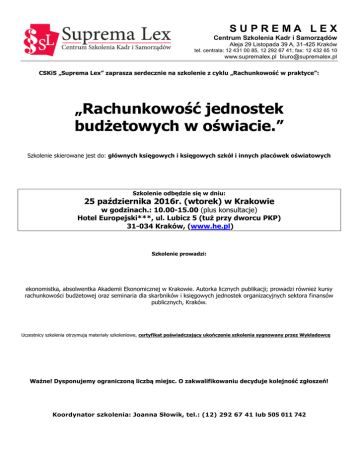 SUPREMA LEX Centrum Szkolenia Kadr i Samorządów Aleja 29 Listopada 39 A, 31-425 Kraków tel. centrala: 12 431 00 85, 12 292 67 41; fax: 12 432 65 10 www.supremalex.pl [email protected] CSKiS „Suprema Lex” zaprasza serdecznie na szkolenie z cyklu „Rachunkowość w praktyce”: „Rachunkowość jednostek budżetowych w oświacie.” Szkolenie skierowane jest do: głównych księgowych i księgowych szkół i innych placówek oświatowych Szkolenie odbędzie się w dniu: 25 października 2016r. (wtorek) w Krakowie w godzinach.: 10.00-15.00 (plus konsultacje) Hotel Europejski***, ul. Lubicz 5 (tuż przy dworcu PKP) 31-034 Kraków, (www.he.pl) Szkolenie prowadzi: ekonomistka, absolwentka Akademii Ekonomicznej w Krakowie. Autorka licznych publikacji; prowadzi również kursy rachunkowości budżetowej oraz seminaria dla skarbników i księgowych jednostek organizacyjnych sektora finansów publicznych, Kraków. Uczestnicy szkolenia otrzymują materiały szkoleniowe, certyfikat poświadczający ukończenie szkolenia sygnowany przez Wykładowcę Ważne! Dysponujemy ograniczoną liczbą miejsc. O zakwalifikowaniu decyduje kolejność zgłoszeń! Koordynator szkolenia: Joanna Słowik, tel.: (12) 292 67 41 lub 505 011 742 SUPREMA LEX Centrum Szkolenia Kadr i Samorządów Aleja 29 Listopada 39 A, 31-425 Kraków tel. centrala: 12 431 00 85, 12 292 67 41; fax: 12 432 65 10 www.supremalex.pl [email protected] Program szkolenia: „Rachunkowość jednostek budżetowych w oświacie.” 25.10.2016r. godz.10.00-15.00, Hotel Europejski*** w Krakowie 10.00 Powitanie, omówienie harmonogramu, rozpoczęcie szkolenia (ok.13.00- Obiad) 10.00-15.00: Na szkoleniu zostaną poruszone m. in. następujące zagadnienia: 1. Jednostka budżetowa i podstawowe zasady gospodarki finansowej. 2. Funkcjonowanie wydzielonego rachunku dochodów zgodnie z art. 223 ustawy o finansach publicznych, plan dochodów i wydatków, dokonywanie zmian. 3. Wspólna obsługa administracyjna, finansowa i księgowa jednostek nowe rozwiązanie – rola centrów usług wspólnych. 4. Zmiany w ustawie o finansach publicznych oraz w ustawie o rachunkowości. 5. Zmiany w ustawach o systemie oświaty i innych ustawach w związku z możliwością organizowania wspólnej obsługi. 6. Odpowiedzialność i uprawnienia kierownika jednostki obsługiwanej oraz jednostki obsługującej. 7. Ewidencja księgowa wydatków ponoszonych na edukację dzieci i młodzieży wymagających stosowania specjalnej organizacji nauki i metod pracy (rozdziały 80149 i 80150). 8. Sprawozdawczość budżetowa, w tym m. in. sprawozdania: Rb-27S, Rb-28S, Rb-34S. 9. Sprawozdawczość w zakresie operacji finansowych (Rb-N, Rb-Z, Rb-UZ). 15.00 Podsumowanie szkolenia, wręczenie certyfikatów i zakończenie szkolenia Od 15.00 Odpowiedzi na pytania i konsultacje indywidualne z Wykładowcą CAŁOŚCIOWY KOSZT SZKOLENIA WYNOSI: 360,00zł OD OSOBY. CENA OBEJMUJE: - materiały szkoleniowe i ćwiczeniowe, lancz, serwis kawowy - certyfikat poświadczający ukończenie szkolenia sygnowany przez Wykładowcę Dojazd we własnym zakresie Koordynator szkolenia: Joanna Słowik, tel.: (12) 292 67 41 lub 505 011 742 SUPREMA LEX Centrum Szkolenia Kadr i Samorządów Aleja 29 Listopada 39 A, 31-425 Kraków tel. centrala: 12 431 00 85, 12 292 67 41; fax: 12 432 65 10 www.supremalex.pl [email protected] ......................................... dnia KARTA ZGŁOSZENIA UCZESTNICTWA W SZKOLENIU NAZWA FORMY DOSKONALENIA: „Rachunkowość jednostek budżetowych w oświacie.” TERMIN I MIEJSCE: 25.10.2016r. Hotel Europejski*** 31-034 Kraków, ul. Lubicz 5 (www.he.pl) L.p. Imię i nazwisko (dane prosimy wpisywać drukowanymi literami) Funkcja ADRES E-MAIL:……………………………...............................TELEFON KONTAKTOWY …………………….........................…. FAKTURĘ VAT PROSZĘ WYSTAWIĆ NA:…………....................................……………………………......................……..……… ADRES:……………………………………………..............................…… NIP:............…..….…...….................................………. Wyrażam zgodę na przetwarzanie moich danych osobowych przez Studio Profilaktyki Społecznej oraz Suprema Lex CSKiS, dla potrzeb zgłoszonego szkolenia, zgodnie z ustawą z dnia 29 sierpnia 1997 r. o ochronie danych osobowych (Dz. U. z 1997 r. Nr 133, poz. .883). Wyrażam zgodę na otrzymywanie informacji o szkoleniach i usługach firmy Studio Profilaktyki Społecznej oraz Suprema Lex CSKiS w rozumieniu ust. z dnia 18 lipca 2002r. o świadczeniu usług drogą elektroniczną na adres e-mail. Dane nie będą przekazywane podmiotom trzecim.JS ……….……….….……..……………………..................………………… Pieczęć i podpis zgłaszającego się oraz Instytucji zgłaszającej Oświadczam, iż środki wydatkowane na w/w szkolenie pochodzą w co najmniej 70% ze środków publicznych w rozumieniu ustawy o finansach publicznych. …….………………………..................……………………………………. Pieczęć i podpis zgłaszającego się oraz Instytucji zgłaszającej Całkowity koszt szkolenia wynosi 360,00zł od osoby Cena obejmuje: wykłady połączone z konsultacjami, materiały szkoleniowe, lancz, serwis kawowy Kartę zgłoszenia prosimy przesłać faksem: tel./fax: 12 431 00 85 lub fax: 12 432 65 10 do dnia 14.10.2016r. Wysłanie formularza zgłoszeniowego jest równoznaczne z zakwalifikowaniem do udziału w szkoleniu Uwaga! Dysponujemy ograniczoną liczbą miejsc. O zakwalifikowaniu decyduje kolejność zgłoszeń. Należność za udział w szkoleniu należy przesłać po otrzymaniu faktury VAT w terminie 7 dni na konto: „Suprema Lex” Centrum Szkolenia Kadr i Samorządów BNP Paribas Bank Polska S. A. II O/ Kraków, nr rachunku: 70 1600 1198 0002 0022 2799 4151 Ważne! W przypadku rezygnacji ze szkolenia w formie pisemnej (faksem) po