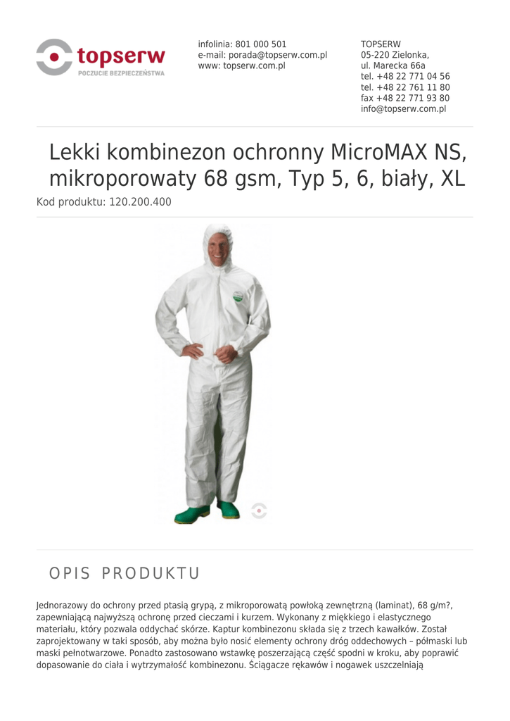 infolinia: 801 000 501 e-mail: [email protected] www: topserw.com.pl TOPSERW 05-220 Zielonka, ul. Marecka 66a tel. +48 22 771 04 56 tel. +48 22 761 11 80 fax +48 22 771 93 80 [email protected] Lekki kombinezon ochronny MicroMAX NS, mikroporowaty 68 gsm, Typ 5, 6, biały, XL Kod produktu: 120.200.400 OPIS PRODUKTU Jednorazowy do ochrony przed ptasią grypą, z mikroporowatą powłoką zewnętrzną (laminat), 68 g/m?, zapewniającą najwyższą ochronę przed cieczami i kurzem. Wykonany z miękkiego i elastycznego materiału, który pozwala oddychać skórze. Kaptur kombinezonu składa się z trzech kawałków. Został zaprojektowany w taki sposób, aby można było nosić elementy ochrony dróg oddechowych – półmaski lub maski pełnotwarzowe. Ponadto zastosowano wstawkę poszerzającą część spodni w kroku, aby poprawić dopasowanie do ciała i wytrzymałość kombinezonu. Ściągacze rękawów i nogawek uszczelniają kombinezon. Suwak na całej długości kombinezonu, chroniony zakrywającą go patką, ułatwia wkładanie i zdejmowanie. Unikalne właściwości tkaniny gwarantują bardzo dobrą rozciągliwość oraz wytrzymałość kombinezonu. Antyelektrostatyczny, chroni przed skażeniem promieniotwórczym. Stosowany do ochrony przed ochlapaniem mało niebezpiecznymi cieczami i zabrudzeniem. Powszechnie używany przy malowaniu z użyciem rozpylacza (możliwość wielokrotnego użycia) oraz w warunkach laboratoryjnych. Doskonale sprawdza się przy usuwaniu włókien azbestowych, ich transporcie i przeładunku a także przetwórstwie spożywczym i rolnictwie. Rozmiar XL, typ 5, 6, normy EN1149, EN1073/2. DANE TECHNICZNE Rozmiar XL Typ 5,6 Normy EN340:2002, EN13034:2005, EN13984:2004, EN1149-1:2005, EN1073:2002 Szwy Szyte CERTYFIKATY POWIĄZANE Produkt Rozmiar Typ Szwy Lekki kombinezon ochronny MicroMAX NS, mikroporowaty 68 gsm, Typ 5, 6, biały, S S 5,6 Szyte Lekki kombinezon ochronny MicroMAX NS, mikroporowaty 68 gsm, Typ 5, 6, biały, M M 5,6 Szyte Lekki kombinezon ochronny MicroMAX NS, mikroporowaty 68 gsm, Typ 5, 6, biały, L L 5,6 Szyte Lekki kombinezon ochronny MicroMAX NS, mikroporowaty 68 gsm, Typ 5, 6, biały, XL XL 5,6 Szyte Lekki kombinezon ochronny MicroMAX NS, mikroporowaty 68 gsm, Typ 5, 6, biały, XXL XXL 5,6 Szyte Lekki kombinezon ochronny MicroMAX NS, mikroporowaty 68 gsm, Typ 5, 6, biały, XXXL XXXL 5,6 Spajane