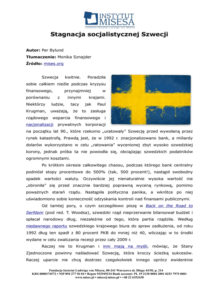 Stagnacja socjalistycznej Szwecji Autor: Per Bylund Tłumaczenie: Monika Sznajder Źródło: mises.org Szwecja kwitnie. Poradziła sobie całkiem nieźle podczas kryzysu finansowego, porównaniu przynajmniej z innymi Niektórzy ludzie, tacy Krugman, uważają, rządowego wsparcia nacjonalizacji że w krajami. jak to Paul zasługa finansowego prywatnych i korporacji na początku lat 90., które rzekomo „uratowały” Szwecję przed wywołaną przez rynek katastrofą. Prawdą jest, że w 1992 r. znacjonalizowano bank, a miliardy dolarów wykorzystano w celu „ratowania” wycenionej zbyt wysoko szwedzkiej korony, jednak próba ta nie powiodła się, obciążając szwedzkich podatników ogromnymi kosztami. Po krótkim okresie całkowitego chaosu, podczas którego bank centralny podniósł stopy procentowe do 500% (tak, 500 procent!), nastąpił swobodny spadek wartości waluty. Oczywiście jej nienaturalnie wysoka wartość nie „obroniła” się przed znacznie bardziej poprawną wyceną rynkową, pomimo poważnych starań rządu. Nastąpiła polityczna panika, a wkrótce po niej uświadomiono sobie konieczność odzyskania kontroli nad finansami publicznymi. Od tamtej pory, o czym szczegółowo piszę w Back on the Road to Serfdom (pod red. T. Woodsa), szwedzki rząd nieprzerwanie bilansował budżet i spłacał narodowy dług, niezależnie od tego, która partia rządziła. Według niedawnego raportu szwedzkiego krajowego biura do spraw zadłużenia, od roku 1992 dług ten spadł z 80 procent PKB do mniej niż 40, wliczając w to środki wydane w celu zwalczania recesji przez cały 2009 r. Raczej nie to Krugman i inni mają na myśli, mówiąc, że Stany Zjednoczone powinny naśladować Szwecję, która kroczy ścieżką sukcesów. Raczej uparcie nie chcą dostrzec czegokolwiek innego oprócz ewidentnie Fundacja Instytut Ludwiga von Misesa, 00-241 Warszawa ul. Długa 44/50, p. 214 KRS 0000174572 ▪ NIP 894 277 56 04 ▪ Regon 932949234 Bank account: PL 19 2130 0004 2001 0253 7975 0001 www.mises.pl ▪ [email protected] ▪ +48 22 6352438 niepomyślnych kroków podjętych zanim Szwecja została zmuszona pójść inną, lepszą drogą. Krugman nie jest jedyną osobą wierzącą w wielki szwedzki mit, jakoby kraj ten był przykładem udanego, socjalistycznego eksperymentu. Szwedzi i inni też w niego wierzą. Ludzie często chcą się ze mną spotkać tylko po to, aby mi powiedzieć, jak wspaniały jest mój kraj i opowiedzieć mi o tym, jak to ponoć wszystko jest „za darmo”. Często zastanawiam się, o czym oni mówią i kto podał im te zwariowane informacje, które uznawane są za prawdziwe. Krugman powinien wiedzieć lepiej, ale tak nie jest. Być może w obliczu kryzysu Szwecja jest dokładnie tym rodzajem „wyśnionego mitu”, którego szukali keynesiści. Jakby nie było, budowa szwedzkiego dobrobytu w dwudziestym wieku bardzo przypomina marzenie Keynesa: sztuczny, nieprzerwanie podsycany boom — automatycznie napędzany i ratowany wiele razy przez niewiarygodnie sprzyjające okoliczności. Po okresie „ekstremalnie” wolnego handlu w drugiej połowie dziewiętnastego wieku nastąpiło utworzenie i rozbudowanie państwa dobrobytu. Brak udziału w którejkolwiek wojnie światowej z pewnością pomógł, a wspieranie rozwoju państwa nie stanowiło finansowego problemu w latach 60. — istniał wtedy nieograniczony dostęp do zasobów, które można było skonfiskować i „inwestować” w rzekomo świetne systemy inżynierii społecznej. Choć socjalistyczne reformy zakończyły się w latach 70., to sam mit „szwedzkiego modelu” przetrwał. Międzynarodowy kryzys związany z ropą naftową zmusił szwedzki rząd do czystego keynesizmu, a waluta w przeciągu dekady została zdewaluowana w sposób szybki i na szeroką skalę. Kolejne „szczęśliwe lata 80.” nie zaoferowały żadnego rozwiązania dla kraju pogrążonego w bankructwie, który finansowo implodował we wczesnych latach 90., po tym jak rynki międzynarodowe doszły do siebie po boomie w sektorze nieruchomości. Wtedy właśnie rząd był gospodarczo zmuszony obniżyć wydatki i narzucić limity na świadczenia oferowane przez liczne systemy opieki społecznej. Istnieje jednak jeszcze inna prawda na temat szwedzkiej gospodarki, którą niedawno ujawniono. Istnieją dowody na to, że Szwecja, nawet w kategoriach oficjalnych danych statystycznych, nie jest takim super krajem i w rzeczywistości nie doświadczyła żadnego ekonomicznego wzrostu (przynajmniej w sferze pracy, która siłą rzeczy powinna cieszyć się zainteresowaniem Fundacja Instytut Ludwiga von Misesa, 00-241 Warszawa ul. Długa 44/50, p. 214 KRS 0000174572 ▪ NIP 894 277 56 04 ▪ Regon 932949234 Bank account: PL 19 2130 0004 2001 0253 7975 0001 www.mises.pl ▪ [email protected] ▪ +48 22 6352438 keynesistów) przez ponad pół wieku. W artykule (niestety dostępnym tylko po szwedzku) opublikowanym w czasopiśmie „Ekonomisk Debatt” w 2009 r. ekonomiści Bjuggren i Jahansson z Ratio Institute ukazali smutną prawdę. Opierając się na danych rządowej agencji statystycznej (chodzi o centralne biuro statystyczne Statistics Sweden — przyp. red.) oraz przy zastosowaniu nowego systemu klasyfikowania własności, odkryli, że nie stworzono żadnych miejsc pracy w prywatnym sektorze od 1950 r. Tak, zgadza się: nie było żadnego wzrostu netto w ilości miejsc pracy w sektorze prywatnym w Szwecji przez okres 55 lat. Innymi słowy, po pięciu latach od zakończenia drugiej wojny światowej szwedzka gospodarka całkowicie zamarła. Osoby wierzące w szwedzki mit prawdopodobnie zechcą zaatakować system klasyfikacji zastosowany przez Bjuggrena i Johanssona, ale jest on oparty na międzynarodowym standardzie zapewniającym lepszy wgląd w sektory publiczne i prywatne poprzez identyfikację posiadacza własności, a nie typu zarządzania czy oficjalnego statusu. Innymi słowy, klasyfikacja użyta przez wspomnianych ekonomistów pokazuje 