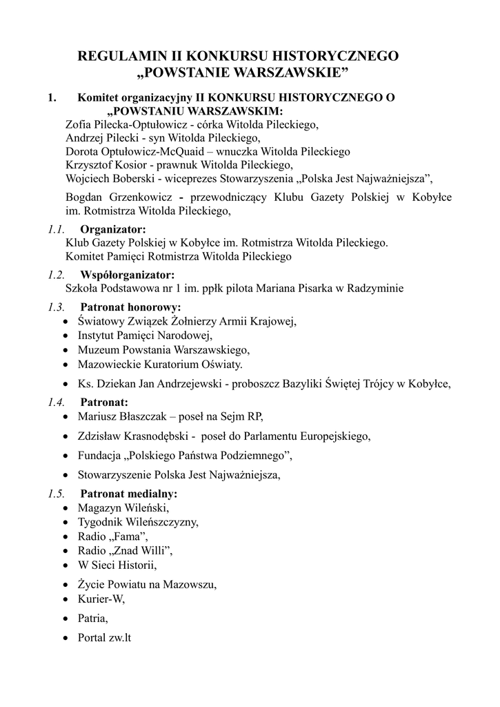 REGULAMIN II KONKURSU HISTORYCZNEGO „POWSTANIE WARSZAWSKIE” 1. Komitet organizacyjny II KONKURSU HISTORYCZNEGO O „POWSTANIU WARSZAWSKIM: Zofia Pilecka-Optułowicz - córka Witolda Pileckiego, Andrzej Pilecki - syn Witolda Pileckiego, Dorota Optułowicz-McQuaid – wnuczka Witolda Pileckiego Krzysztof Kosior - prawnuk Witolda Pileckiego, Wojciech Boberski - wiceprezes Stowarzyszenia „Polska Jest Najważniejsza”, Bogdan Grzenkowicz - przewodniczący Klubu Gazety Polskiej w Kobyłce im. Rotmistrza Witolda Pileckiego, 1.1. Organizator: Klub Gazety Polskiej w Kobyłce im. Rotmistrza Witolda Pileckiego. Komitet Pamięci Rotmistrza Witolda Pileckiego 1.2. Współorganizator: Szkoła Podstawowa nr 1 im. ppłk pilota Mariana Pisarka w Radzyminie 1.3. Patronat honorowy: Światowy Związek Żołnierzy Armii Krajowej, Instytut Pamięci Narodowej, Muzeum Powstania Warszawskiego, Mazowieckie Kuratorium Oświaty. Ks. Dziekan Jan Andrzejewski - proboszcz Bazyliki Świętej Trójcy w Kobyłce, 1.4. Patronat: Mariusz Błaszczak – poseł na Sejm RP, Zdzisław Krasnodębski - poseł do Parlamentu Europejskiego, Fundacja „Polskiego Państwa Podziemnego”, Stowarzyszenie Polska Jest Najważniejsza, 1.5. Patronat medialny: Magazyn Wileński, Tygodnik Wileńszczyzny, Radio „Fama”, Radio „Znad Willi”, W Sieci Historii, Życie Powiatu na Mazowszu, Kurier-W, Patria, Portal zw.lt 2. Cele konkursu: 2.1 2.2 2.3 Uczczenie 71. rocznicy Powstania Warszawskiego, Budzenie i utrwalanie dumy z dziedzictwa narodowego, Zainteresowanie uczniów historią naszego Narodu, oraz budzenie w nich poczucia dumy z bycia Polakiem, 2.4 Pogłębienie wiedzy historycznej, 2.5 Rozwijanie twórczego myślenia, wyzwalanie wyobraźni, kreatywności, 2.6 Doskonalenie umiejętności samodzielnego poszukiwania, gromadzenia i selekcjonowania informacji w różnych źródłach, 2.7 Propagowanie wiedzy o przyczynach, przebiegu i skutkach Powstania Warszawskiego 2.8 Upowszechnianie wiedzy historycznej istotnej dla tożsamości narodowej, regionalnej oraz kształtowania postaw obywatelskich i patriotycznych, 2.9 Promowanie młodych twórców do doskonalenia umiejętności plastycznych, 2.10 Popularyzowanie poezji o tematyce patriotycznej, 2.11 Rozwijanie wrażliwości na słowo poetyckie o tematyce patriotycznej. 3. Termin nadsyłania prac: Rozpoczęcie konkursu: 10 września 2015 r. Zakończenie konkursu: 30 października 2015 r 4. Uczestnicy: Uczniowie szkół podstawowych kl. I-III Uczniowie szkół podstawowych kl. IV-VI Uczniowie szkół gimnazjalnych kl. I- III Uczniowie szkół ponad gimnazjalnych Uczniowie szkół średnich (Wileńszczyzna) kl. I-III Uczniowie szkół średnich (Wileńszczyzna) kl. IV-VI Uczniowie szkół średnich (Wileńszczyzna) kl. VII- IX Uczniowie szkół średnich (Wileńszczyzna) kl. X-XII Uczniowie Parafii Najświętszego Odkupiciela kl. I-III Uczniowie Parafii Najświętszego Odkupiciela kl. IV-VI Uczniowie Parafii Najświętszego Odkupiciela kl. VII-IX Uczniowie Parafii Najświętszego Odkupiciela kl. X-XI 5. Forma Konkursu: Dla uczniów szkół podstawowych kl. I-III, oraz szkół (Wileńszczyzna), Parafii z Grodna kl. I-III, średnich ………………………………………………………… Dla uczniów szkół podstawowych kl. IV-VI, oraz szkół średnich (Wileńszczyzna), Parafii z Grodna kl. IV-VI, ………………………………………………………… Dla uczniów szkół gimnazjalnych kl. I-III, (Wileńszczyzna), Parafii z Grodna kl. VII-IX, oraz szkół średnich ………………………………………………………… Dla uczniów szkół ponad gimnazjalnych, oraz szkół średnich (Wileńszczyzna) kl. X-XII, Parafii z Grodna kl. X-XI, ………………………………………………………… 6. Tematy prac konkursowych: Przedmiotem Konkursu jest przygotowanie pracy plastycznych na temat Powstania Warszawskiego. Tematem pracy poezji, pracy pisemnej może być postać wybranego dowódcy, żołnierza. Praca może również dotyczyć wybranego wydarzenia: bitwy, konspiracji, zagadnieniom technicznym lub społecznym związanym z ich działalnością. Poezja „Powstanie Warszawskie”. 6.1 Kategoria szkoły podstawowe kl. I-III, szkoły średnie z Wileńszczyzny i Grodzieńszczyzny kl. I-III: praca plastyczna „Powstanie Warszawskie”, 6.2 Kategoria szkoły podstawowej kl. IV-VI, szkoły średnie z Wileńszczyzny i Grodzieńszczyzny kl. IV-VI: praca plastyczna „ Młodzi Powstańcy w oczach dzieci”, 6.3 Kategoria szkoły gimnazjalne kl. I-III, szkoły średnie z Wileńszczyzny i Grodzieńszczyzny kl. VII-IX, poezja ”Powstanie Warszawskie”, praca pisemna „Dzieci w Powstaniu Warszawskim” Praca pisemna poświęcona Najmłodszym Bohaterom, zadania, służba najmłodszych Powstańców, Harcerska Poczta Polowa, Szare Szeregi. Wielkość pracy pisemnej minimum 4 strony w formacie A4 (czcionka komputerowa Times New Roman 12, akapit 1.5 wiersza). 6.4 Kategoria szkoły ponad gimnazjalne, szkoły średnie z Wileńszczyzny kl. X-XII i Grodzieńszczyzny kl. X-XI: poezja „ Powstanie Warszawskie”, projekt graficzny plakatu „71 rocznica Powstania Warszawskiego”, 7. Kryteria oceniania: 7.1 Poprawność merytoryczna - zgodność treści z prawdą historyczną o Powstaniu 7.2 7.3 7.4 7.5 7.6 7.7 Warszawskim, Oryginalność ujęcia tematu , Poprawność językowa , Estetyka pracy, Autorem pracy może być tylko jeden uczeń pracujący samodzielnie lub pod kierunkiem nauczyciela/opiekuna, Plagiaty oraz skopiowane grafiki nie będą oceniane, W pracy plastycznej organizator nie stawia żadnych ograniczeń w użytej technice plastycznej i wybranych środkach wyrazu, technika wykonania : rysunek, kredka, malarstwo, collage, grafika warsztatu, akwarela. 7.8 W kategorii plakat – zgodność z zasadami projektowania plakatu. 8. Parametry prac konkursowych: 8.1 8.2 8.3 8.4 8.5 Pod tytułem pracy należy napisać, czy praca była samodzielna, czy pod ki