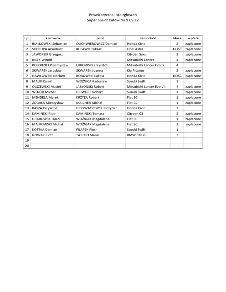 Prowizoryczna lista zgłoszeń Super Sprint Katowicki 9.09.12 l.p. kierowca pilot samochód klasa wpłata 1 BIAŁKOWSKI Sebastian OLICHWIEROWICZ Damian Honda Civic 2 zapłacone 2 SKORUPA Arkadiusz KULAWIK Łukasz Opel Astra GOŚĆ zapłacone 3 JAWORSKI Grzegorz Citroen Saxo 2 zapłacone 4 BIŁEK Witold Mitsubishi Lancer 4 zapłacone 5 KOŁODZIEJ Przemysław LUKOWSKI Krzysztof Mitsubishi Lancer Evo IX 4 6 SKWAREK Jarosław SKWAREK Joanna Kia Picanto 2 zapłacone 7 GAWŁOWSKI Norbert BOROWSKI Łukasz Honda Civic GOŚĆ zapłacone 8 MALIK Kamil WOŹNICA Radosław Suzuki Swift 1 9 OLSZEWSKI Maciej JABŁOŃSKI Robert Mitsubishi Lancer Evo VIII 4 zapłacone 10 WÓJCIK Michał DEJWORE Robert Suzuki Swift 1 zapłacone 11 MENDELA Marek KRZYŻA Robert Fiat SC 1 zapłacone 12 ŻOGAŁA Mieczysław MAICHER Michał Fiat CC 1 zapłacone 13 KASZA Krzysztof GRZYWACZEWSKI Bożydar Honda Civic 2 14 KAMIŃSKI Piotr KAMIŃSKI Tomasz Citroen C2 2 zapłacone 15 GRABOWSKI Karol WOŹNIAK Magdalena Fiat SC 1 zapłacone 16 MAŁKOWSKI Michał WOŹNIAK Magdalena Fiat SC 1 zapłacone 17 KOSTKA Damian FILAPEK Piotr Suzuki Swift 1 18 NOWAK Piotr TATTOO Mario BMW 318 is 3 19 20