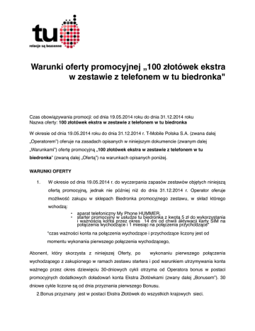 ! ! ! Warunki oferty promocyjnej „100 złotówek ekstra w zestawie z telefonem w tu biedronka"" ! ! ! ! ! ! Czas obowiązywania promocji: od dnia 19.05.2014 roku do dnia 31.12.2014 roku! Nazwa oferty: 100 złotówek ekstra w zestawie z telefonem w tu biedronka" ! W okresie od dnia 19.05.2014 roku do dnia 31.12.2014 r. T-Mobile Polska S.A. (zwana dalej „Operatorem”) oferuje na zasadach opisanych w niniejszym dokumencie (zwanym dalej „Warunkami”) ofertę promocyjną „100 złotówek ekstra w zestawie z telefonem w tu biedronka” (zwaną dalej „Ofertą”) na warunkach opisanych poniżej.! ! WARUNKI OFERTY" ! 1. W okresie od dnia 19.05.2014 r. do wyczerpania zapasów zestawów objętych niniejszą ofertą promocyjną, jednak nie później niż do dnia 31.12.2014 r. Operator oferuje możliwość zakupu w sklepach Biedronka promocyjnego zestawu, w skład którego wchodzą:! • • aparat telefoniczny My Phone HUMMER,! starter promocyjny w usłudze tu biedronka z kwotą 5 zł do wykorzystania i ważnością konta przez okres 14 dni od chwili aktywacji karty SIM na połączenia wychodzące i 1 miesiąc na połączenia przychodzące*! ! *czas ważności konta na połączenia wychodzące i przychodzące liczony jest od momentu wykonania pierwszego połączenia wychodzącego,! !Abonent, który skorzysta z niniejszej Oferty, po wykonaniu pierwszego połączenia wychodzącego z zakupionego w ramach zestawu startera i pod warunkiem utrzymywania konta ważnego przez okres dziewięciu 30-dniowych cykli otrzyma od Operatora bonus w postaci promocyjnych dodatkowych doładowań konta Ekstra Złotówkami (zwany dalej „Bonusem”). 30 dniowe cykle liczone są od dnia przyznania pierwszego Bonusu.! 2.Bonus przyznany jest w postaci Ekstra Złotówek do wszystkich krajowych sieci.! ! 3.Aktywacja Bonusu następuje po wykonaniu przez Abonenta pierwszego połączenia wychodzącego z karty SIM.! 4.Pierwsze promocyjne doładowanie Bonusem zostanie przyznane Abonentowi w terminie do 72 godzin po wykonaniu pierwszego połączenia.! 5.Kolejne promocyjne doładowania Bonusem będą przyznawane Abonentowi cyklicznie co 30 dni. Warunkiem otrzymania doładowania jest konto ważne na połączenia wychodzące w ciągu całego dnia w którym ma być przyznany Bonus. Jednostki przyznane w ramach Bonusu są ważne przez 30 dni licząc od momentu przyznania Bonusu potwierdzonego SMS-em, po tym okresie przepadają, z uwzględnieniem zapisu w pkt 10.c.! 6.Kolejne promocyjne doładowania Bonusem będą przyznawane w równej kwocie 10 Ekstra Złotówek.! 7.Abonent może otrzymać maksymalnie 10 Bonusów - Abonent w ramach Oferty może otrzymać łącznie maksymalnie 100 Ekstra Złotówek.! 8.Przyznanie doładowania Bonusem zostanie potwierdzone przez Operatora komunikatem SMS.! 9.Brak posiadania konta ważnego na połączenia wychodzące w danym dniu przyznania Bonusu nie spowoduje wykluczenia Abonenta z promocji. Promocyjne doładowanie nie zostanie przyznane w danym cyklu, zostanie przyznane w kolejnym cyklu, w którym konto będzie ważne na połączenia wychodzące w sposób określony powyżej.! 10. Bonus w postaci promocyjnych doładowań, o których mowa w pkt 2 będzie przyznawany na niżej określonych warunkach:! a. Ekstra Złotówki przyznane w ramach niniejszej oferty są rozliczane w pierwszej kolejności przed zgromadzoną na koncie kwotą złotych (PLN), o ile warunki ofert, z których korzysta Abonent nie stanowią inaczej.! b. Ekstra Złotówki można wykorzystać na krajowe połączenia głosowe i wideo do wszystkich sieci komórkowych i stacjonarnych w Polsce, SMS-y i MMS-y. Ekstra Złotówki nie mogą być wykorzystane na Numery premium, Numery usługowe i specjalne, Roaming, pakietową transmisję danych, Przeniesienie połączenia oraz zakup innych ofert dostępnych w tu biedronka. ! ! c. W przypadku posiadania przez Abonenta Ekstra Złotówek przyznanych w ramach innych ofert, środki te sumują się z Ekstra Złotówkami przyznanymi w ramach niniejszej oferty, a termin ważności takiej sumy:! • pozostaje bez zmian, jeśli ważność nowo nabytych Ekstra Złotówek jest krótsza niż tych, które były już zgromadzone na koncie;! • jest naliczana od nowa, zgodnie z datą ważności nowo nabytych Ekstra Złotówek, jeśli data ważności nowo nabytych Ekstra Złotówek jest późniejsza niż tych, które już były zgromadzone na koncie.! 11. Nie ma możliwości rezygnacji z przyznanego Bonusu.! 12. Kwotę pozostałych do wykorzystania Ekstra Złotówek można sprawdzić poprzez wysłanie ekspresowego kodu *101# (po wybraniu opcji 1) ! ! POZOSTAŁE WARUNKI" 13.Korzystając z warunków niniejszej promocji, Abonent nie może używać Karty SIM do: ! 1. maszynowego (ruch typu „maszyna do maszyny” lub „maszyna do użytkownika”) generowania połączeń, w tym wysyłania wiadomości SMS lub MMS, ! 2. przesyłania znacznej liczby informacji o tożsamej lub podobnej treści, przeznaczonych do promowania towarów, usług czy wizerunku! 2.Naruszenie któregokolwiek z zakazów, o których mowa powyżej, stanowi dla Operatora podstawę do rozwiązania umowy o świadczenie usług telekomunikacyjnych ze skutkiem natychmiastowym.! 3.W sprawach nieuregulowanych w niniejszych warunkach, zastosowanie mają postanowienia Regulaminu Świadczenia Usług Telekomunikacyjnych przedpłaconych w tu biedronka, który jest podany do publicznej wiadomości na stronie www.tubiedronka.pl.! 4.Operator zastrzega sobie prawo do odwołania Oferty w każdym czasie bez podawania przyczyn, co nie będzie naruszać praw nabytych Abonenta . ! 5.O każdej zmianie Operator będzie informował poprzez stronę http://www.tubiedronka.pl.! 6.Podane ceny jednostkowe zawierają podatek VAT wyliczony według stawki 23 %. Zgodnie z obowiązującymi przepisami, obowiązek podatkowy w podatku VAT powstaje w chwili sprzedaży kuponu lub innej formy doładowania konta. Stan konta oraz wartość poszczególnych połączeń, SMS-ów i