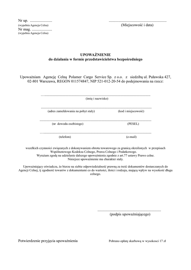 Nr up. ....................... ............................................................ (Miejscowość i data) (wypełnia Agencja Celna) Nr mag. ..................... (wypełnia Agencja Celna) UPOWAŻNIENIE do działania w formie przedstawicielstwa bezpośredniego Upoważniam Agencję Celną Polamer Cargo Service Sp. z o.o. z siedzibą ul. Puławska 427, 02-801 Warszawa, REGON 011574847, NIP 521-012-20-54 do podejmowania na rzecz: ….............................................................................................................. (imię i nazwisko) ................................................................................................................... (adres zameldowania na pobyt stały) (kod i miejscowość) .................................................................................................................... (nr dowodu osobistego) (PESEL) …................................................................................................................ (telefom) (e-mail) wszelkich czynności związanych z dokonywaniem obrotu towarowego za granicą określonych w przepisach Wspólnotowego Kodeksu Celnego, Prawa Celnego i Podatkowego. Wyrażam zgodę na udzielanie dalszego upoważnienia zgodnie z art.77 ustawy Prawo celne. Niniejsze upoważnienie ma charakter stały. Upoważniający oświadcza, że bierze na siebie odpowiedzialność prawną za treść dokumentów dostarczanych do Agencji Celnej, tj zgodność towarów z dokumentami co do wartości, ilości i rodzaju, mającą wpływ na wysokość długu celnego. .................................................................. (podpis upoważniającego) Potwierdzenie przyjęcia upoważnienia Pobrano opłatę skarbową w wysokosci 17 zł