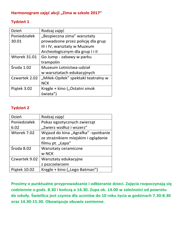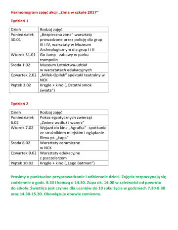 Harmonogram zajęć akcji „Zima w szkole 2017” Tydzień 1 Dzień Poniedziałek 30.01 Rodzaj zajęć „Bezpieczna zima” warsztaty prowadzone przez policję dla grup III i IV, warsztaty w Muzeum Archeologicznym dla grup I i II Wtorek 31.01 Go Jump - zabawy w parku trampolin Środa 1.02 Muzeum Lotnictwa-udział w warsztatach edukacyjnych Czwartek 2.02 „Miłek-Opiłek” spektakl teatralny w NCK Piątek 3.02 Kręgle + kino („Ostatni smok świata”) Tydzień 2 Dzień Poniedziałek 6.02 Wtorek 7.02 Rodzaj zajęć Pokaz egzotycznych zwierząt „Zwierz wzdłuż i wszerz” Wyjazd do kina „Agrafka” -spotkanie ze strażnikiem miejskim i oglądanie filmu pt. „Łapa” Środa 8.02 Warsztaty ceramiczne w NCK Czwartek 9.02 Warsztaty edukacyjne z pszczelarzem Piątek 10.02 Kręgle + kino („Lego Batman”) Prosimy o punktualne przyprowadzanie i odbieranie dzieci. Zajęcia rozpoczynają się codziennie o godz. 8.30 i kończą o 14.30. Zupa ok. 14.00 w zależności od powrotu do szkoły. Świetlica jest czynna dla uczniów do 10 roku życia w godzinach 7.30-8.30 oraz 14.30-15.30. Obowiązuje obuwie zamienne.