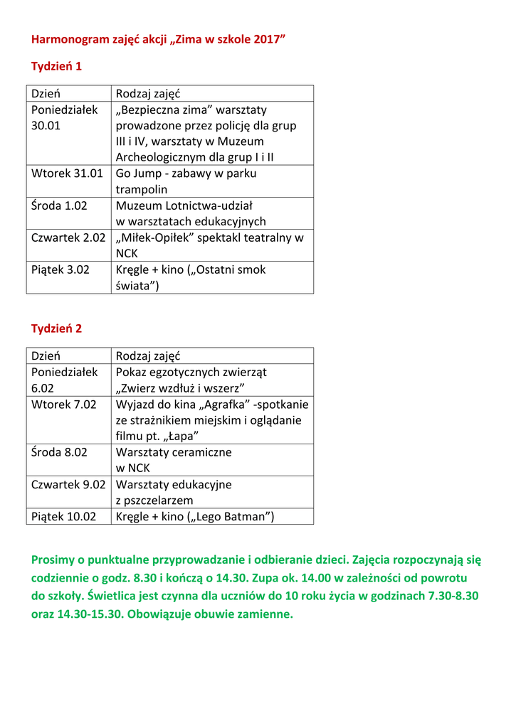 Harmonogram zajęć akcji „Zima w szkole 2017” Tydzień 1 Dzień